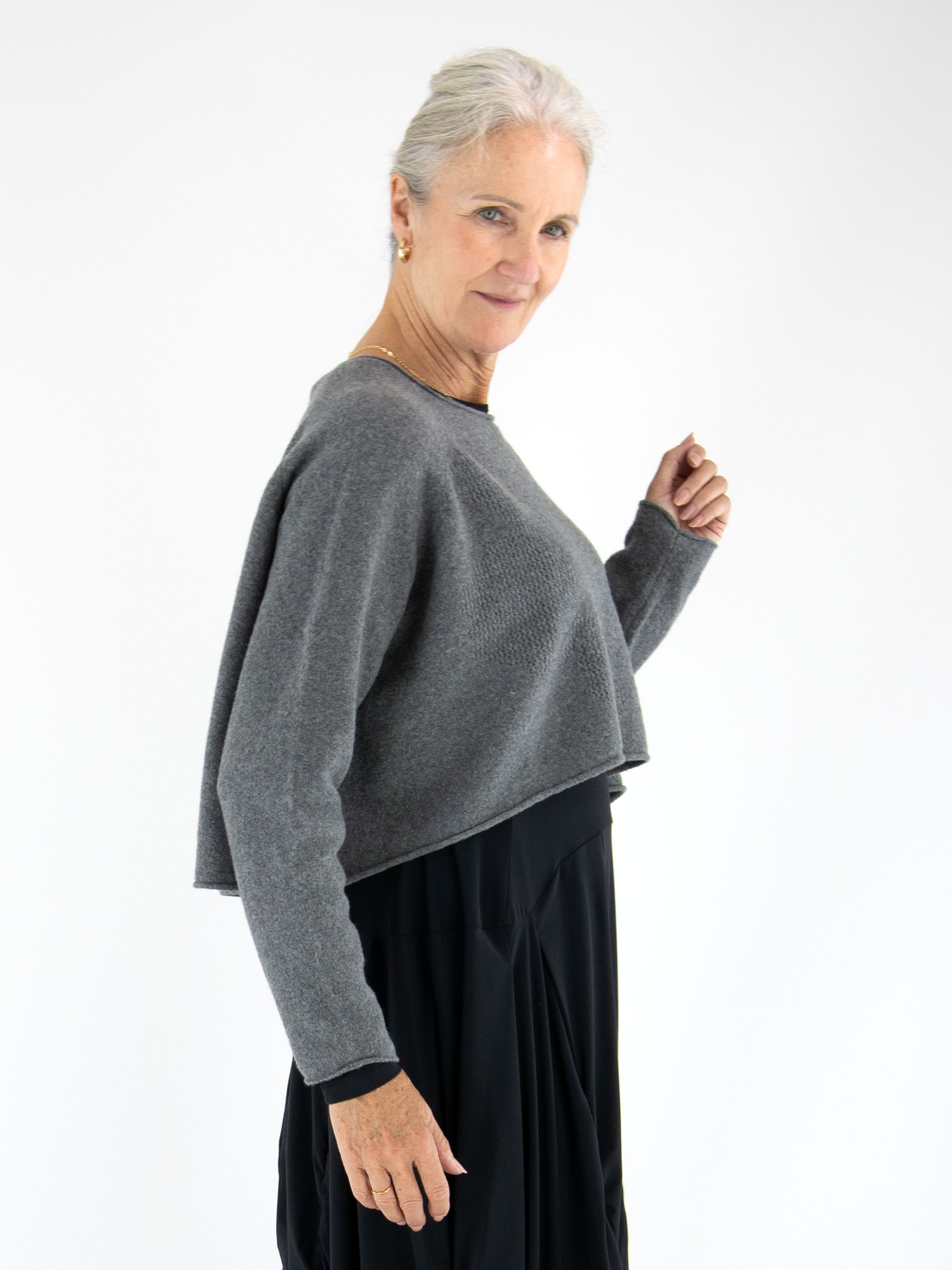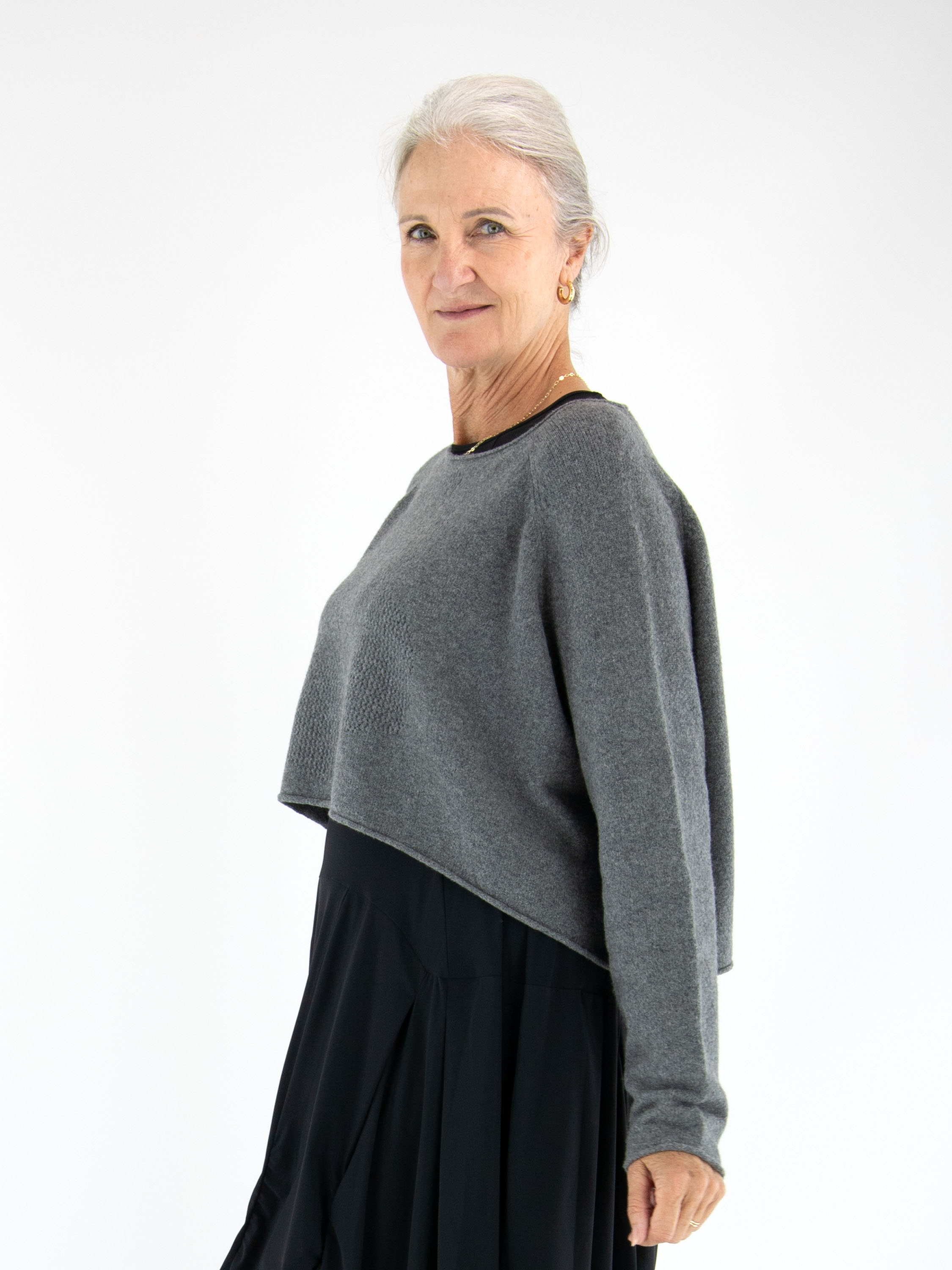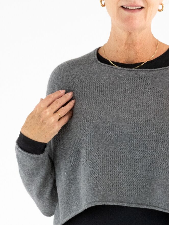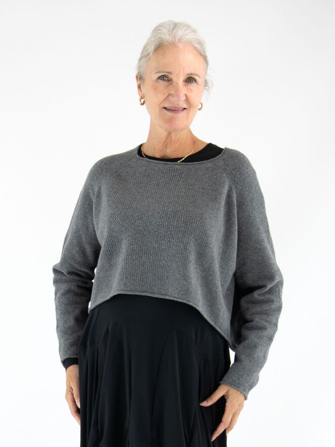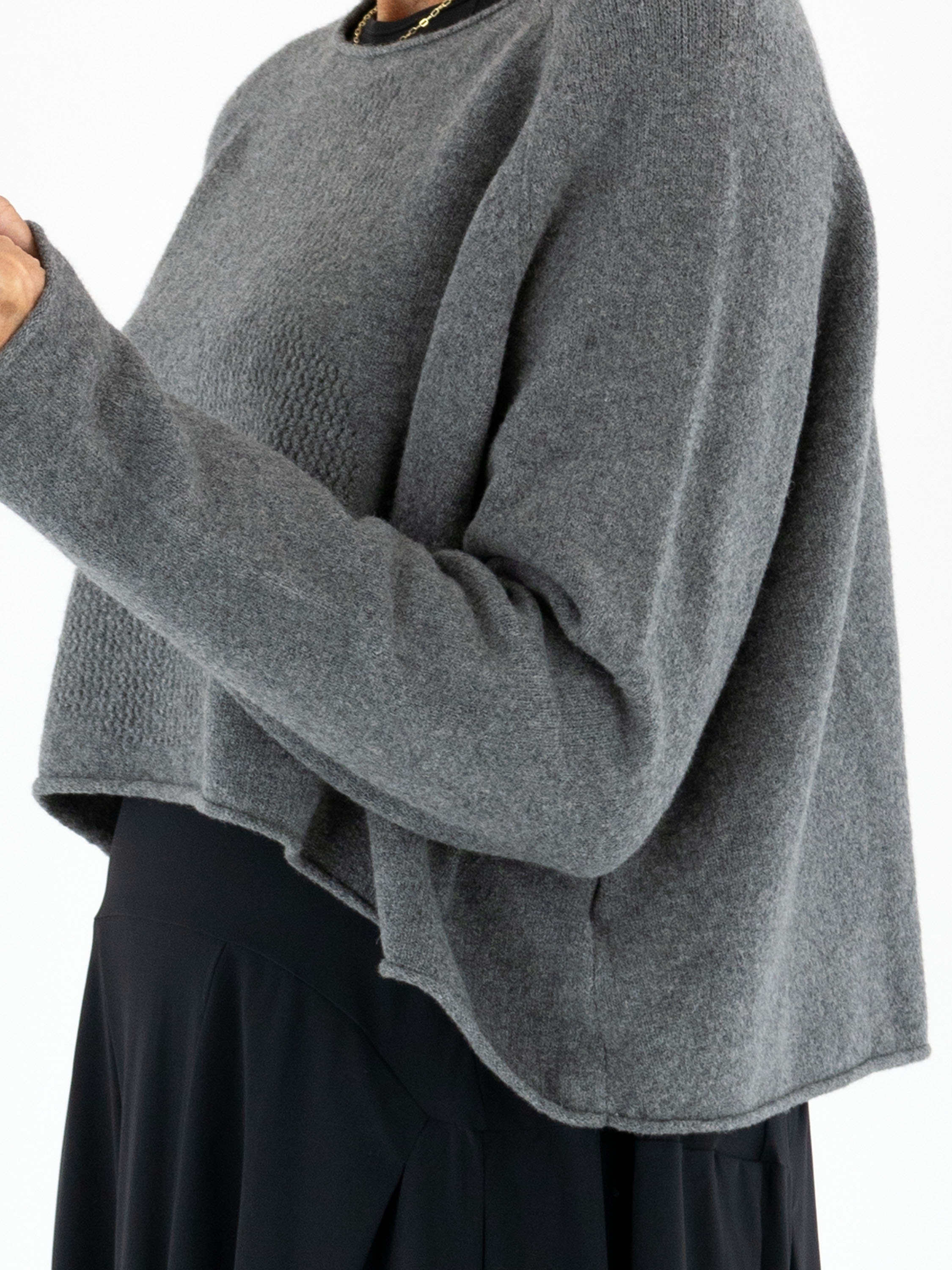 Kurzer, weit geschnittener Pullover von Rundholz Black Label in meliertem Grauton. Auf der Vorderseite entsteht durch verschiedene Stricktechniken ein grafisches Muster. Der Rundhalsausschnitt und der Saum sind gerippt. Dieser Pullover sollte von Hand gewaschen werden.