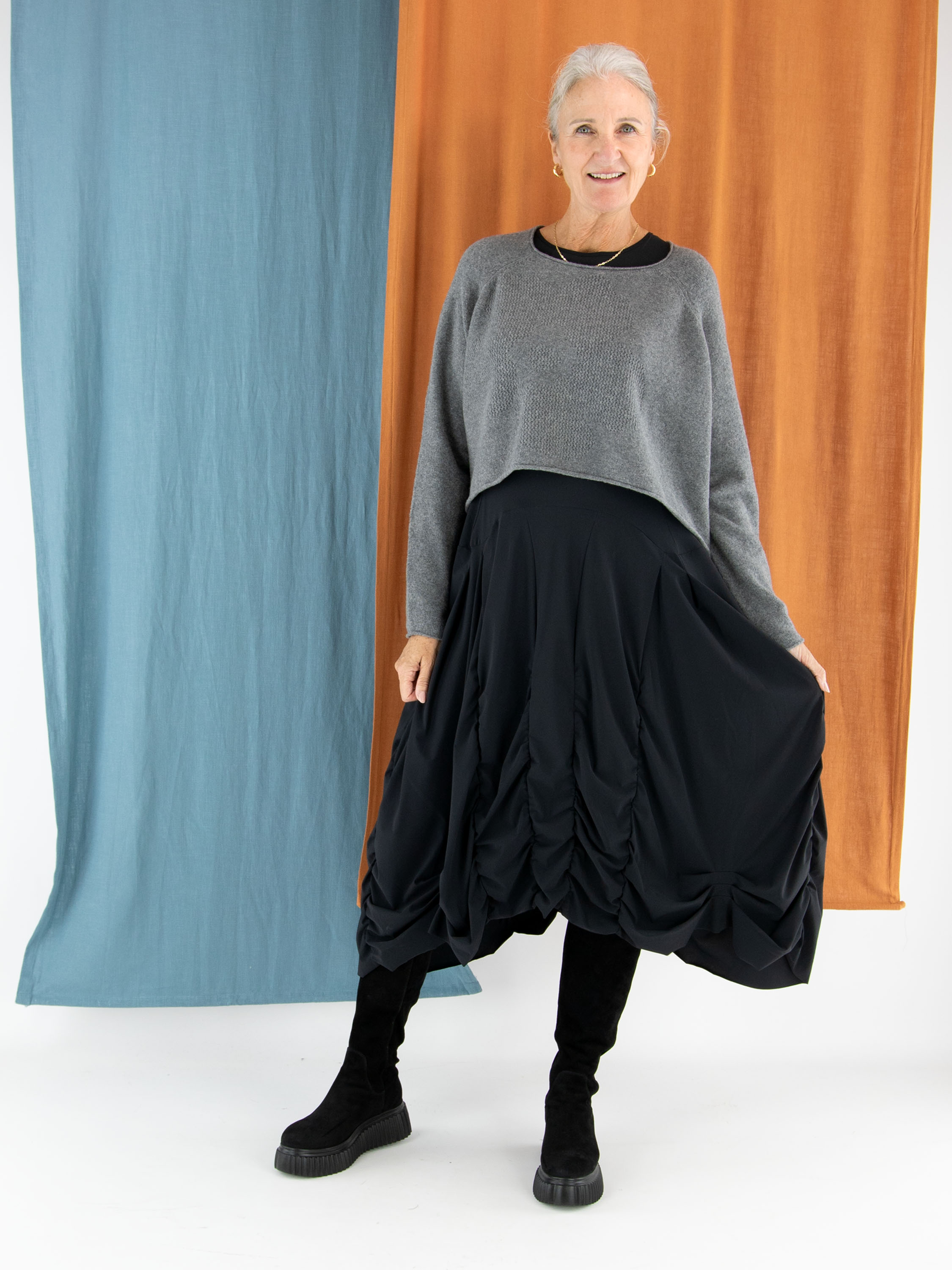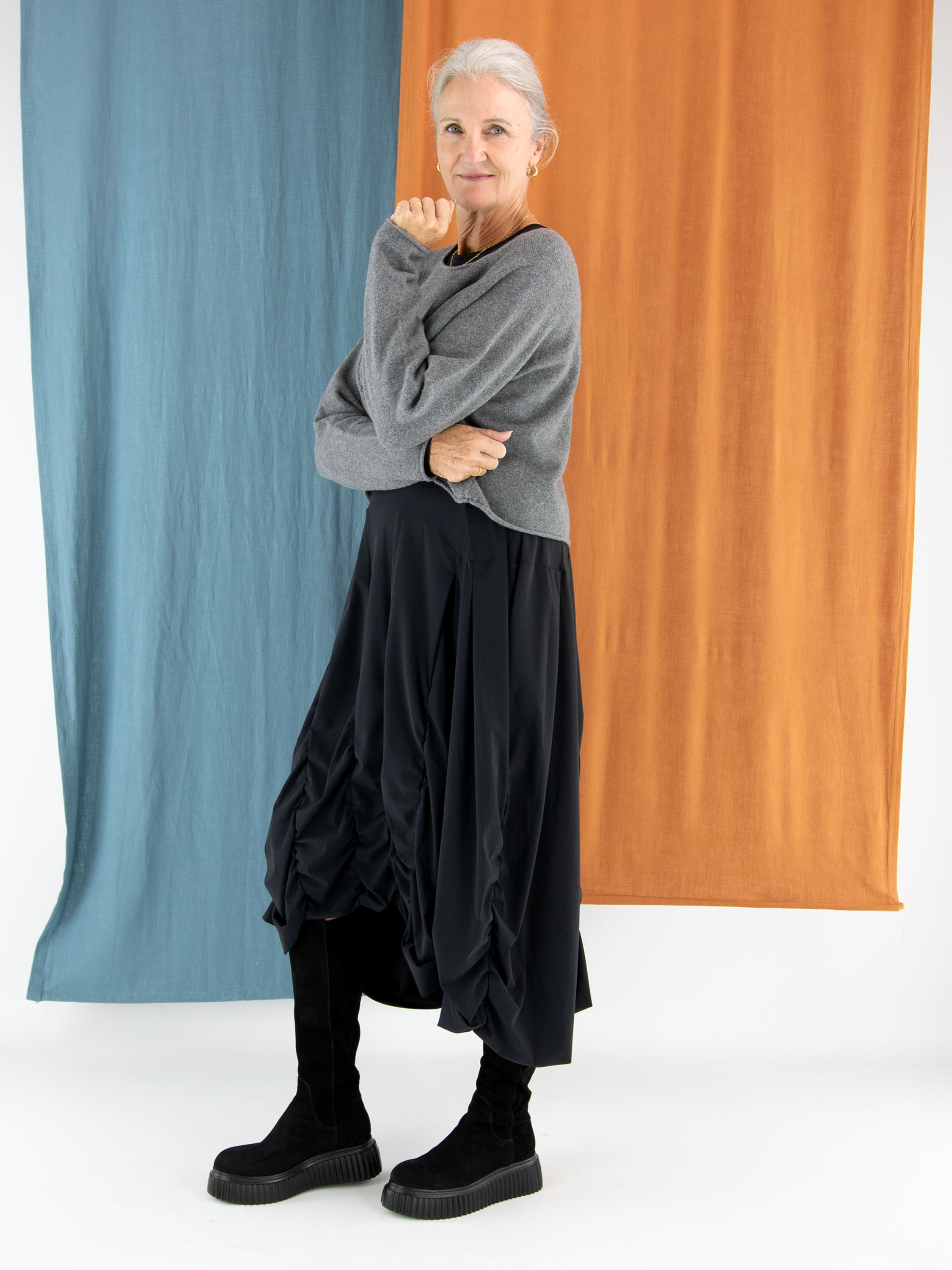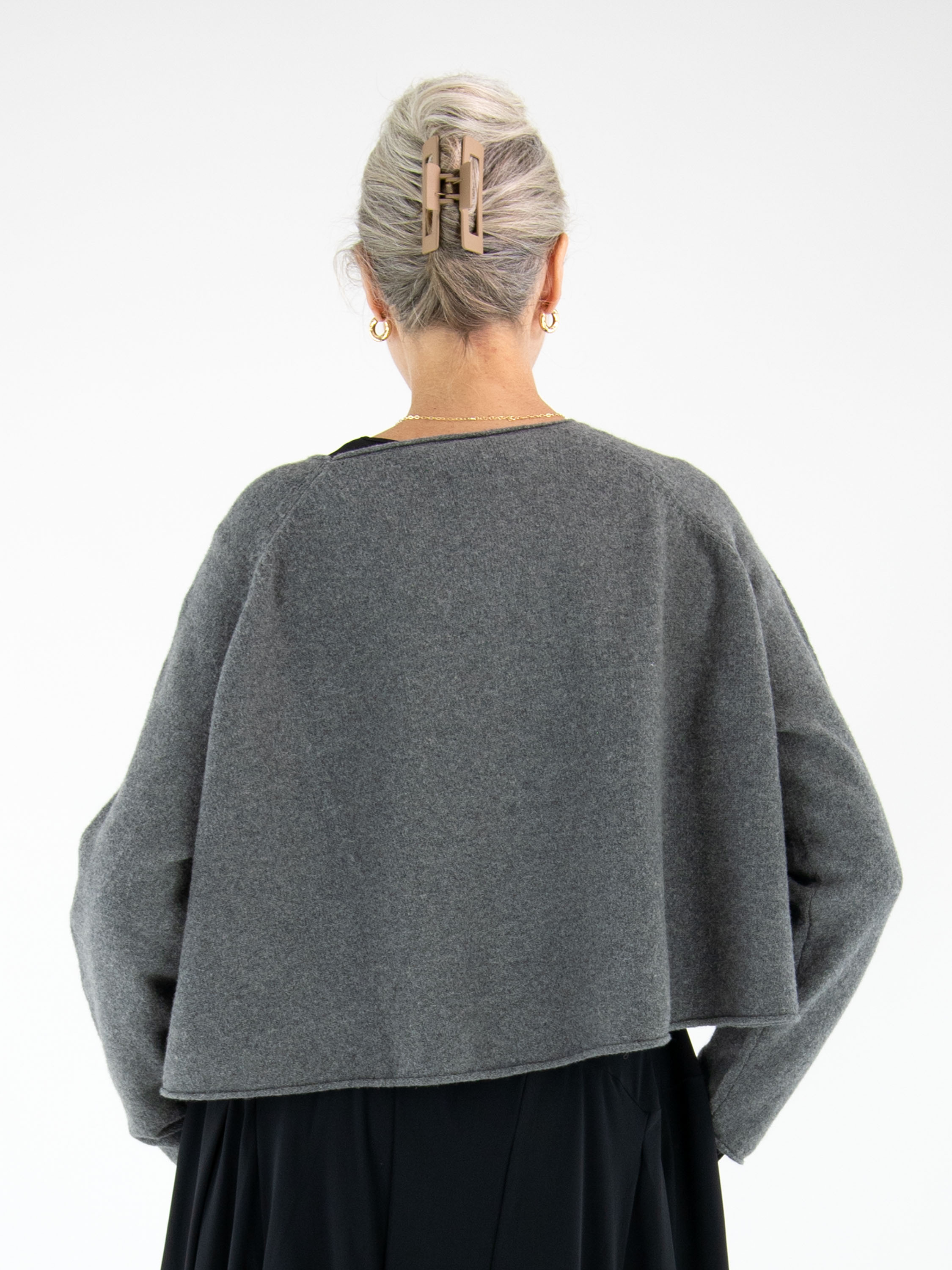 Kurzer, weit geschnittener Pullover von Rundholz Black Label in meliertem Grauton. Auf der Vorderseite entsteht durch verschiedene Stricktechniken ein grafisches Muster. Der Rundhalsausschnitt und der Saum sind gerippt. Dieser Pullover sollte von Hand gewaschen werden.
