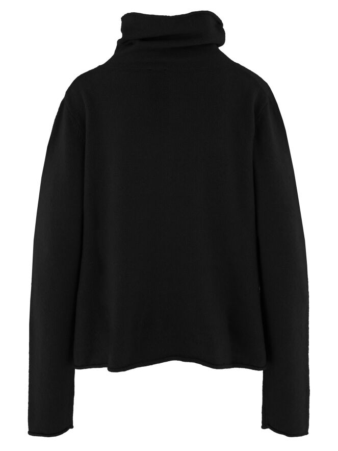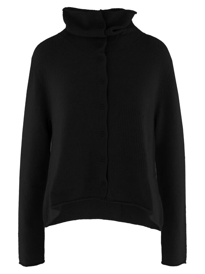 Kurze, weite Strickjacke von Rundholz Black Label in Schwarz. Sie besitzt einen fallenden Rollkragen und einen gerafften Saum. Im linken Vorderteil ist ein Blumenmuster in einer anderen Strickart eingearbeitet. Diese Jacke sollte von Hand gewaschen werden.