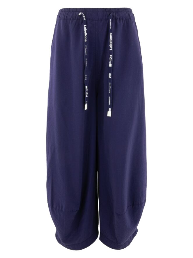 Weite Hose von Rundholz Black Label in Indigoblau. In der Taille befindet sich ein fein plissierter Gummibund mit einem Tunnelzug. Auf Wadenhöhe gibt es eine Naht in den Beinen, nach der die Beine leicht zum unteren Ende hin verjüngt sind. Diese Hose kann von Hand gewaschen werden.