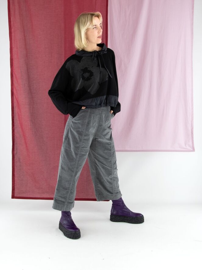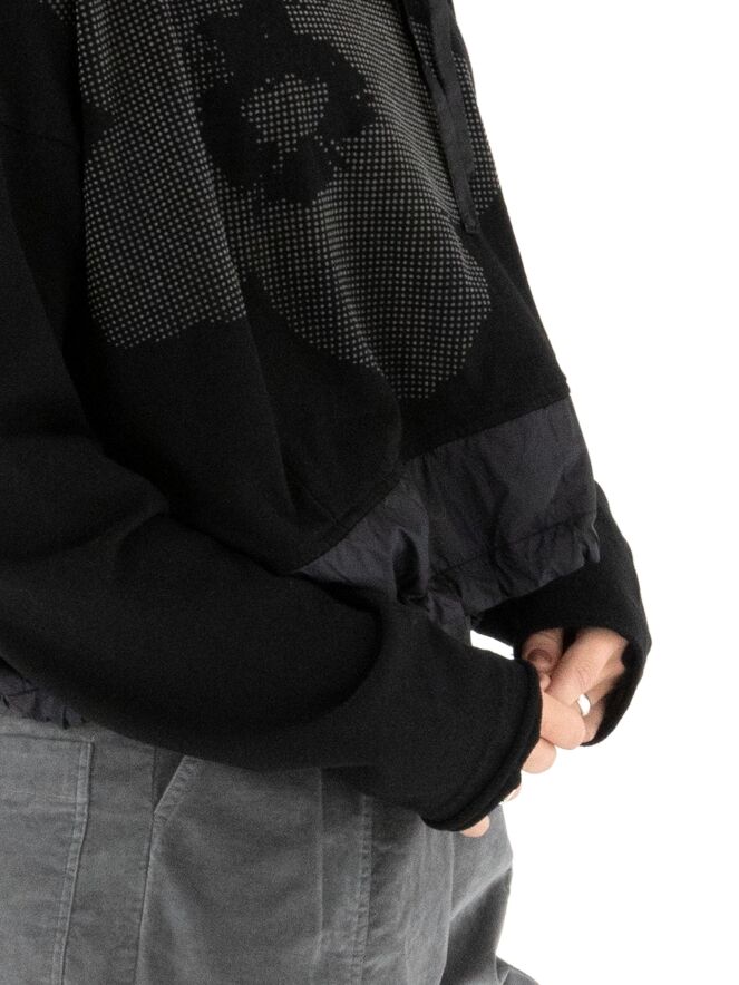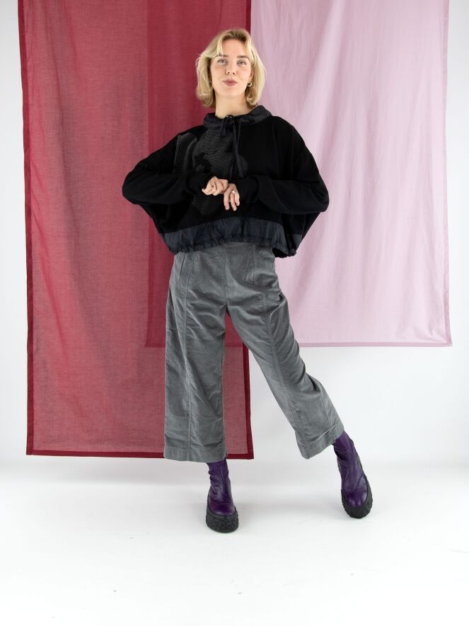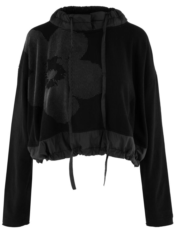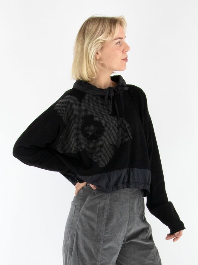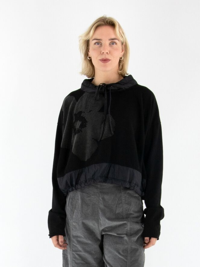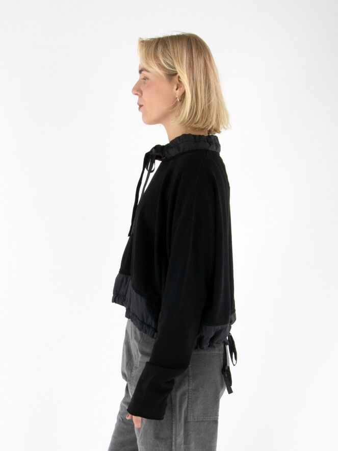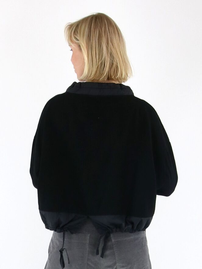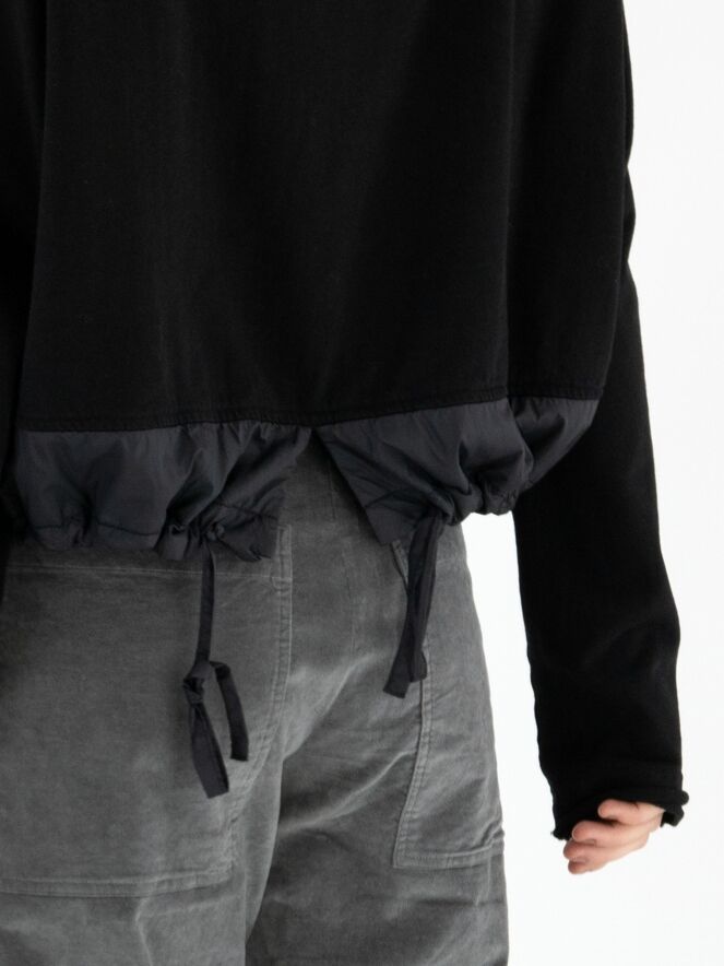 Shirt von Rundholz Black Label in Schwarz. Am Halsausschnitt befindet sich ein schwarzer Besatz aus Fallschirmstoff mit einem Tunnelzugband. Dieser Besatz mit Kordel wiederholt sich am Saum. Das Shirt kann bei 30 Grad gewaschen werden.