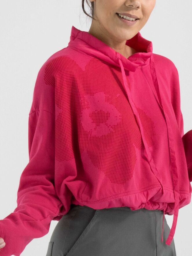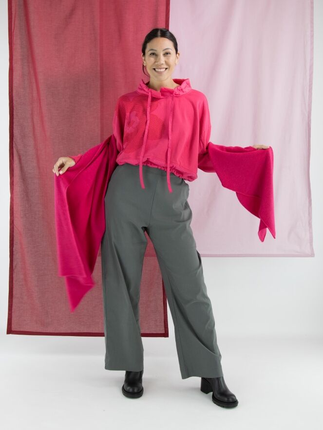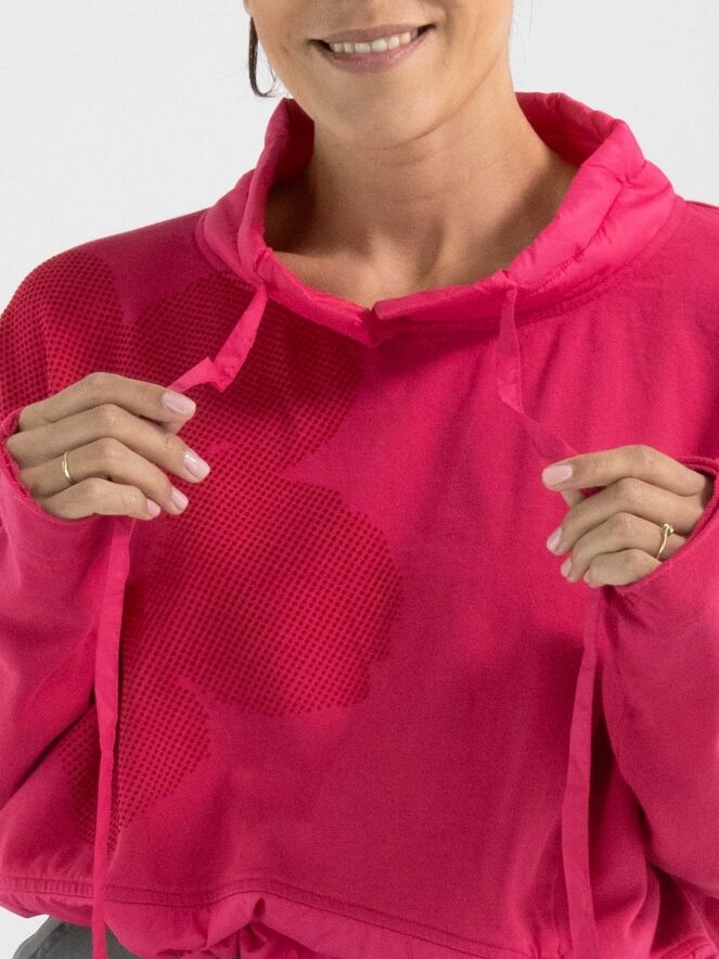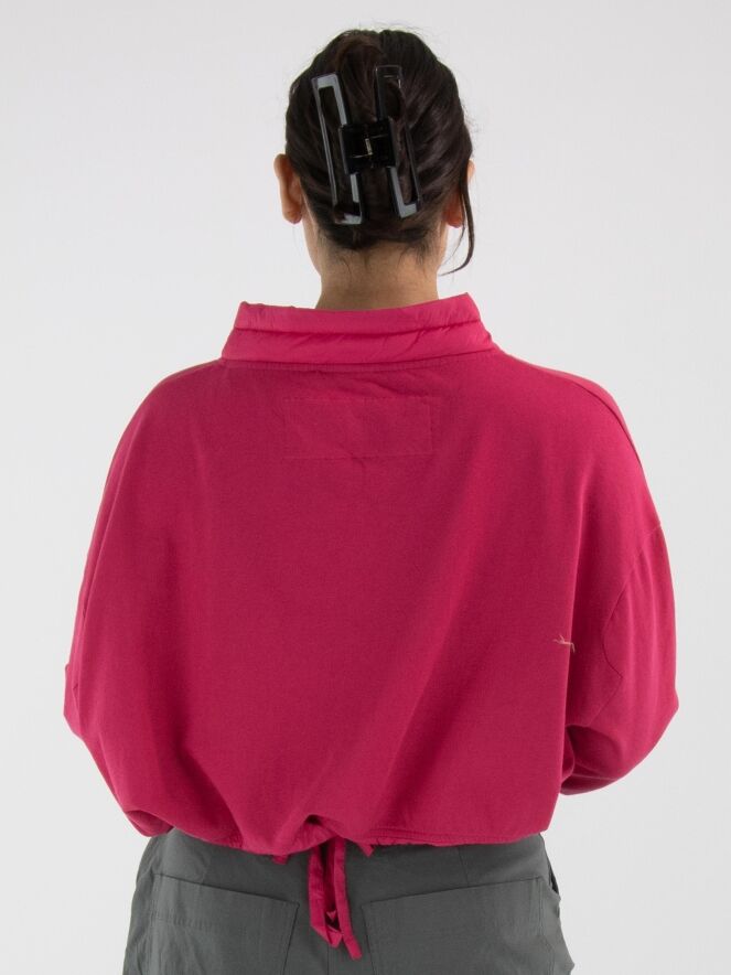Shirt von Rundholz Black Label in Pink. Am Halsausschnitt befindet sich ein Besatz aus Fallschirmstoff mit Tunnelzugband in derselben Pinkfarbe. Dieser Besatz mit Kordel wiederholt sich am Saum. Das Shirt kann bei 30 Grad gewaschen werden.