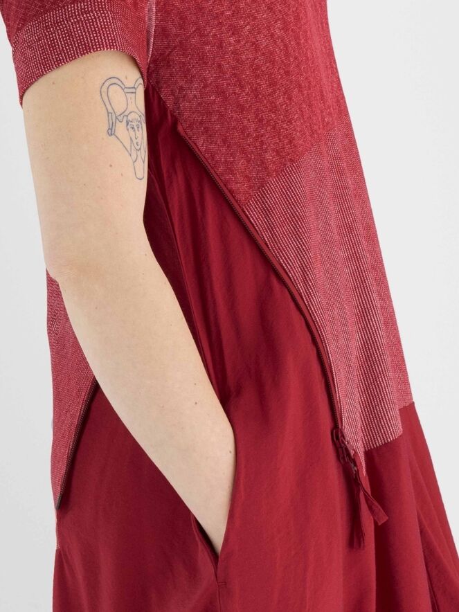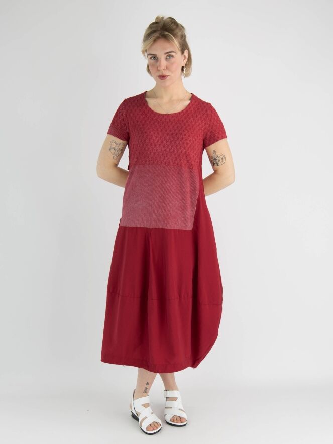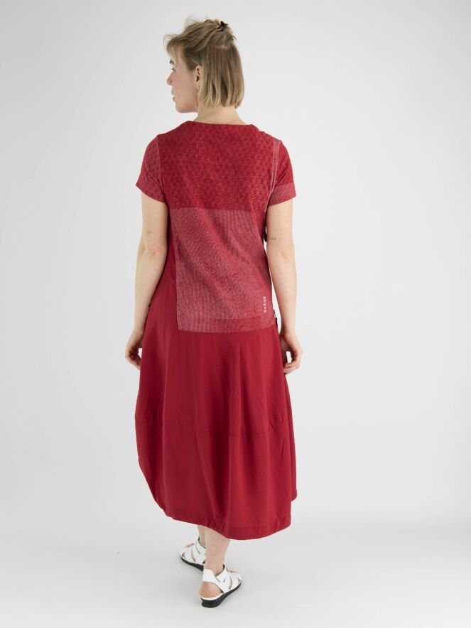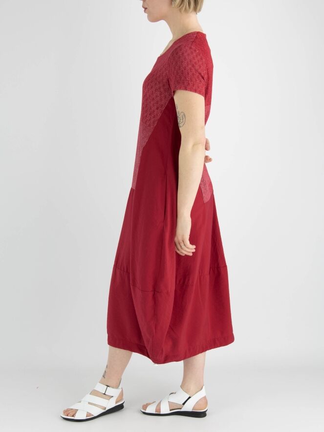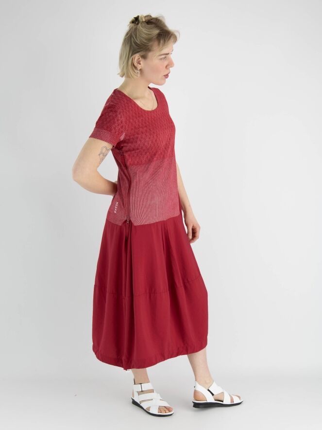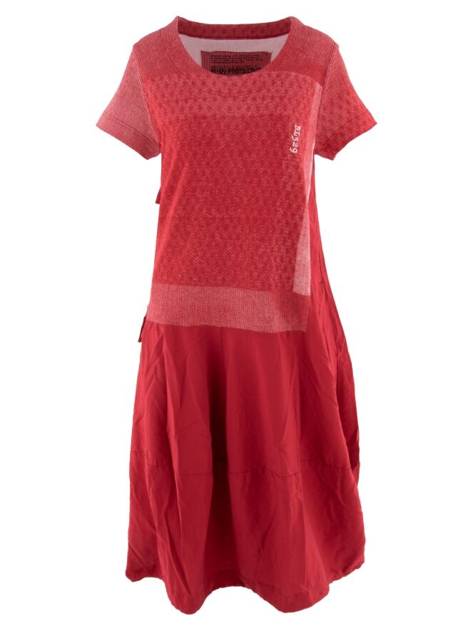 Ein Kleid von Rundholz Black Label in Rot mit einem grafischen Muster über der Taille in Rot und Weiß. Das Kleid hat einen runden Ausschnitt und kurze Ärmel. Ab der Taille hat das Kleid eine Ballonform, und auf der rechten Seite ist ein Reißverschluss angebracht, um mehr Platz zu schaffen, wenn er geöffnet wird. Dieses Kleid kann von Hand gewaschen werden.