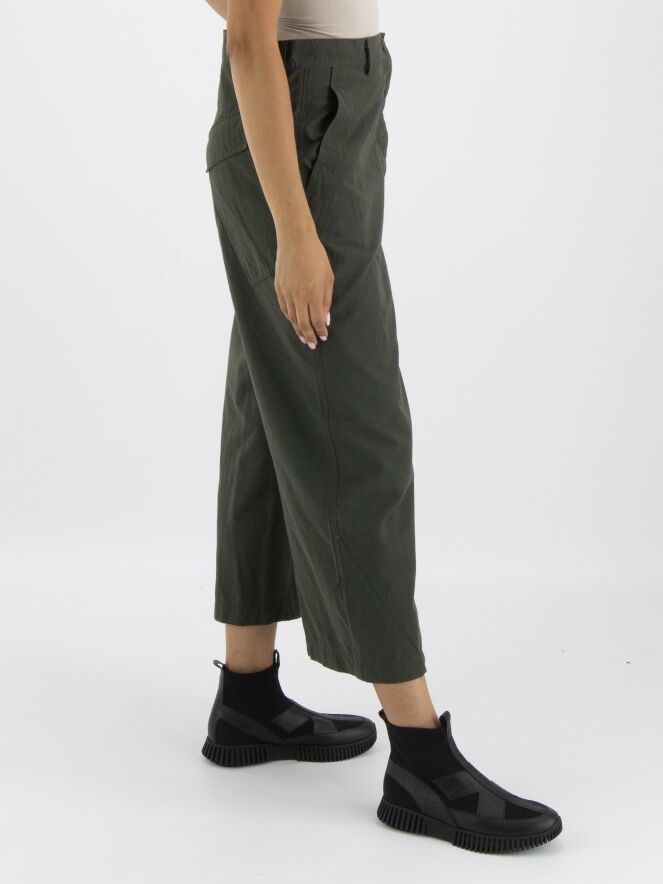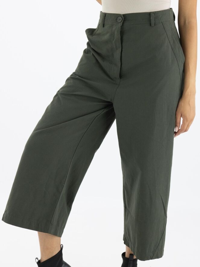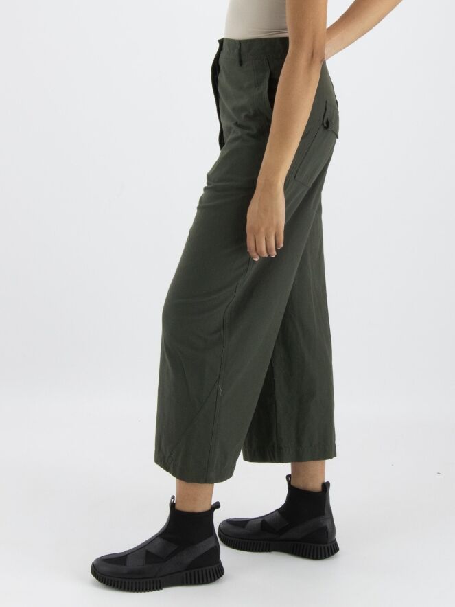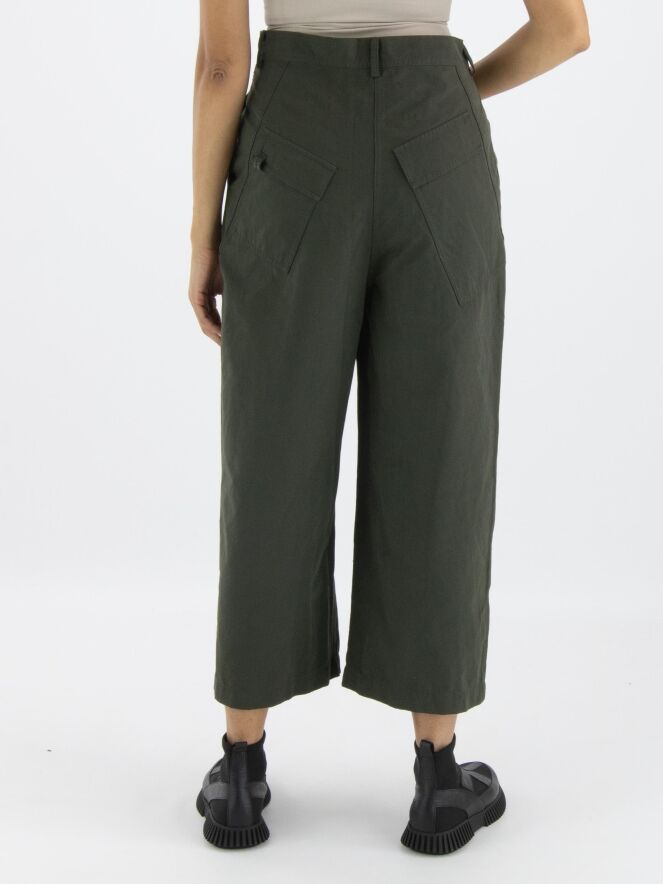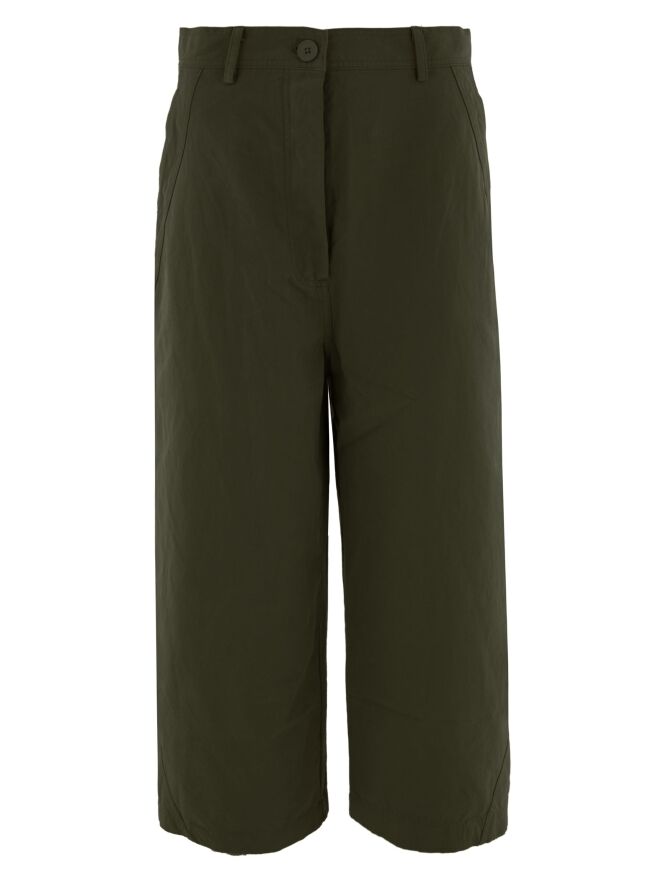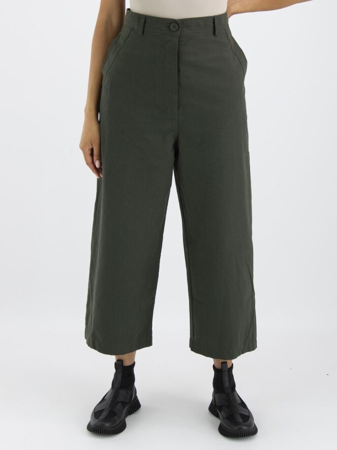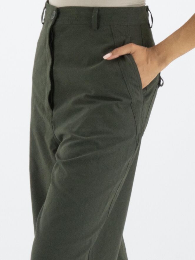 Eine weite, gerade geschnittene Hose von Rundholz Black Label in Khakifarben. Die Hose hat Eingrifftaschen und kann bei 30 Grad gewaschen werden.