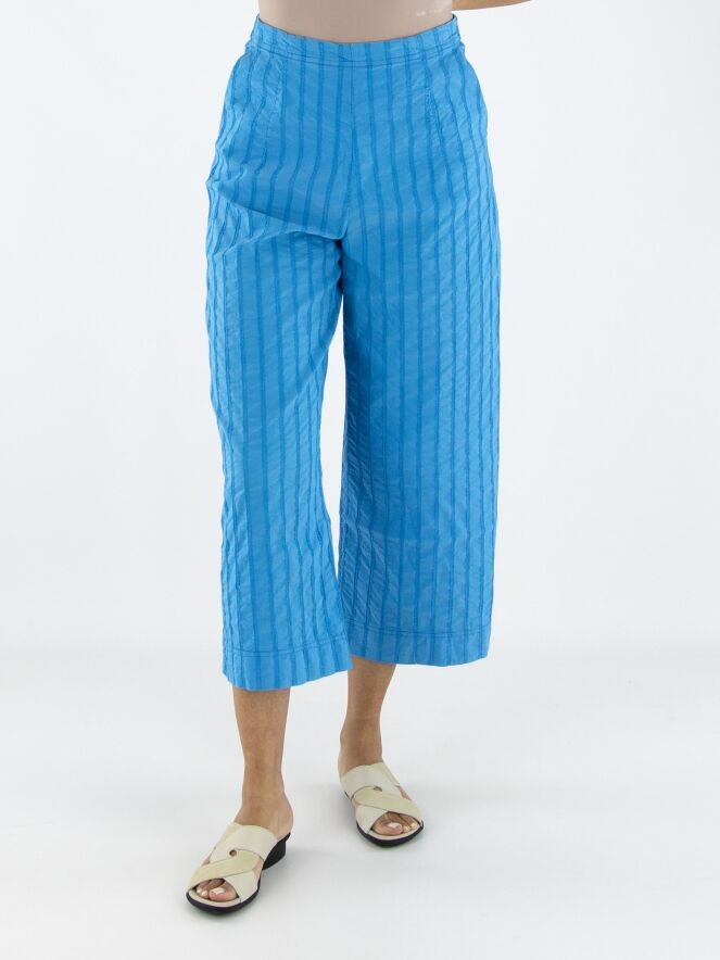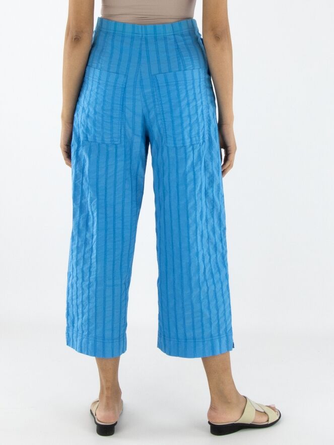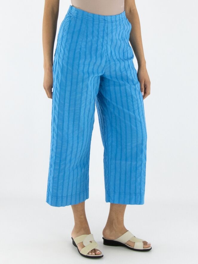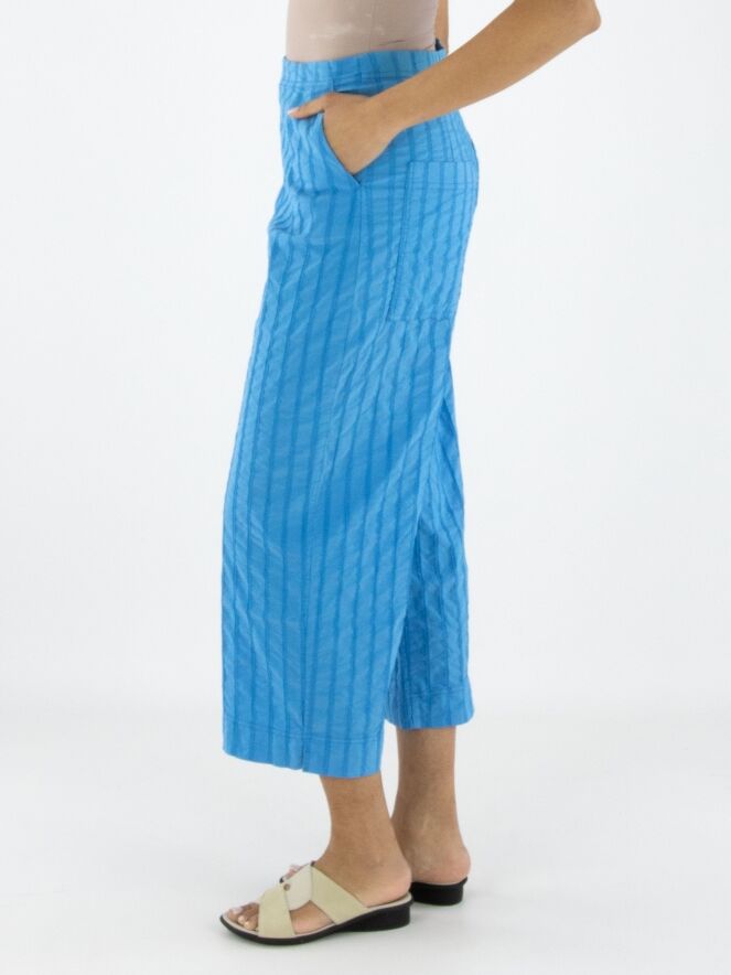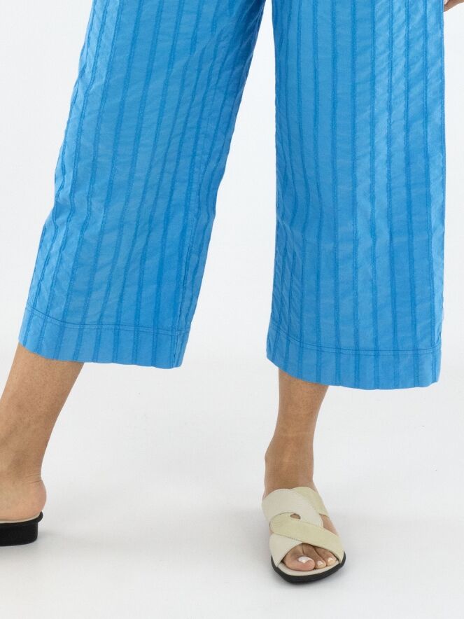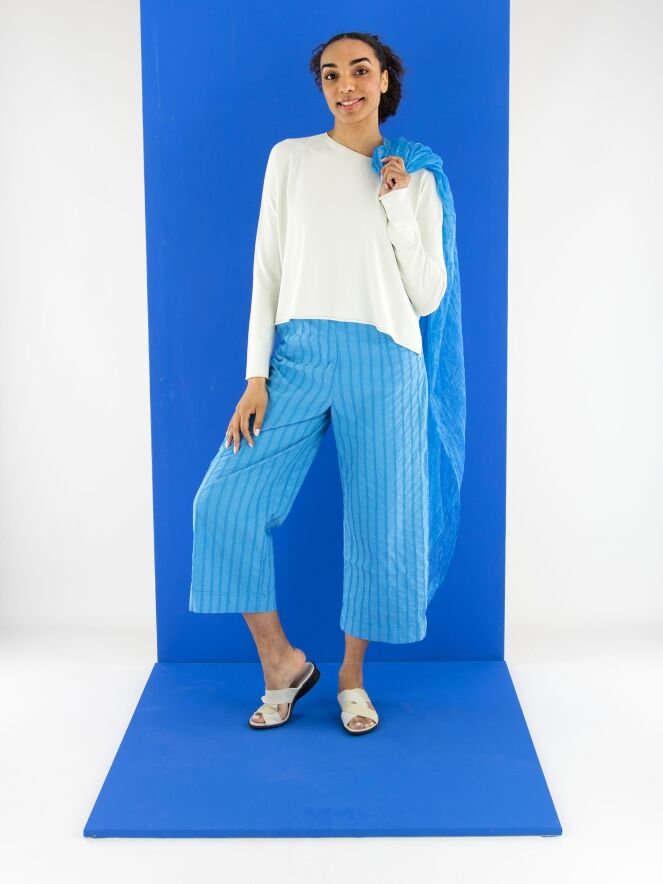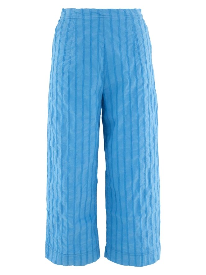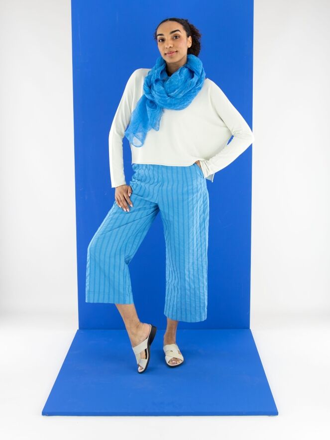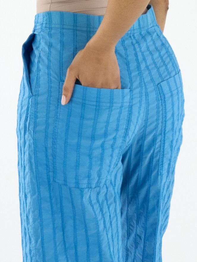 Eine Hose von Rundholz Black Label in einem leuchtenden Blauton. Die Hose hat ein vertikales Streifenmuster mit Ziernähten. Der Bund ist mit einem schmalen elastischen Band versehen. Die Hose hat Seitentaschen, und an der unteren Seite der Hosenbeine befindet sich ein kurzer Schlitz. Diese Hose kann bei 30 Grad gewaschen werden.