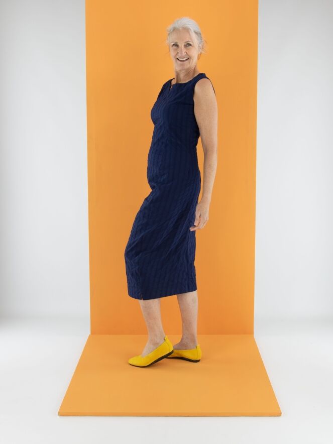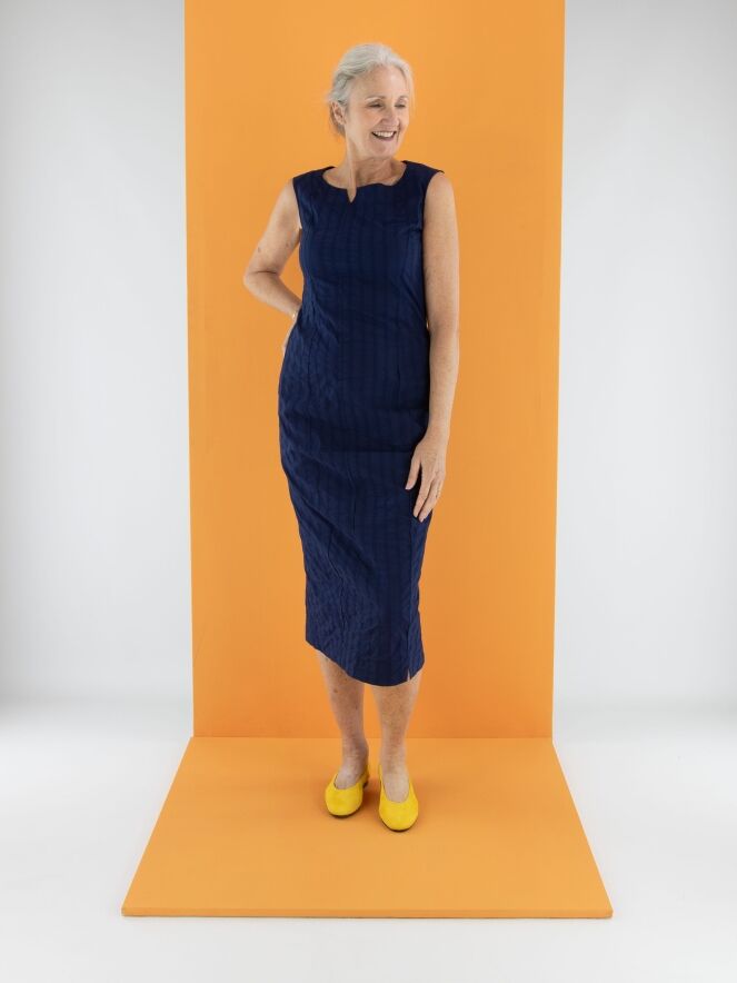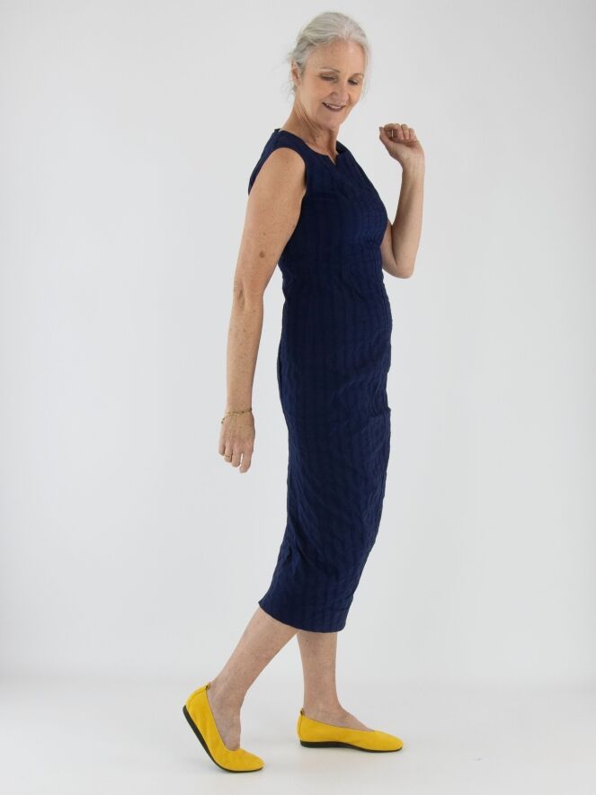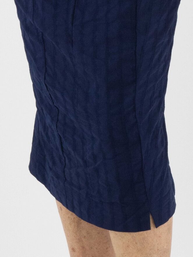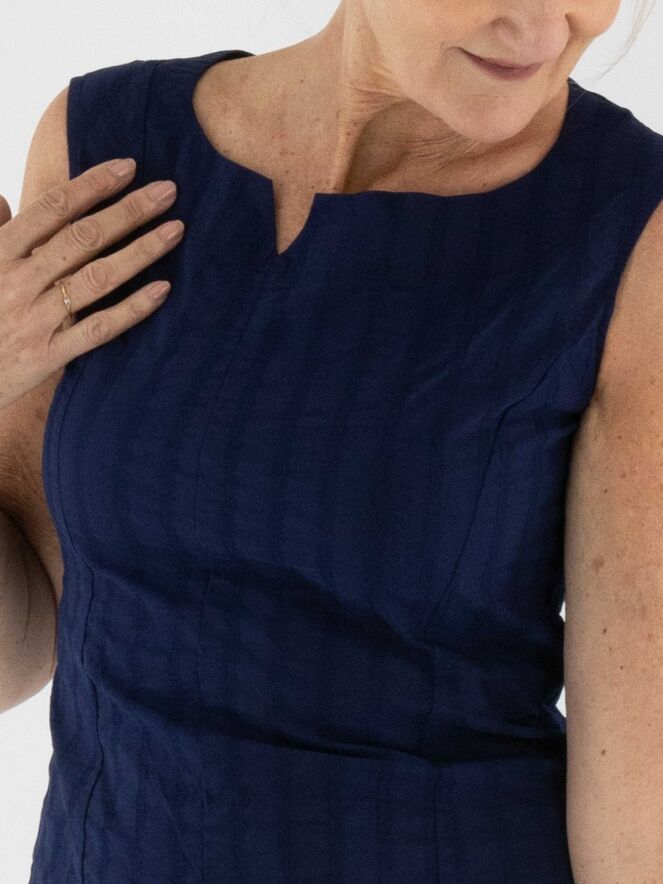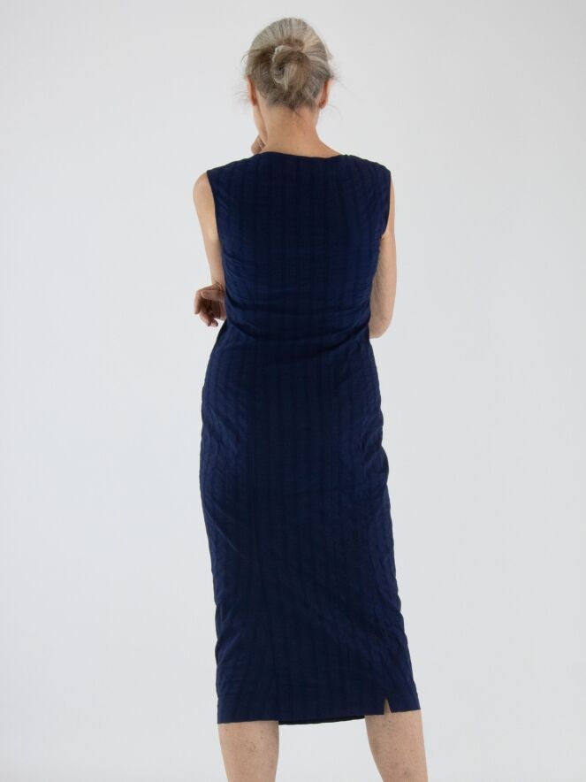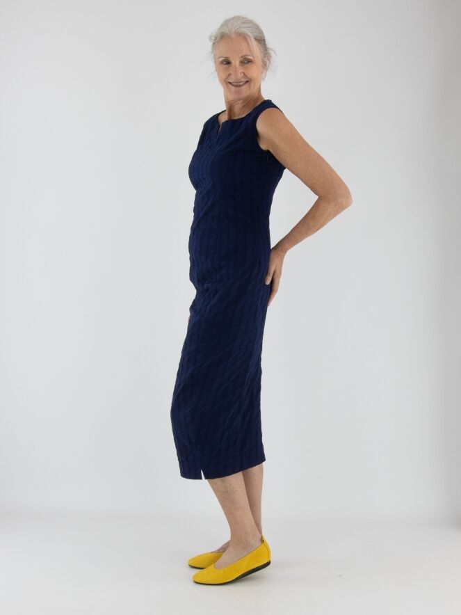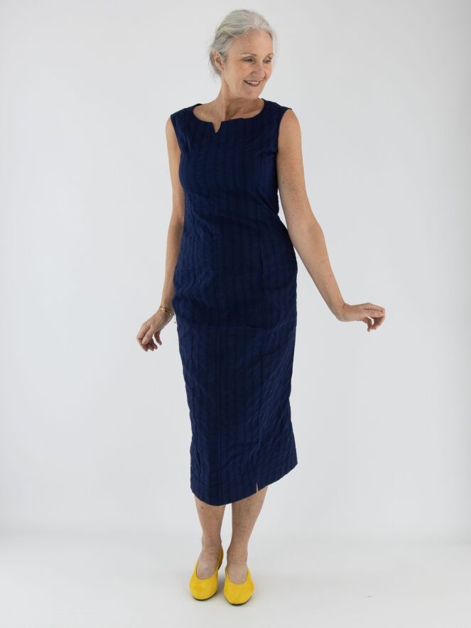 Ein leicht tailliertes Kleid von Rundholz Black Label in Marineblau. Das Kleid hat ein vertikales Streifenmuster mit Ziernähten. In der Mitte des runden Ausschnitts befindet sich ein kleiner Einschnitt. Dieses Kleid kann bei 30 Grad gewaschen werden.