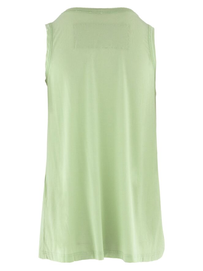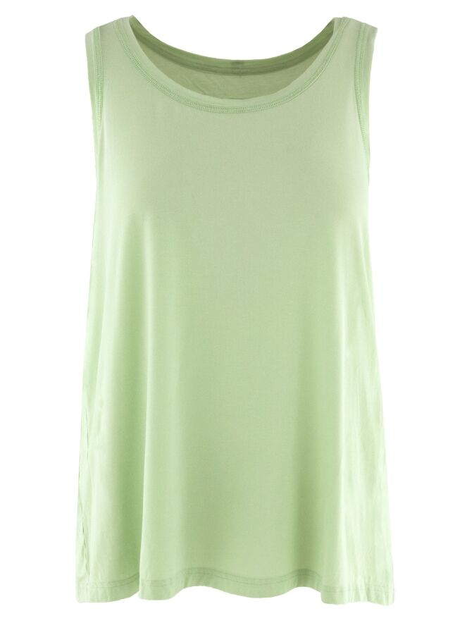Top von Rundholz Black Label in einem frischen Pistaziengrün. Das Modell verfügt über einen weiten Rundhalsausschnitt und eine leichte A-Linie, die für eine fließende, moderne Silhouette sorgt. Die Träger sind etwa 3 cm breit. Dieses Top kann bei 30 Grad gewaschen werden.
