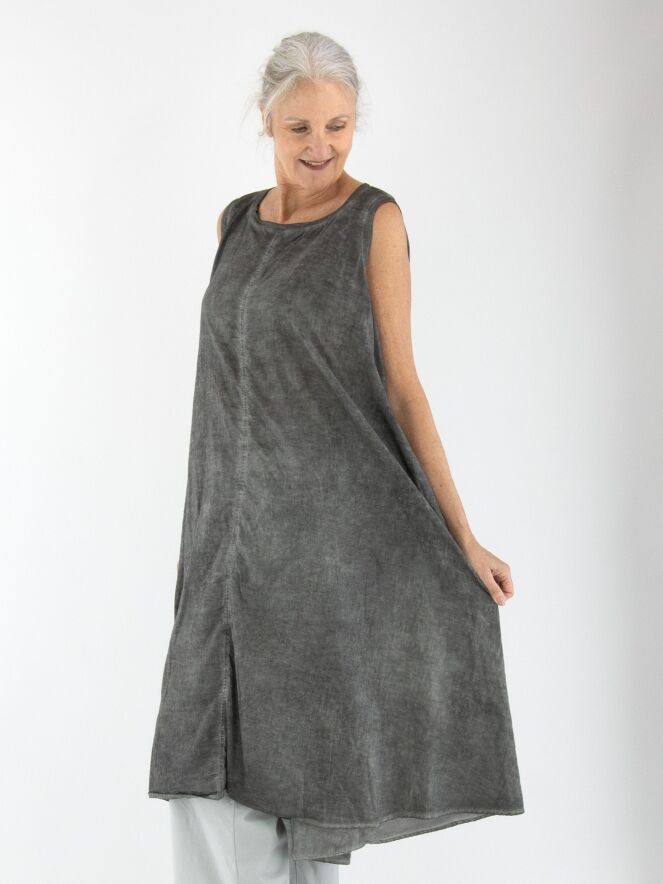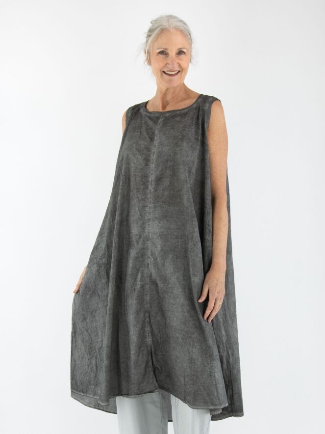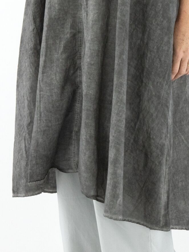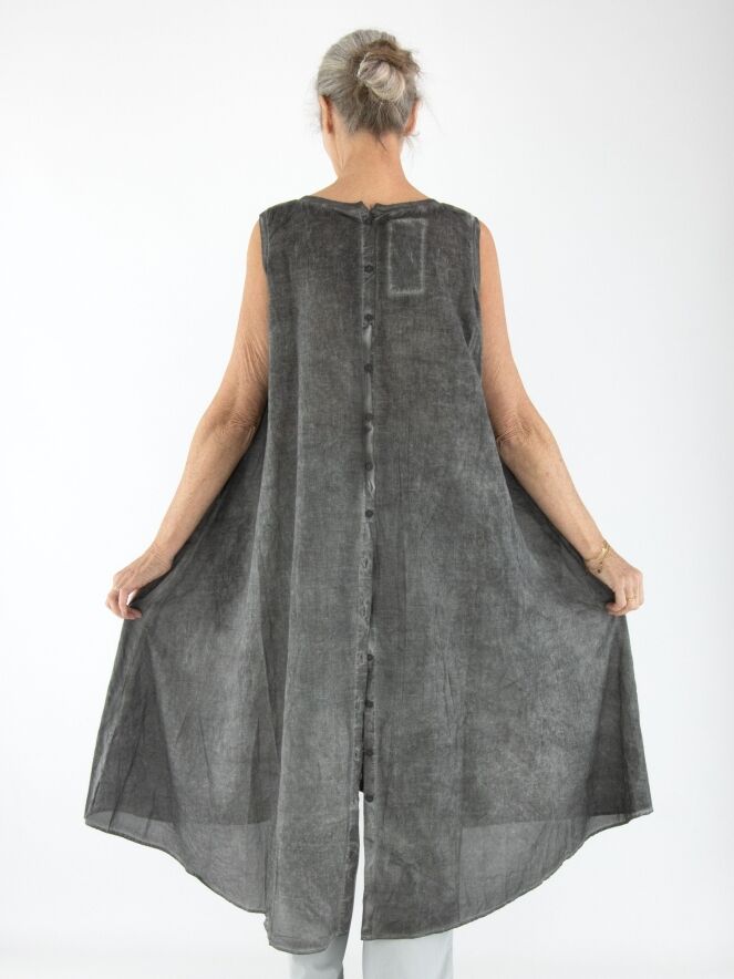 Ein leicht transparentes Kleid von Rundholz Black Label in meliertem Dunkelgrau. Entlang des weiten Rundhalsausschnitts und der Armausschnitte verläuft eine fein gerippte Strickborte. Eine durchgehende Knopfleiste ziert die Rückseite. Auf Taillenhöhe befinden sich Eingrifftaschen. Dieses Kleid kann bei 30 Grad gewaschen werden.