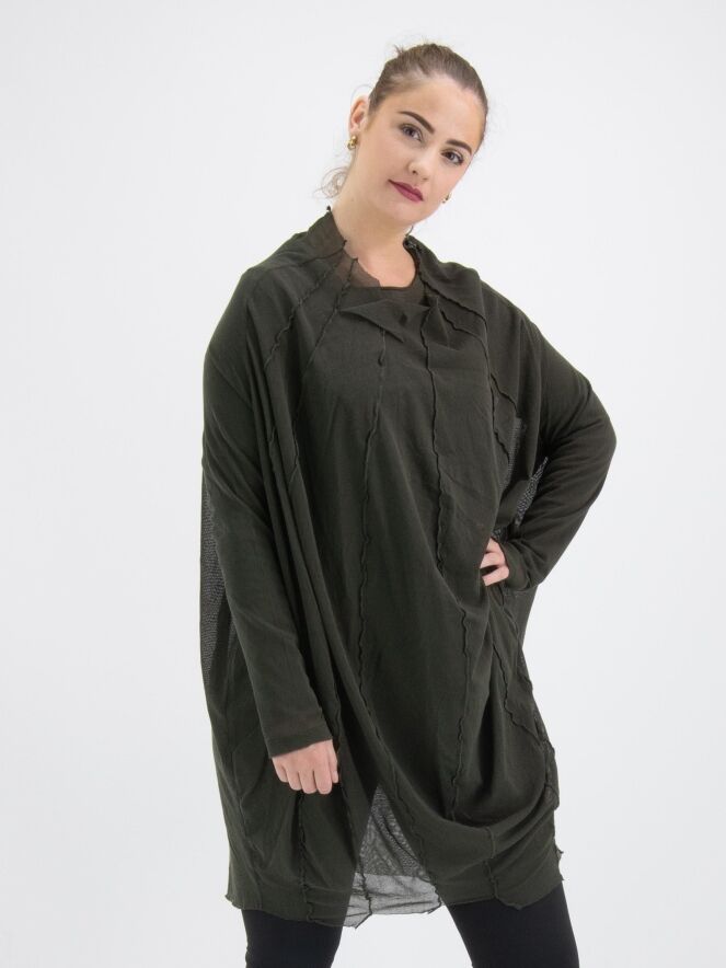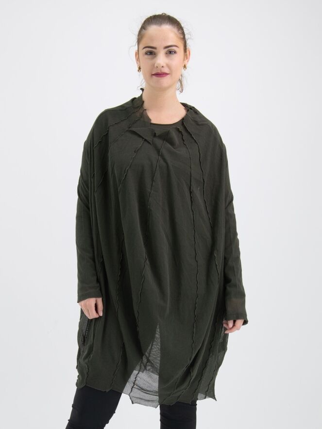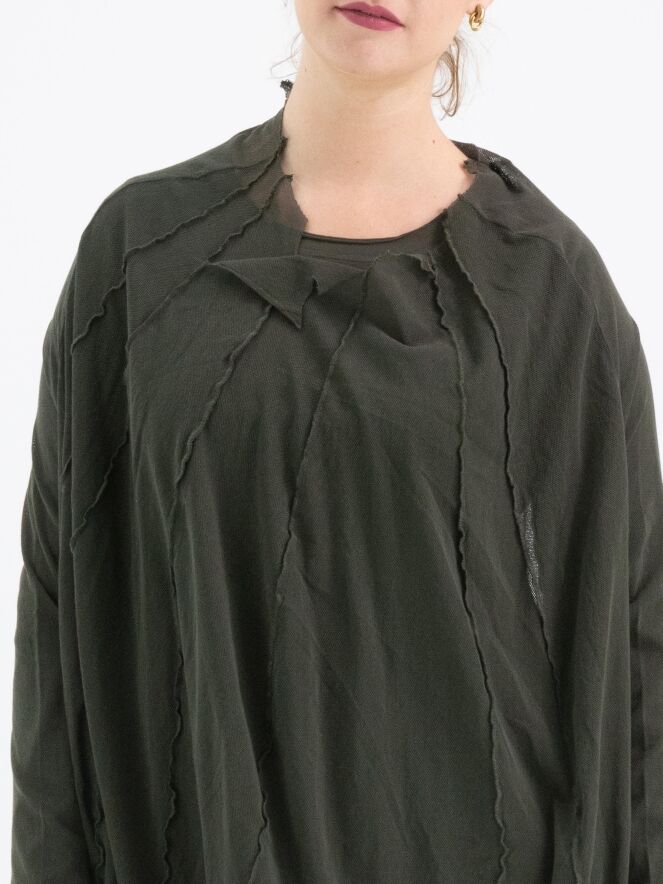 Ein transparentes Shirt von Rundholz Black Label in Khakifarben. Von dem weiten, unversäumten Rundhalsausschnitt verlaufen mehrere umgekehrte Nähte nach unten. Das Shirt hat lange Ärmel und kann bei 30 Grad gewaschen werden.
