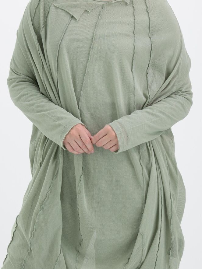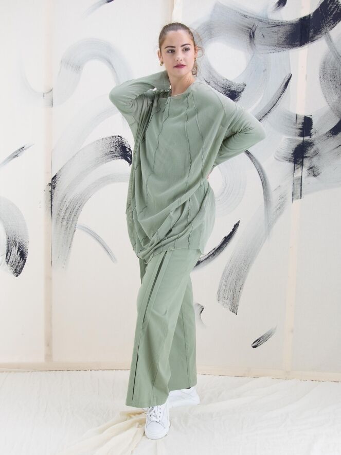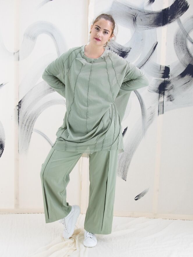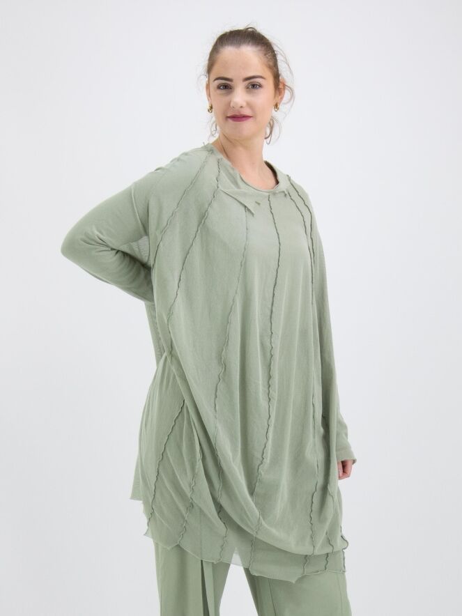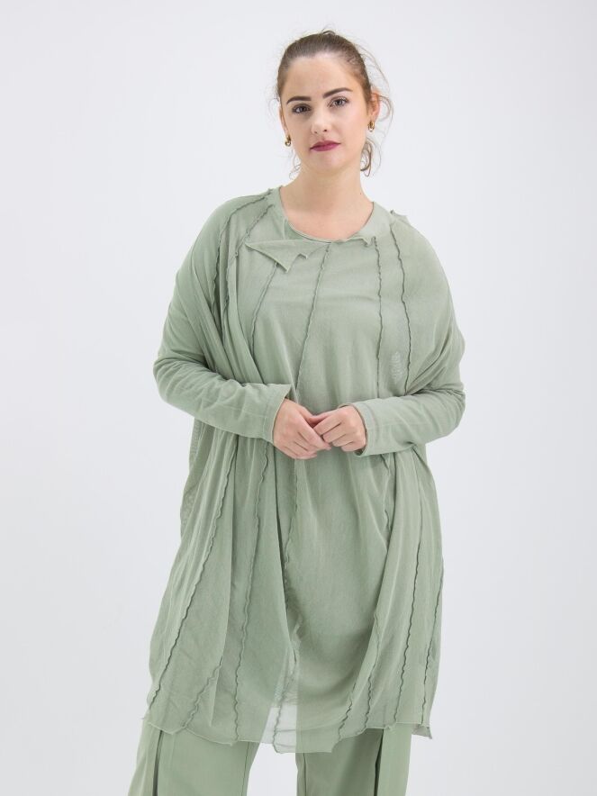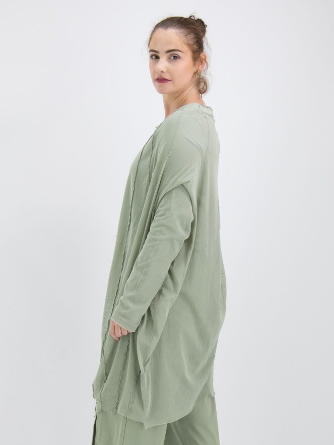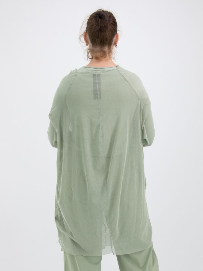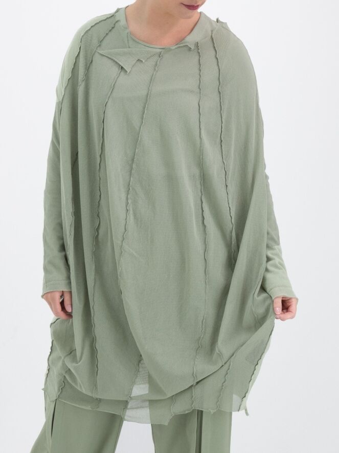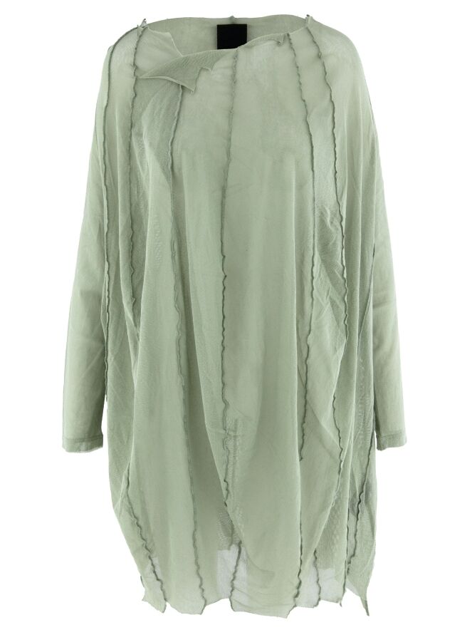 Ein transparentes Shirt von Rundholz Black Label in einem sanften Olivton. Von dem weiten, unversäuberten Rundhalsausschnitt verlaufen mehrere umgekehrte Nähte nach unten. Das Shirt hat lange Ärmel und kann bei 30 Grad gewaschen werden.
