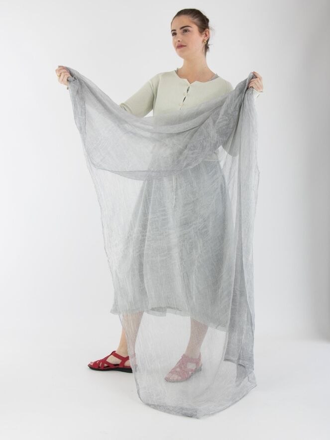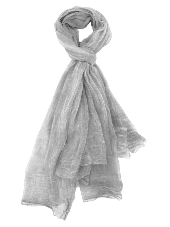 Ein leicht transparenter, melierter Schal in verschiedenen Grautönen. Die Ränder des Schals sind fein ausgefranst. Dieser Schal sollte von Hand gewaschen werden.
