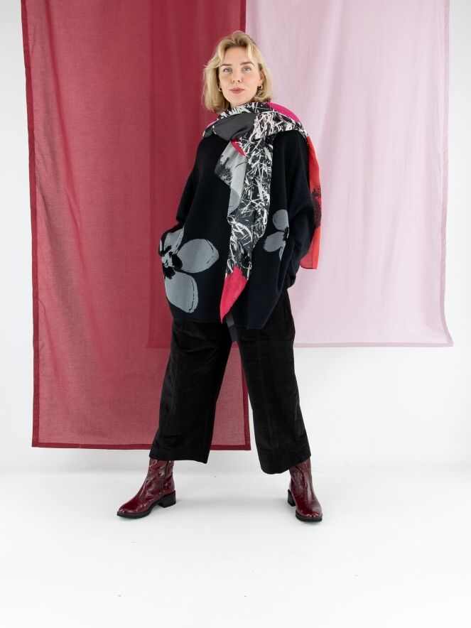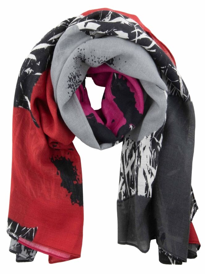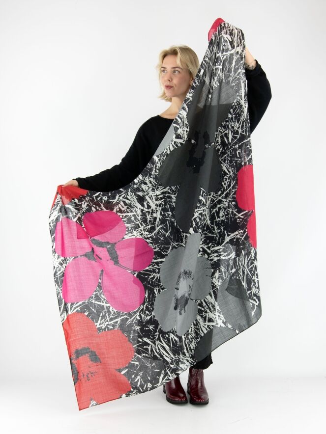 Leicht transparente Schal von Rundholz Black Label mit floralem Muster auf einem grafischen Zweig-Dessins. Die Blüten in Grau, Pink und Rot setzen einen stilvollen Kontrast und verleihen dem Accessoire eine künstlerische, moderne Ausstrahlung. Dieser luxuriöse Schal kann per Hand gewaschen werden.