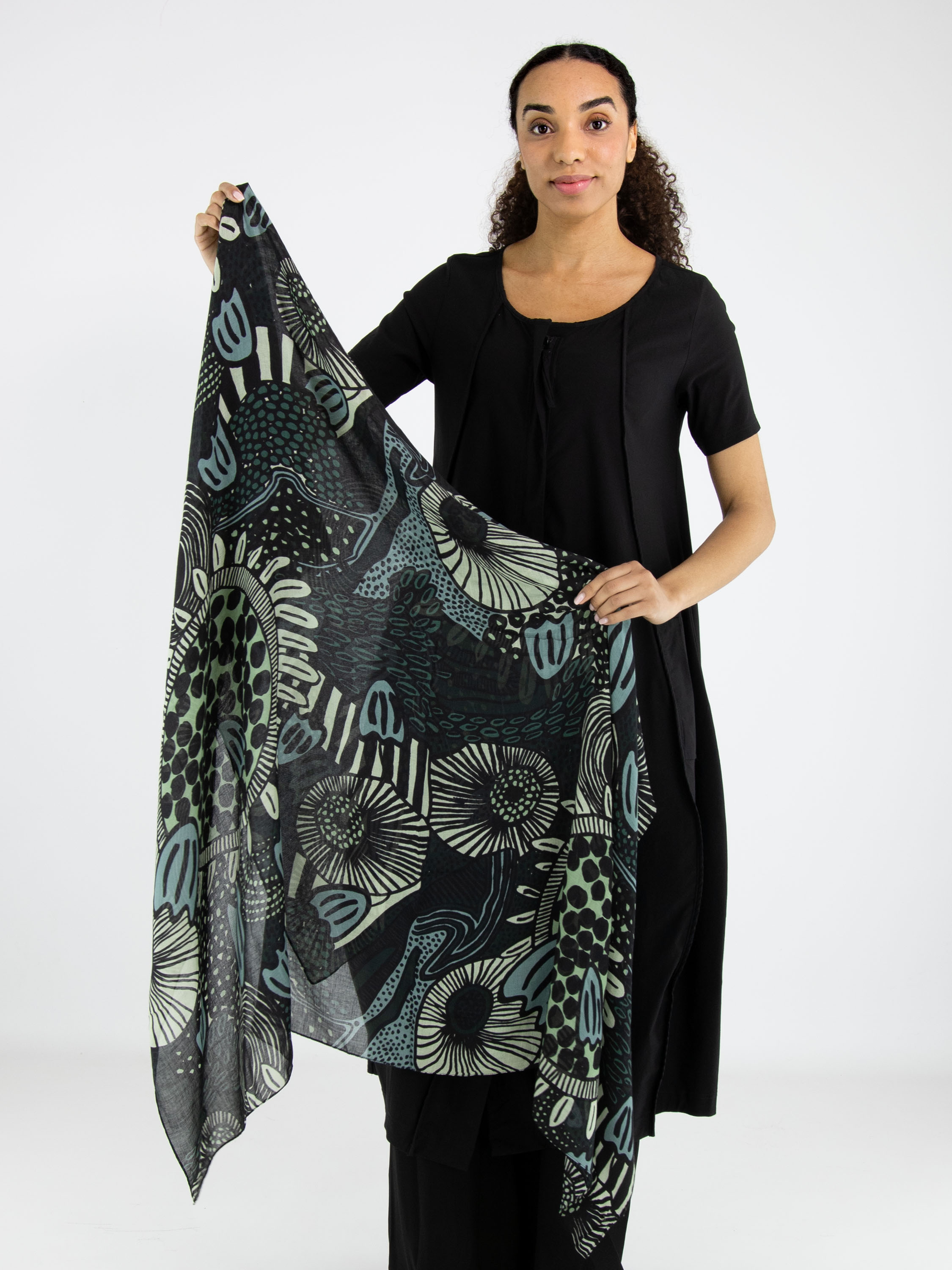 Luxuriöser, leicht transparenter Schal von Rundholz mit grafischem Print in Petrol, Cremeweiß und Schwarz. Das harmonische Farbspiel und das raffinierte Dessin verleihen diesem Accessoire eine markante, moderne Ausstrahlung. Dieser exklusive Schal sollte per Hand gewaschen werden.