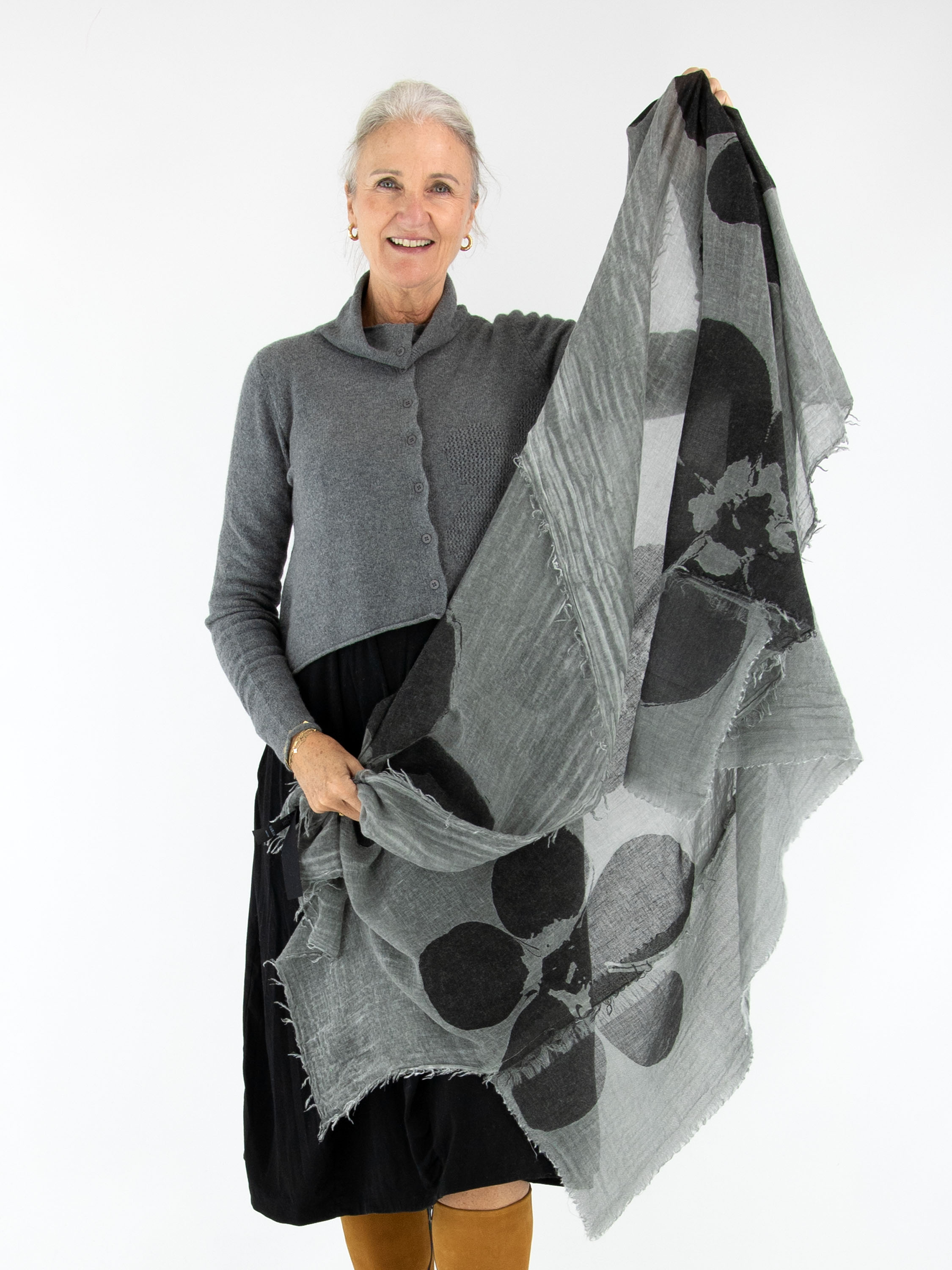 Leicht transparente Schal von Rundholz Black Label mit einem markanten Blumenprint in Schwarz auf grauem Hintergrund. Die Enden sind fein ausgefranst, und in zwei Ecken sorgen dekorative Ausschnitte für einen künstlerischen Akzent. Dieses exklusive Damenaccessoire kann von Hand gewaschen werden.