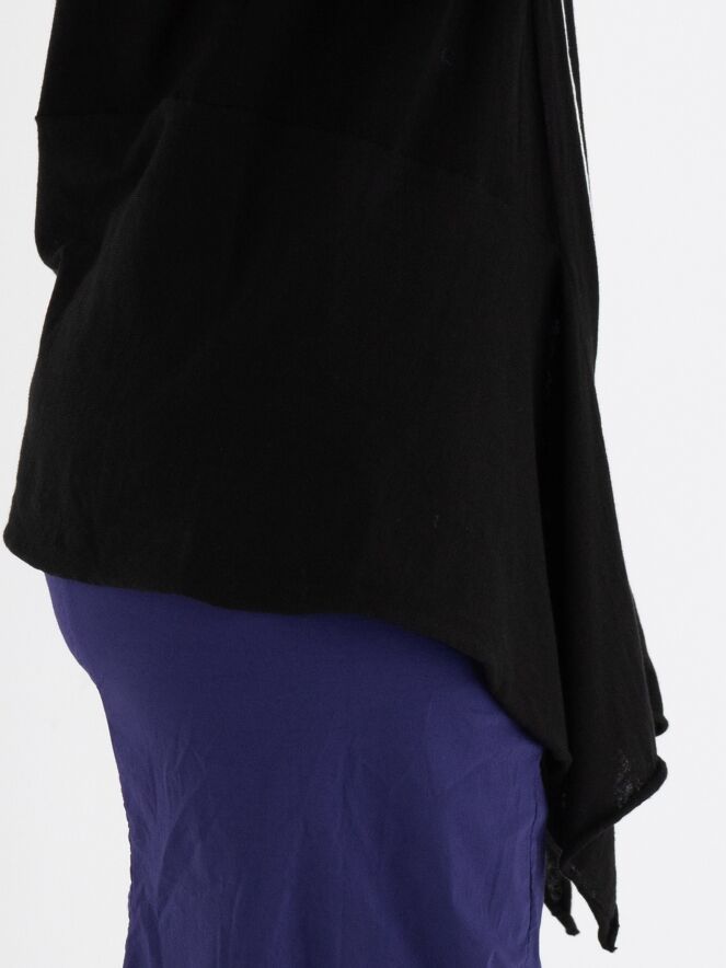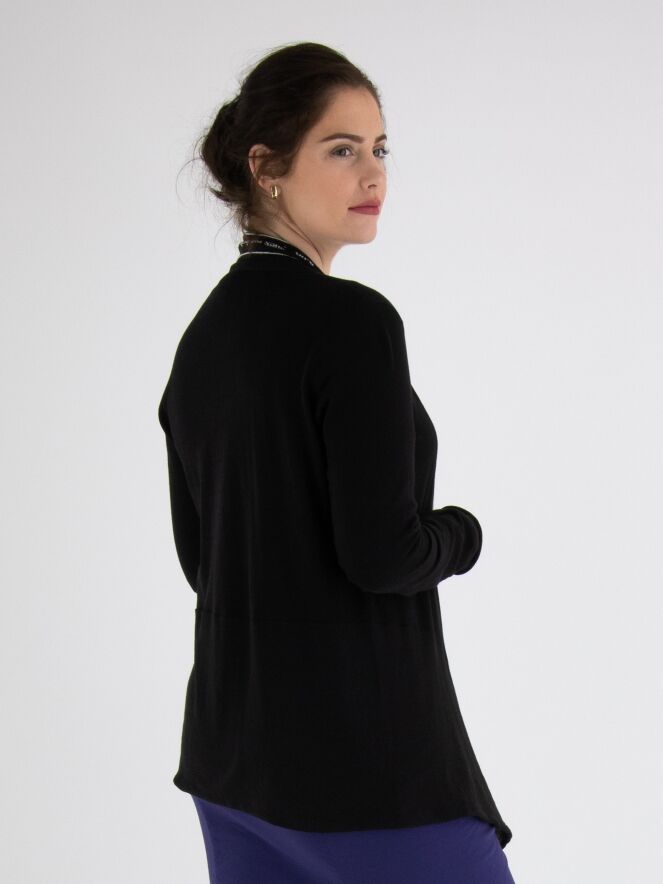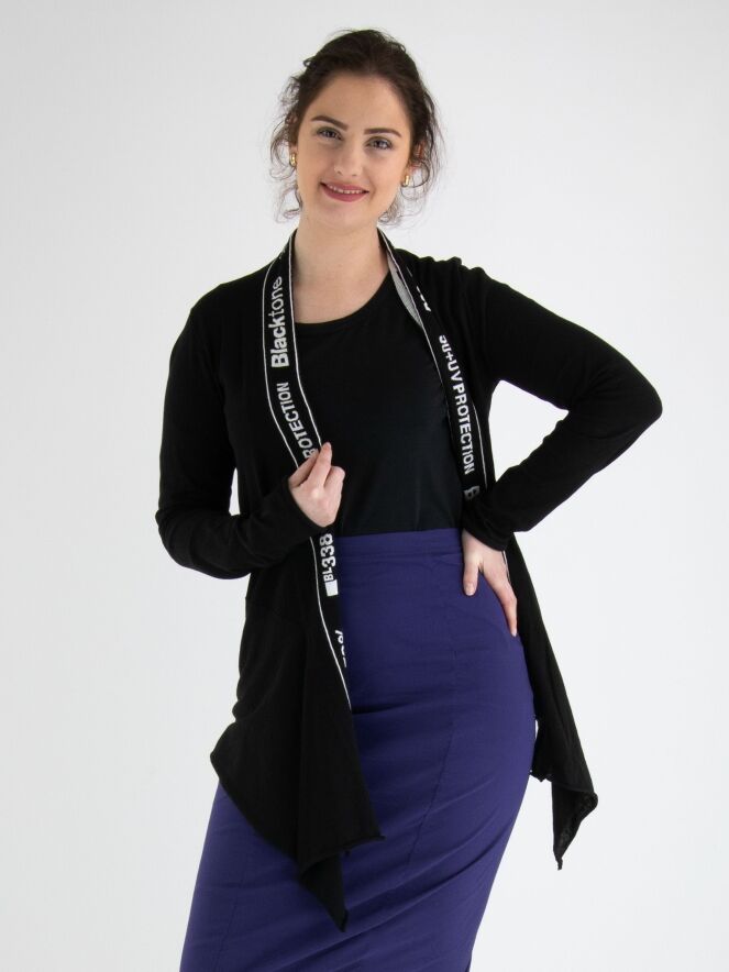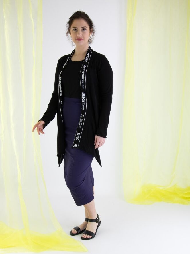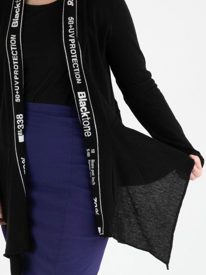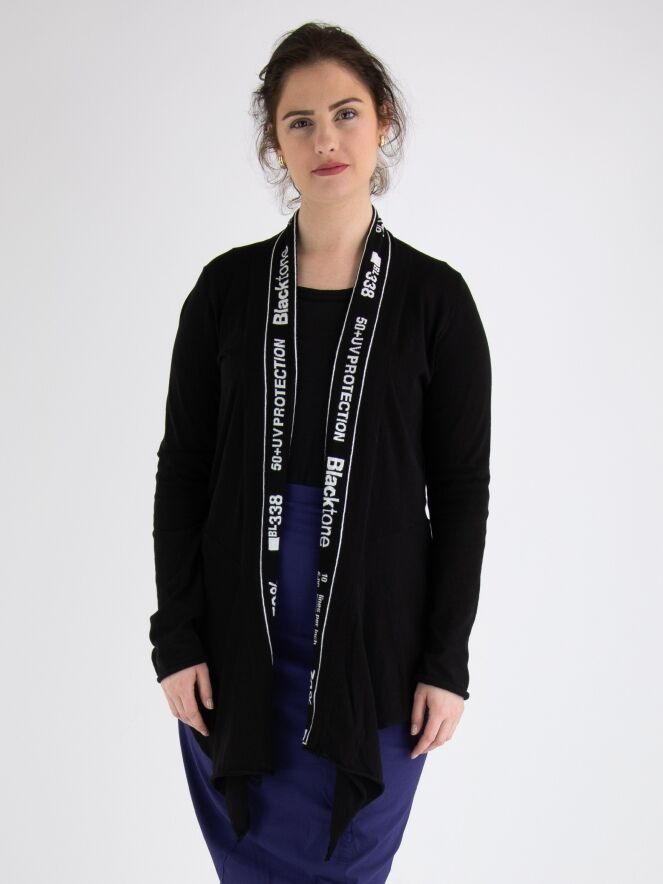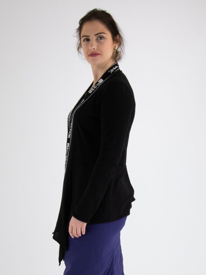 Ein leicht transparentes Weste von Rundholz Black Label in Schwarz. Die Weste hat keinen Verschluss, und entlang des Kragens verläuft ein breites Band mit einem Schwarz-Weiß-Buchstabenmuster bis zum unteren Rand der Weste. Die Weste hat lange Ärmel und kann von Hand gewaschen werden.