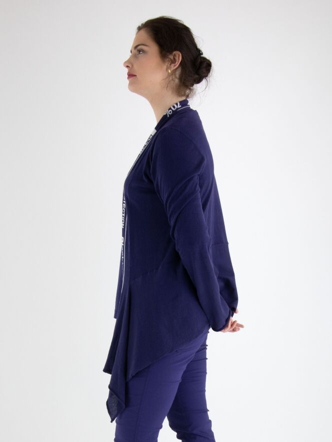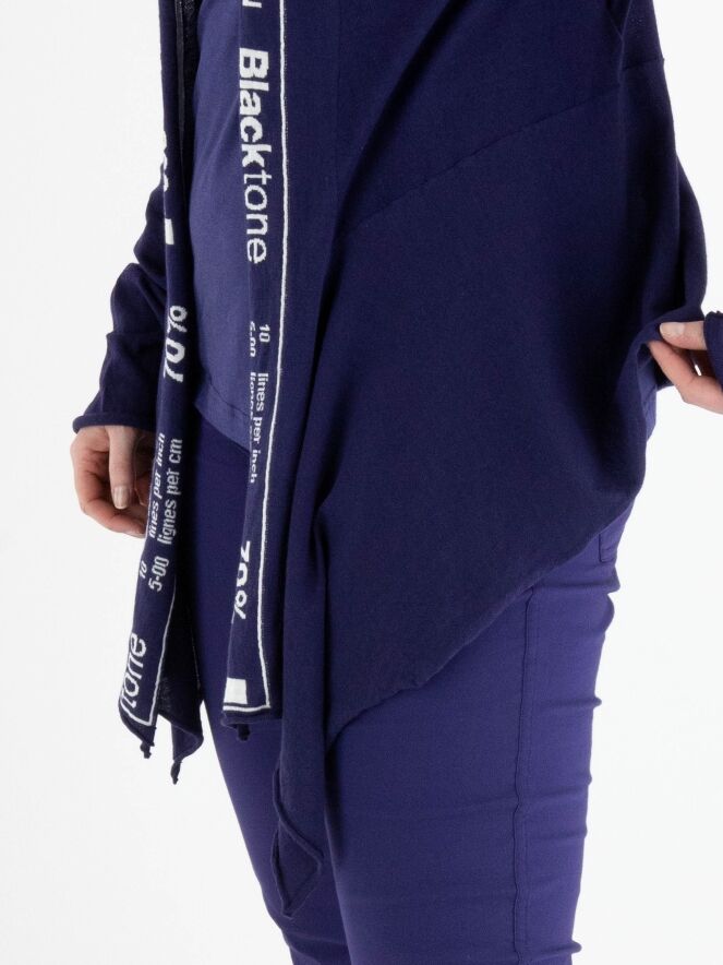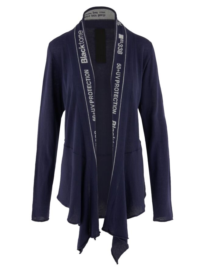Ein leicht transparentes Weste von Rundholz Black Label in Indigoblau. Die Weste hat keinen Verschluss, und entlang des Kragens verläuft ein breites Band mit einem Indigoblau-Weiß-Buchstabenmuster bis zum unteren Rand der Weste. Die Weste hat lange Ärmel und kann von Hand gewaschen werden.
