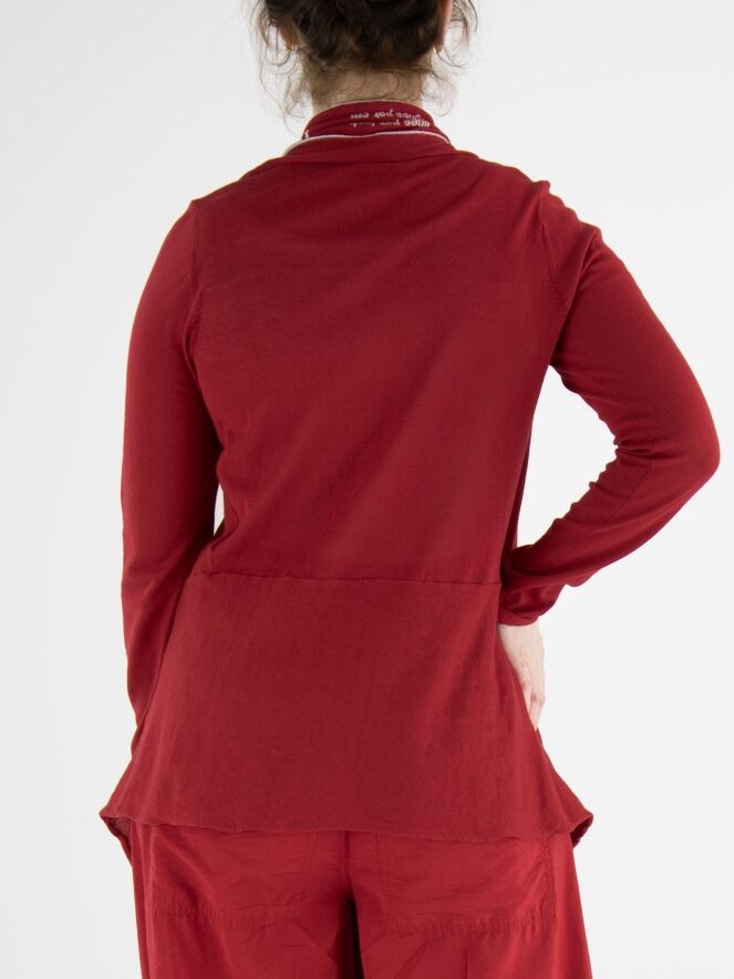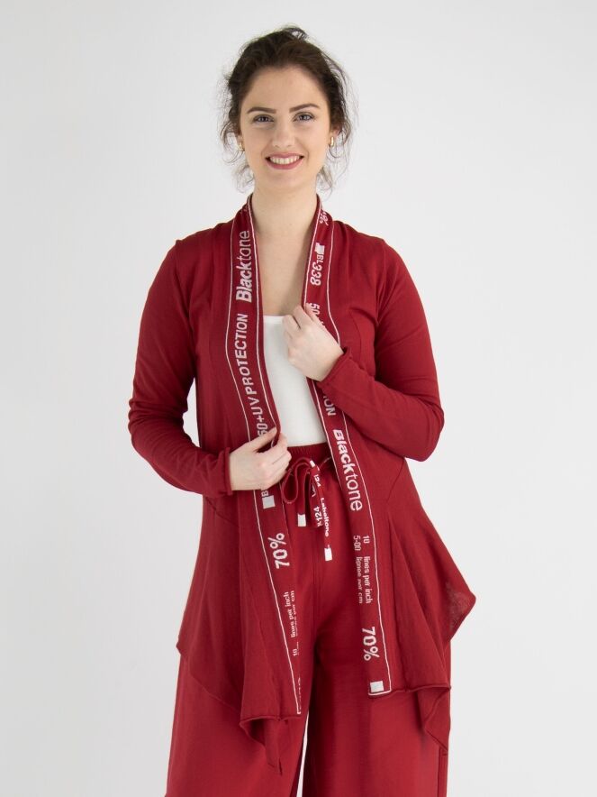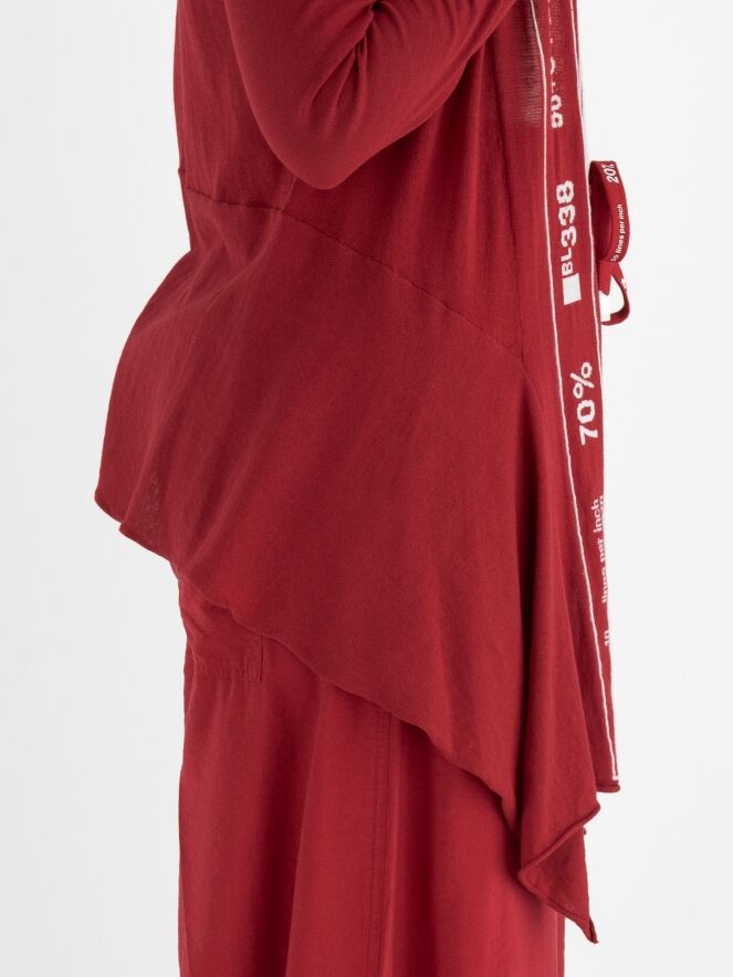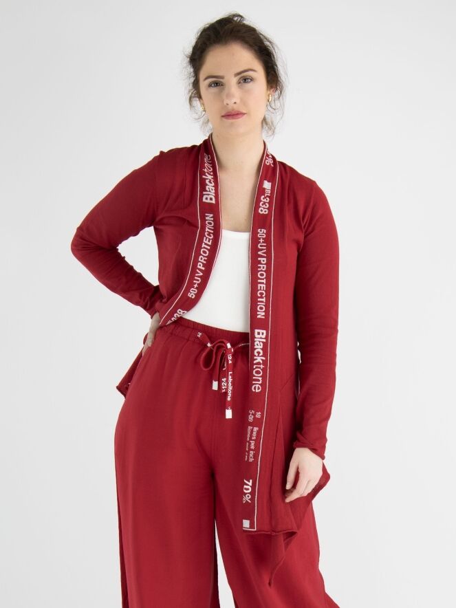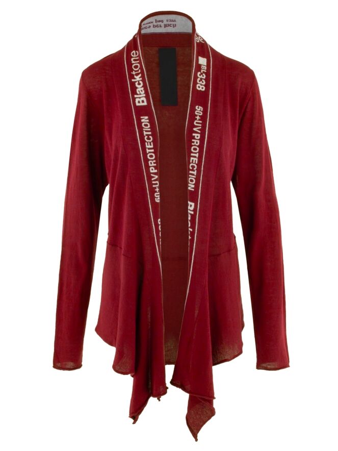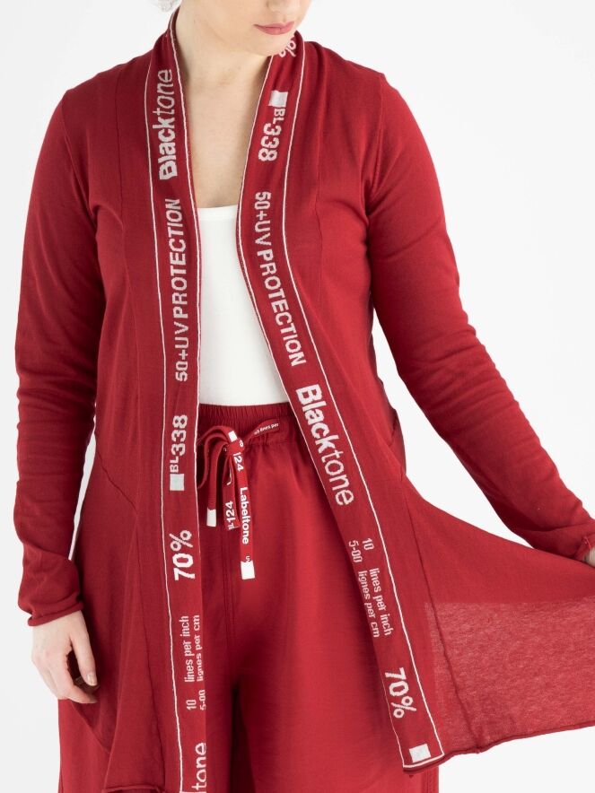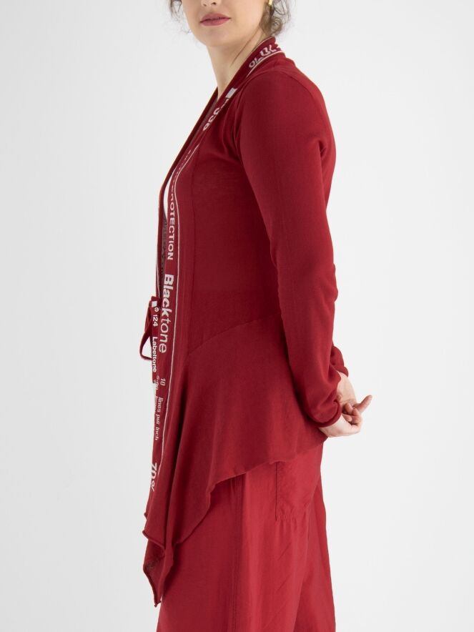 Ein leicht transparentes Weste von Rundholz Black Label in Rot. Die Weste hat keinen Verschluss, und entlang des Kragens verläuft ein breites Band mit einem Rot-Weiß-Buchstabenmuster bis zum unteren Rand der Weste. Die Weste hat lange Ärmel und kann von Hand gewaschen werden.
