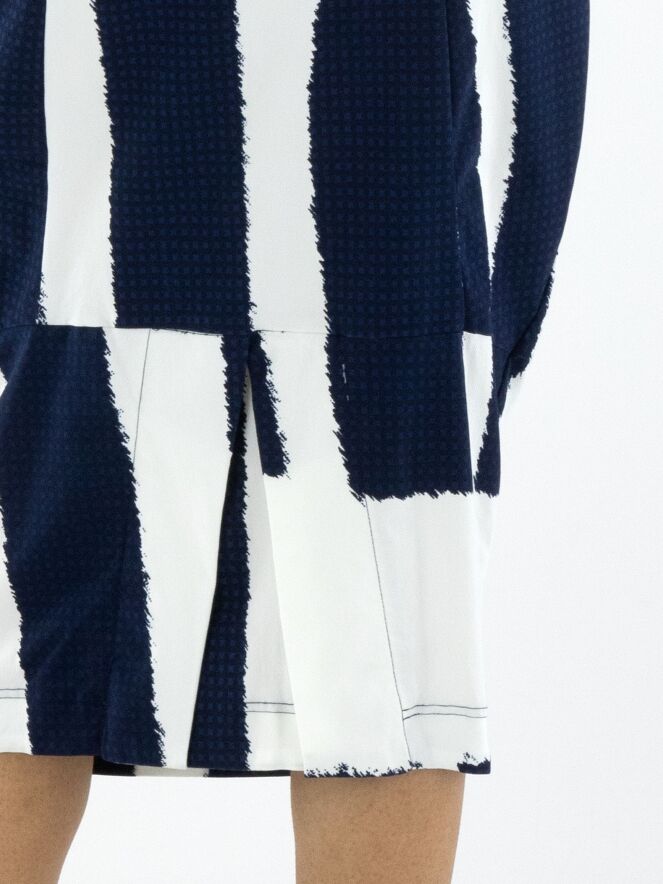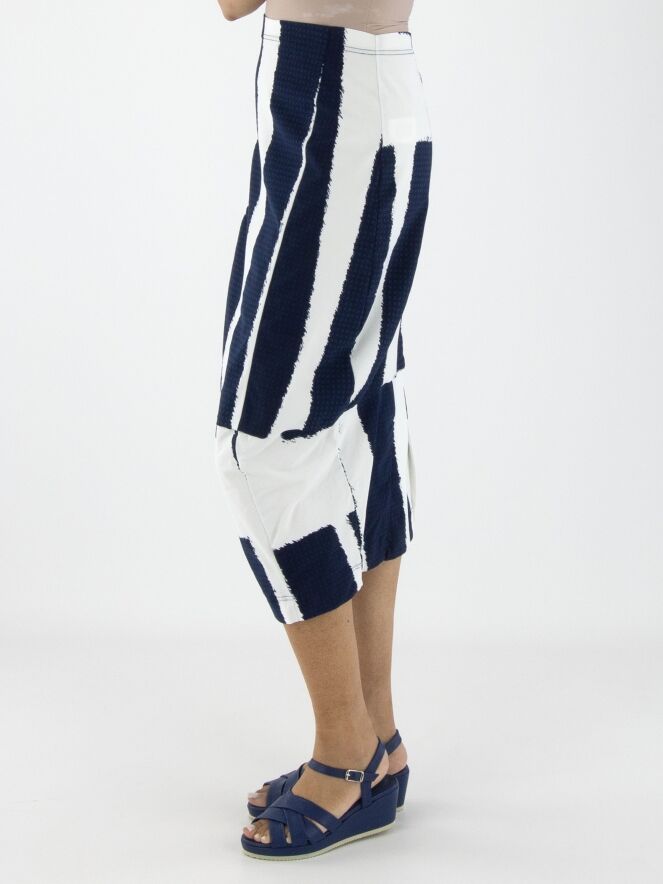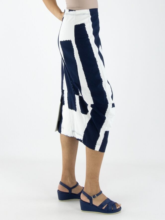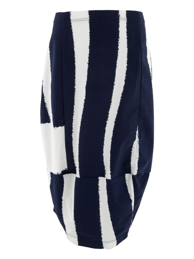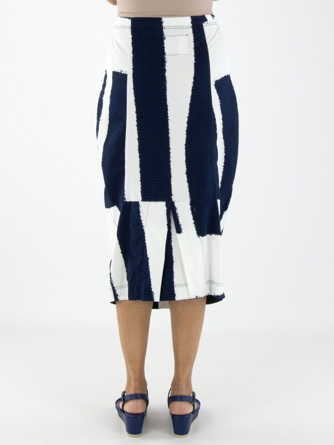 Ein Rock von Rundholz Black Label mit einem Print aus mehreren Flächen mit feinem Karomuster in Marineblau, kombiniert mit uni cremeweißen Partien mit einem Hauch von Eisblau. Der Bund ist elastisch. Der Rock läuft nach unten schmal zu und ist ungefüttert. Dieser Rock kann bei 30 Grad gewaschen werden.