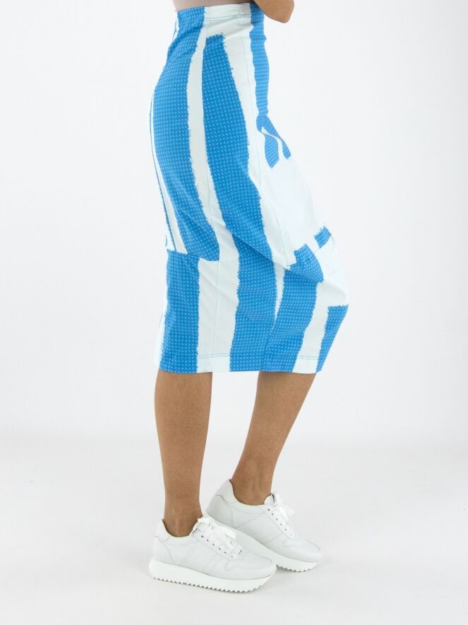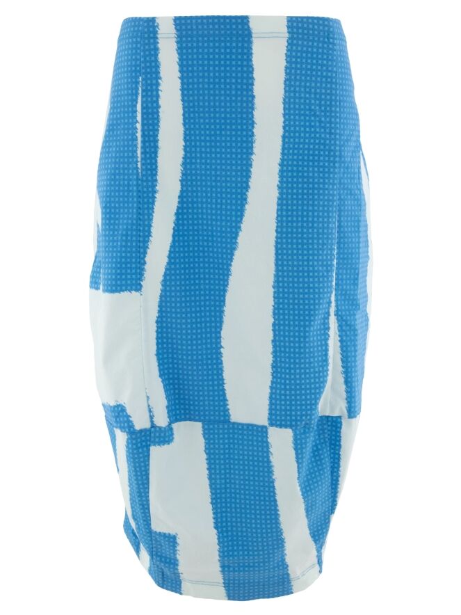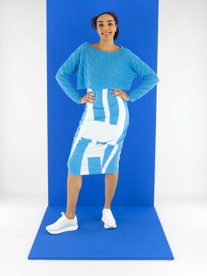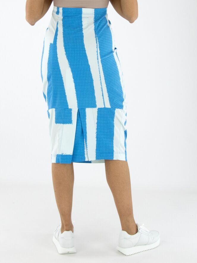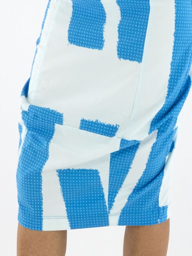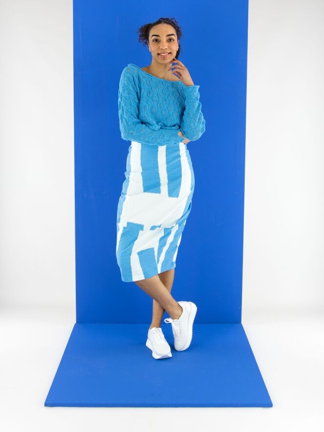 Ein Rock von Rundholz Black Label mit einem Print aus mehreren Flächen feiner Karomuster in leuchtenden Blautönen, kombiniert mit Partien in Uni-Cremeweiß mit einem zarten Hauch von Eisblau. Der Bund ist elastisch. Der Rock verläuft nach unten hin schmaler und ist ungefüttert. Dieser Rock kann bei 30 Grad gewaschen werden.