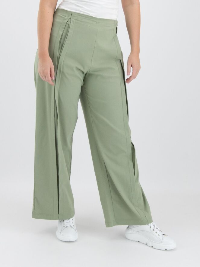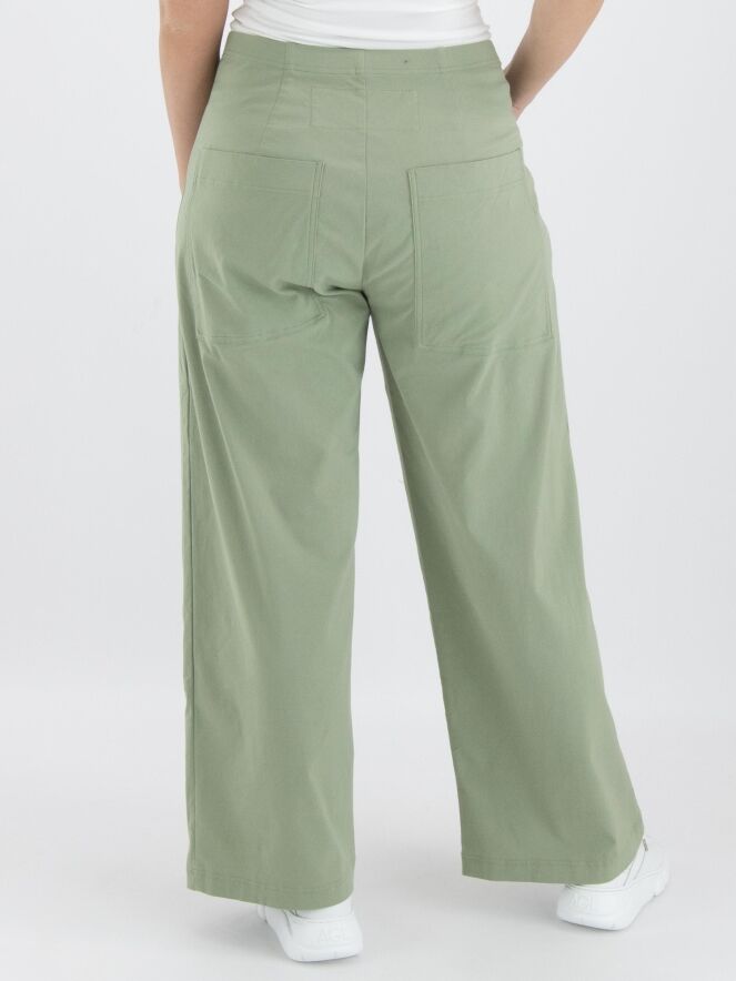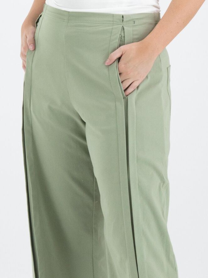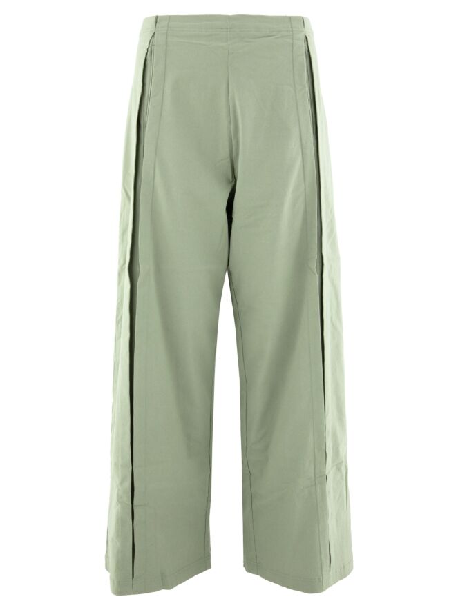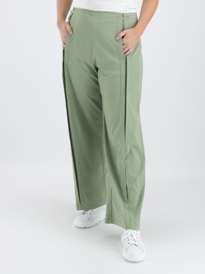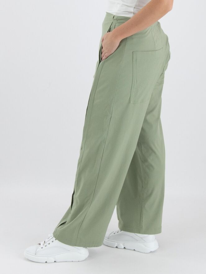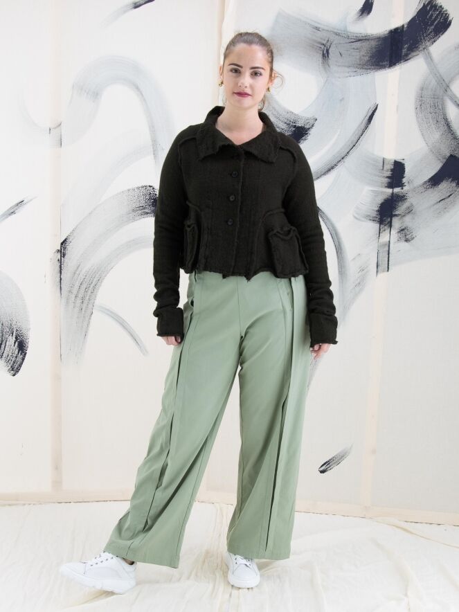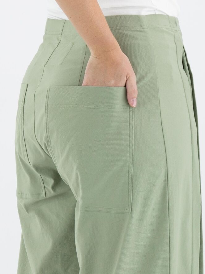 Eine Hose von Rundholz Black Label in einer sanften Olivfarbe. An der Vorderseite, etwas seitlich von der Mitte, befinden sich zwei vertikale umgekehrte Falten, die offen stehen, mit darunterliegenden Eingrifftaschen unterhalb der Taille. In der Taille befindet sich ein Gummiband. Auf der Rückseite befinden sich große, geräumige Taschen. Diese Hose kann bei 30 Grad gewaschen werden.