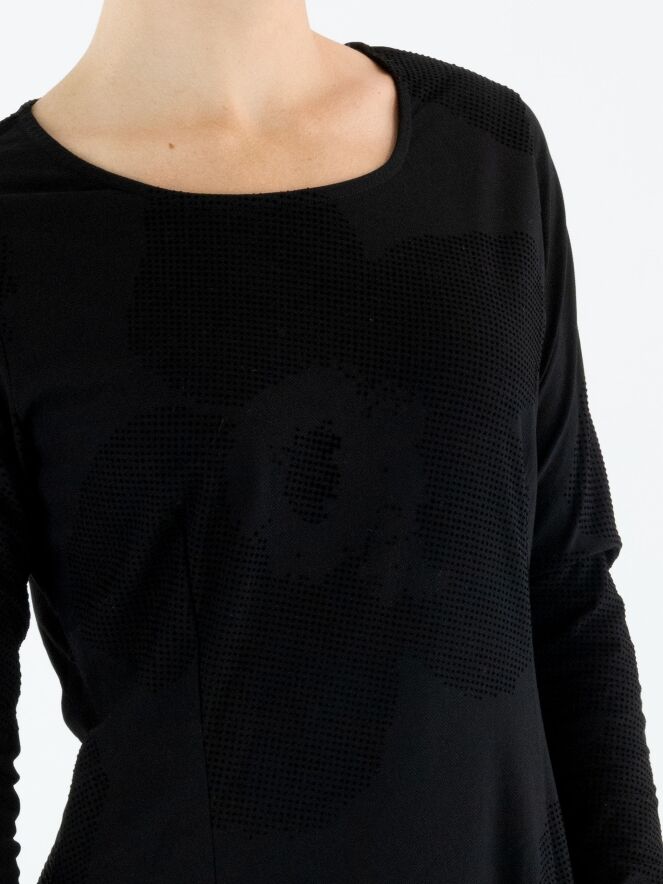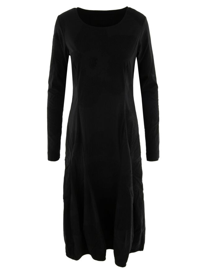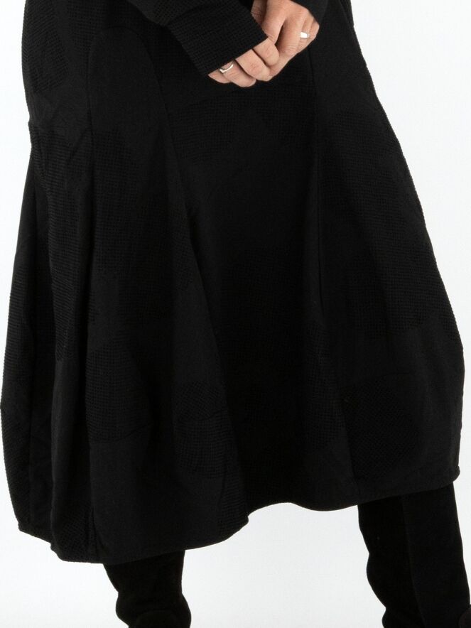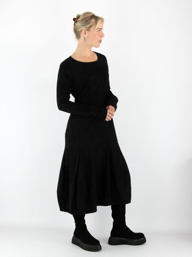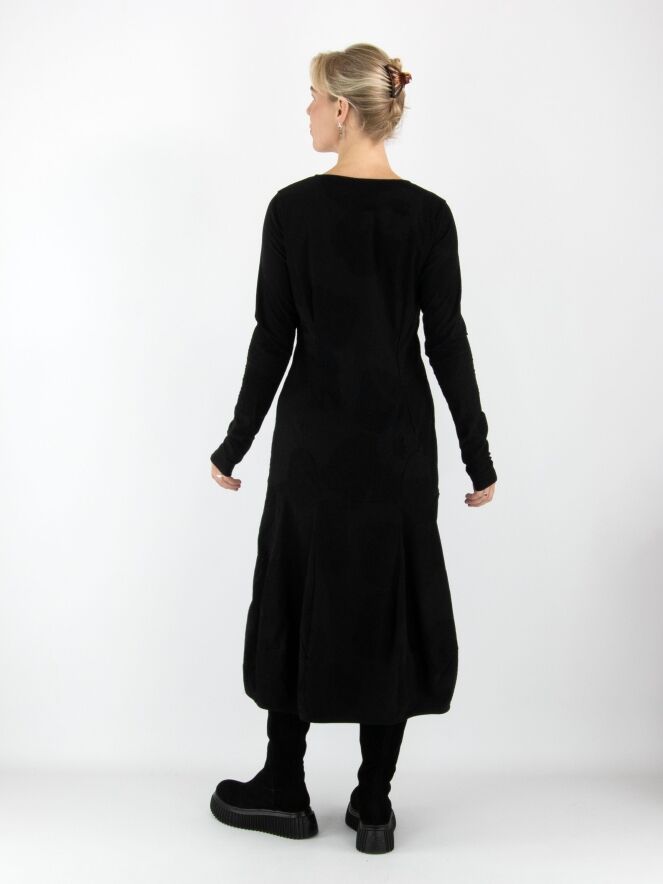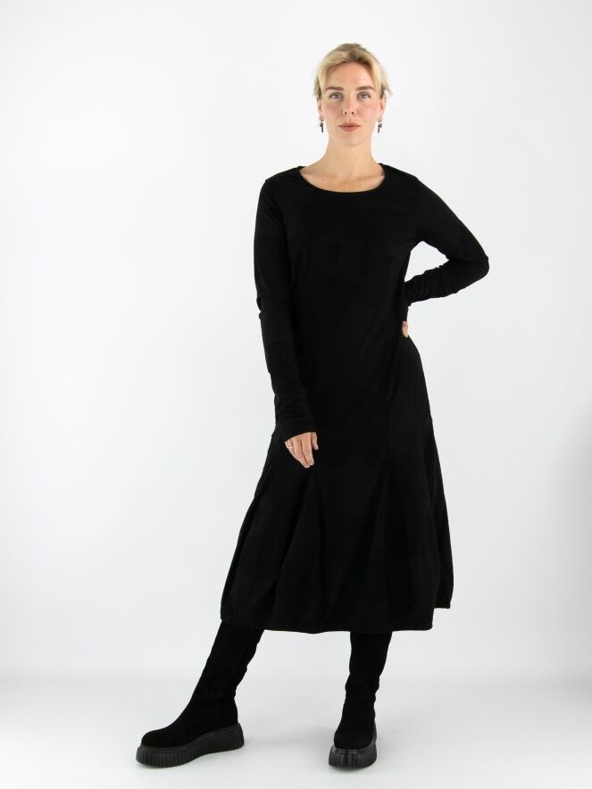 Ein Kleid von Rundholz Black Label in Schwarz. Der Stoff hat eine sehr feine Rippstruktur mit zarten Samtpunkten über das gesamte Kleid verteilt. Das Kleid hat einen Rundhalsausschnitt und geht ab der Taille in eine Ballonform über. Dieses Kleid kann bei 30 Grad gewaschen werden.