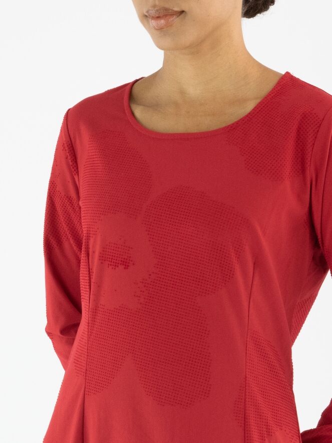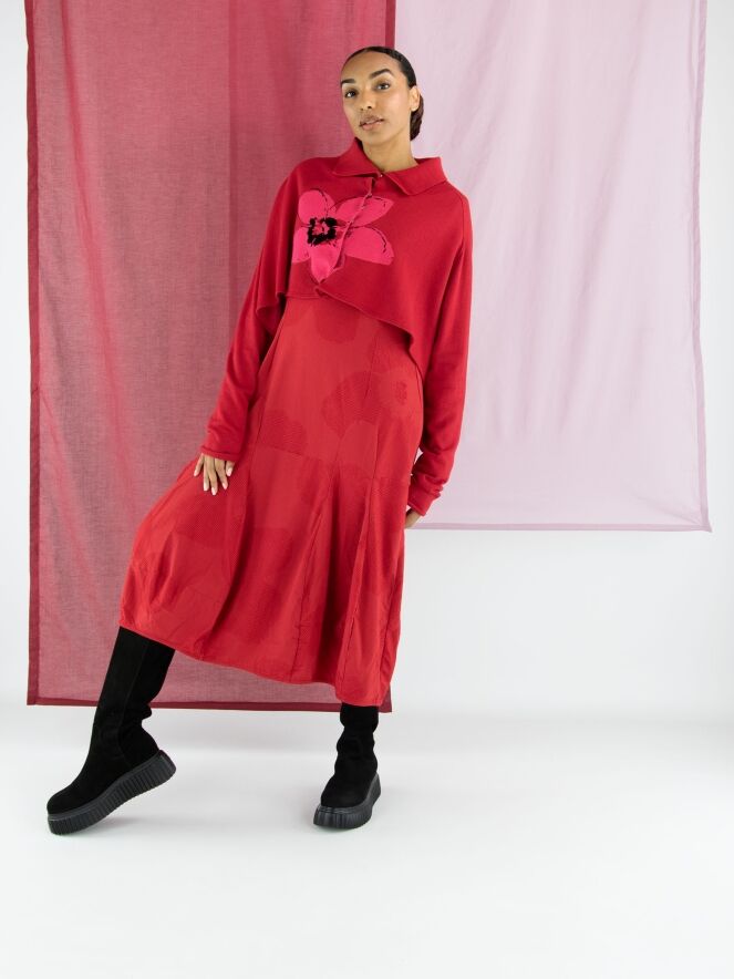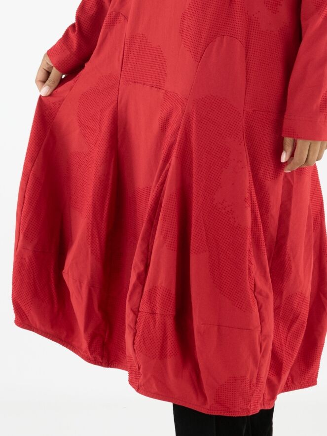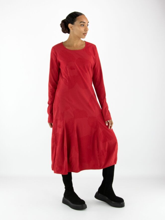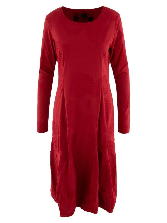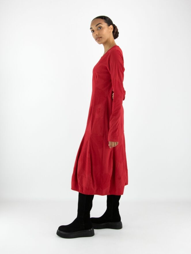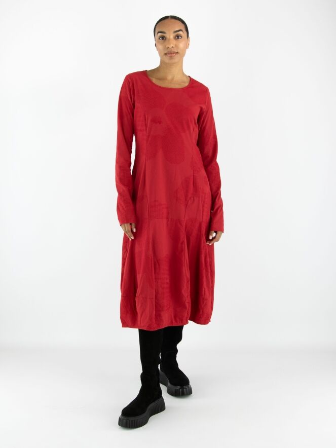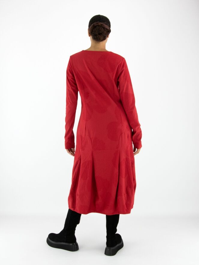Ein Kleid von Rundholz Black Label in Rot. Der Stoff hat eine sehr feine Rippstruktur und ist über das gesamte Kleid hinweg mit kleinen Velours-Punkten versehen. Das Kleid hat einen runden Halsausschnitt und eine Ballonform ab der Taille. Dieses Kleid kann bei 30 Grad gewaschen werden.