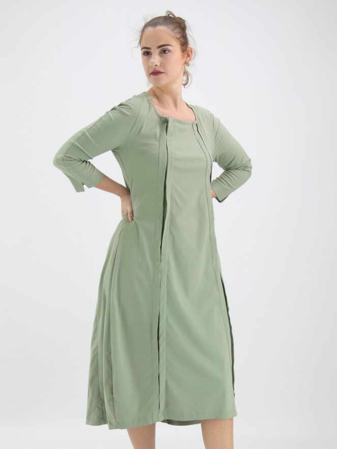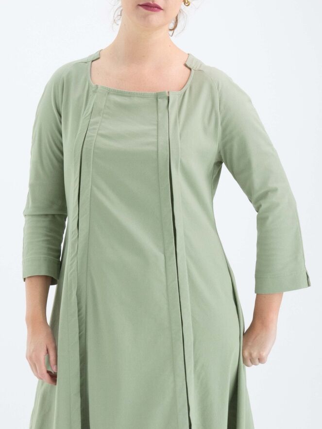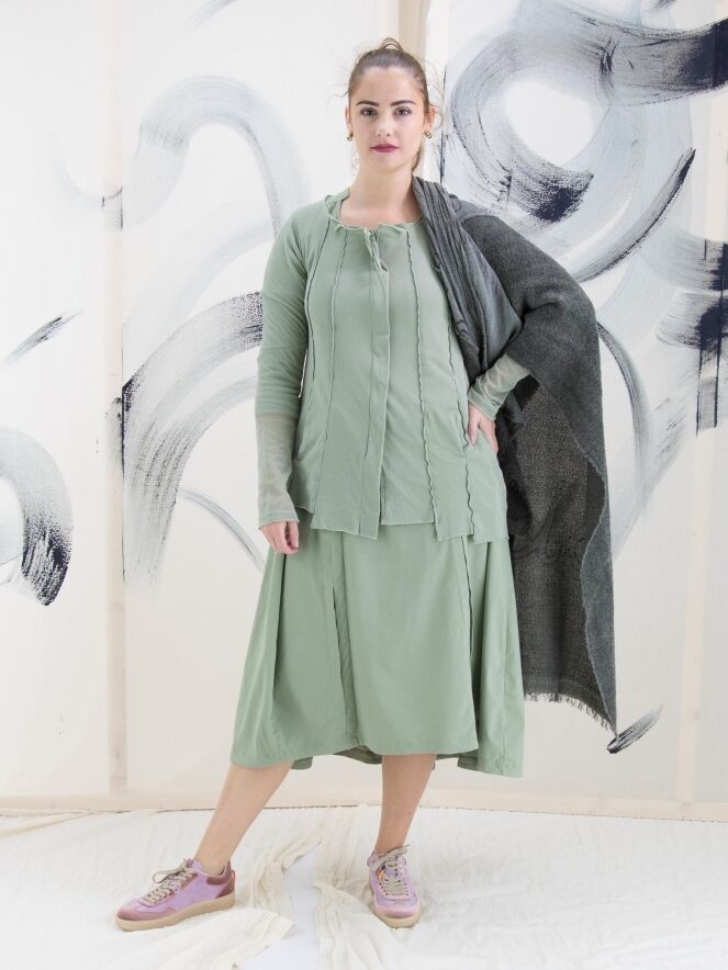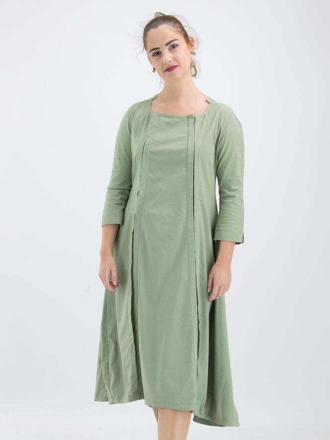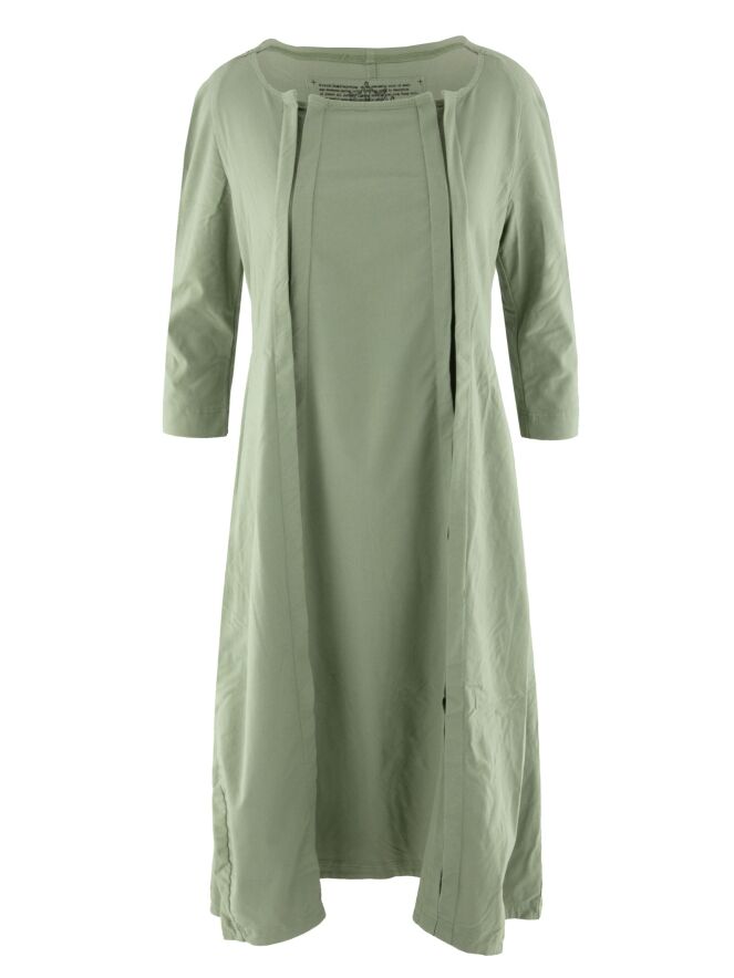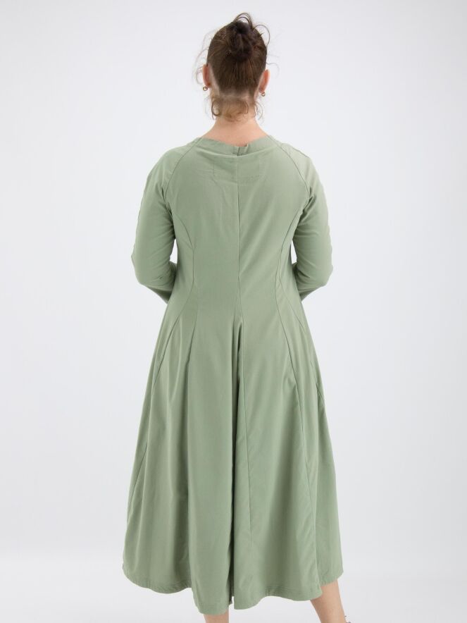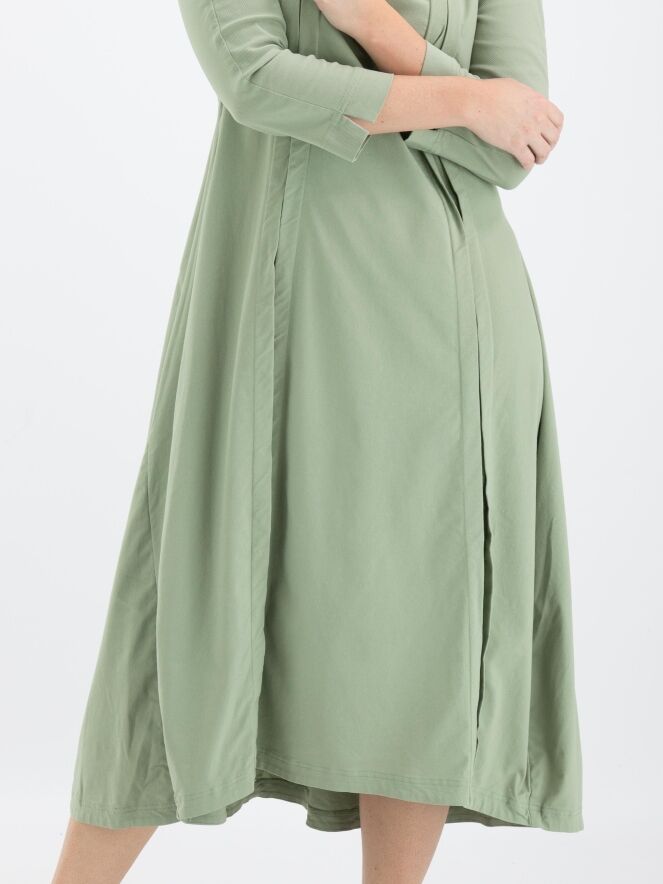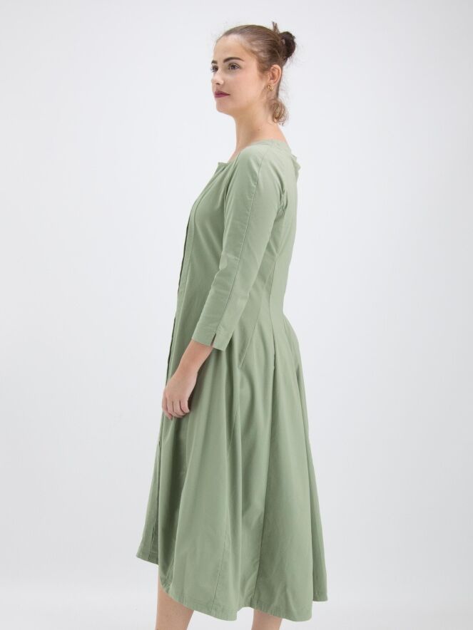 Ein Kleid von Rundholz Black Label in weichem Olivgrün. An der Vorderseite befinden sich zwei vertikale, umgekehrte Falten, die offen stehen. Das Kleid hat eine leichte Taillenlinie und eine Ballonform ab der Taille. Der breite Ausschnitt hat von den Seiten bis nach hinten eine kleine Erhöhung. Am Ende der halblangen Ärmel befindet sich ein kurzer Schlitz. Dieses Kleid kann bei 30 Grad gewaschen werden.