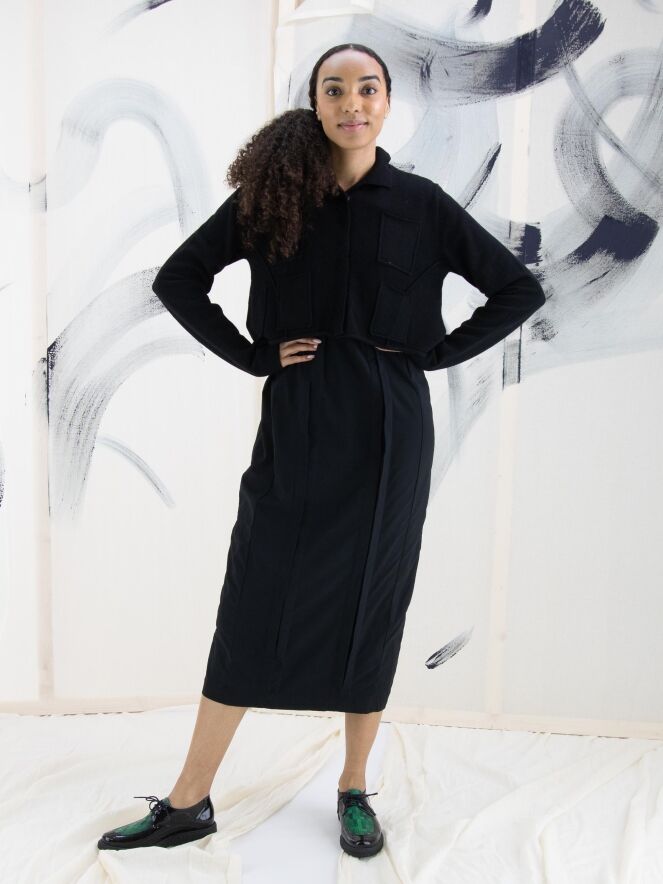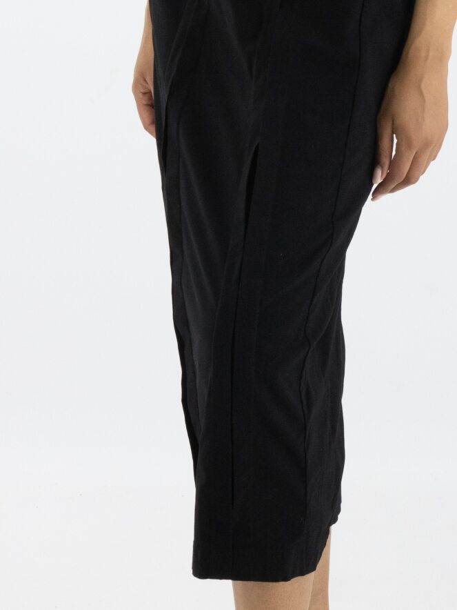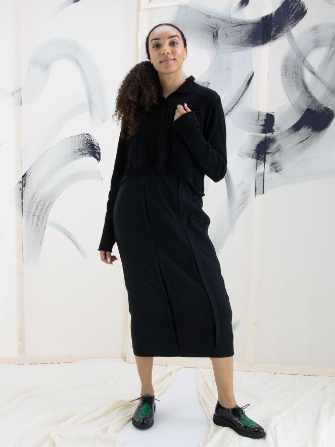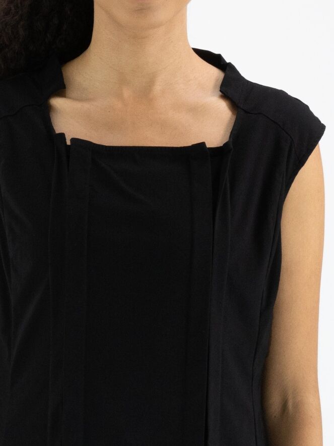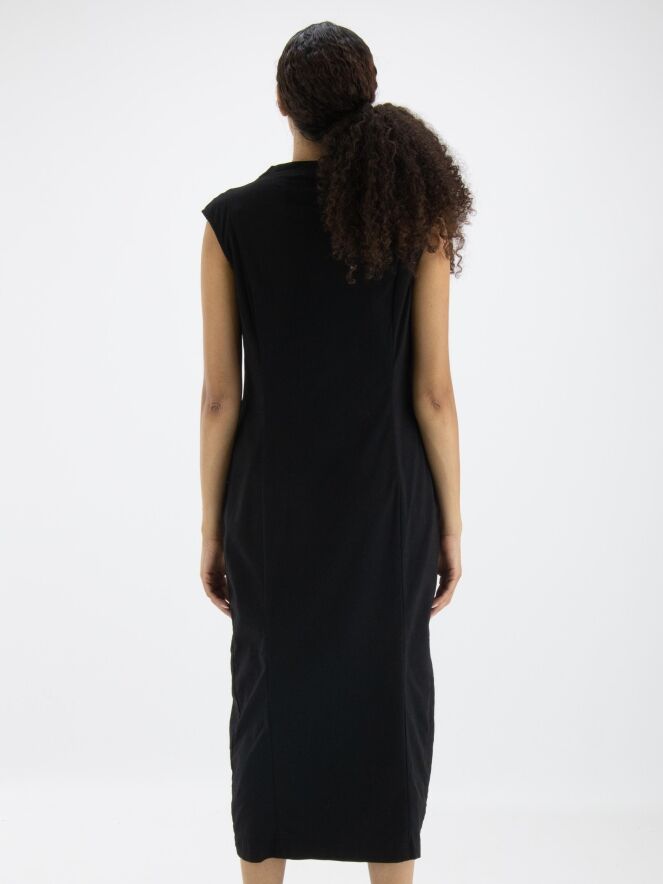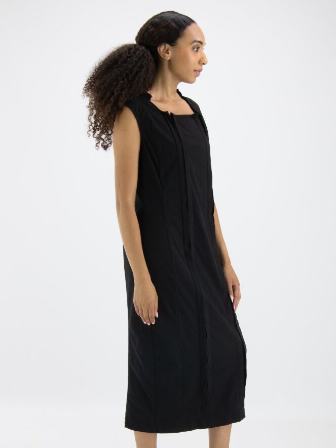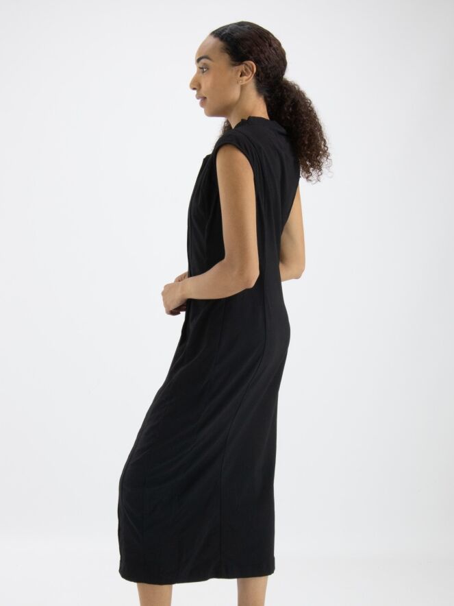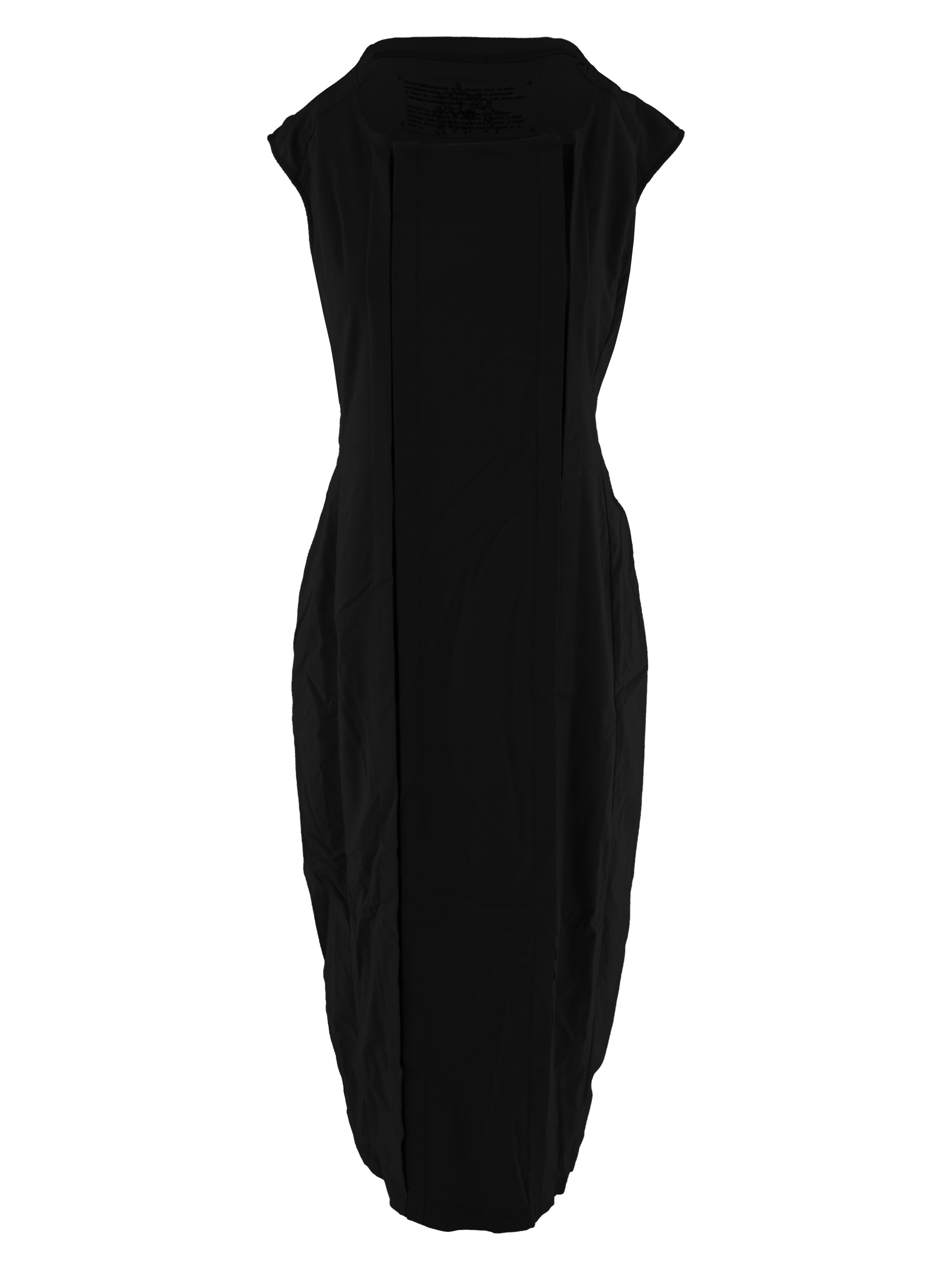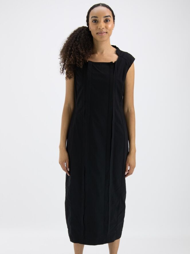Ein Kleid von Rundholz Black Label in schwarzer Farbe. An der Vorderseite befinden sich zwei vertikale umgekehrte Falten, die offen stehen. Das Kleid hat eine leichte Taillenlinie. Der breite Ausschnitt hat an den Seiten bis nach hinten eine kleine Erhöhung. Dieses Kleid kann bei 30 Grad gewaschen werden.