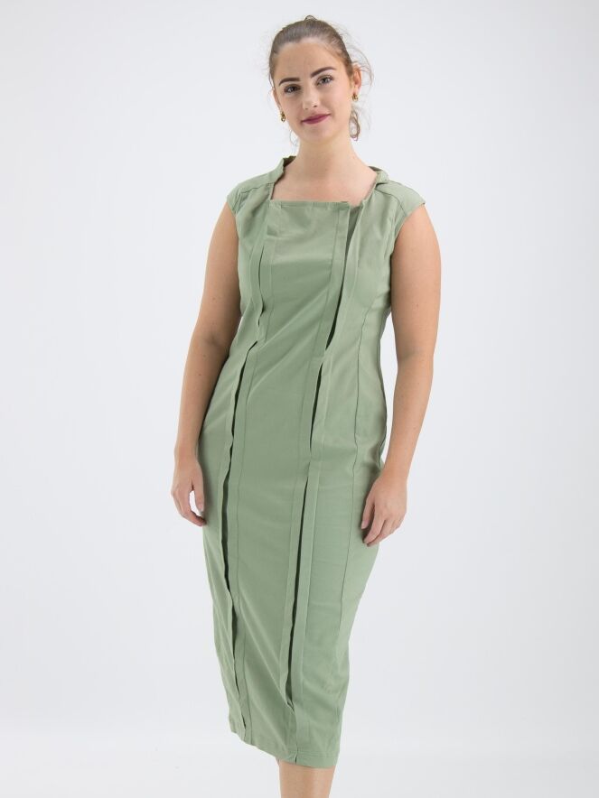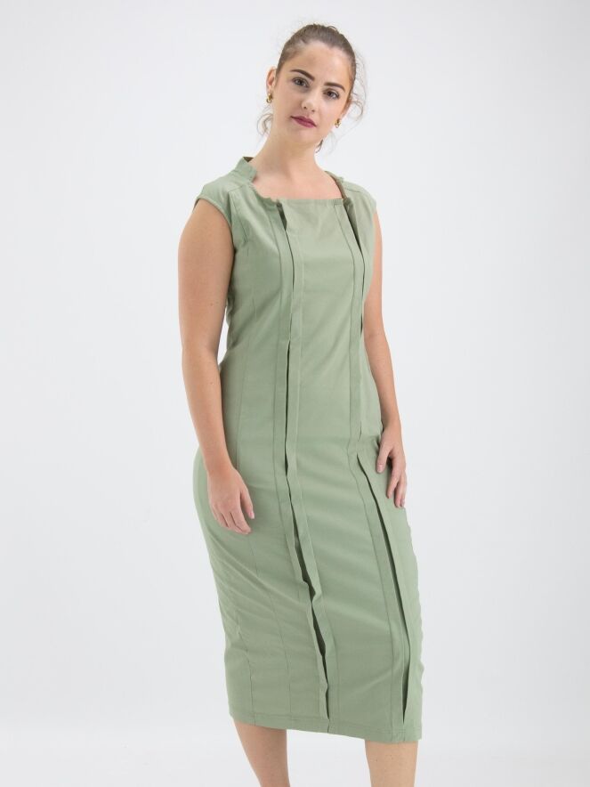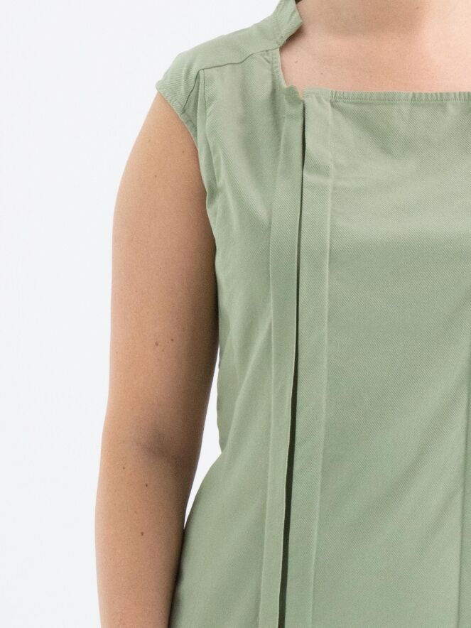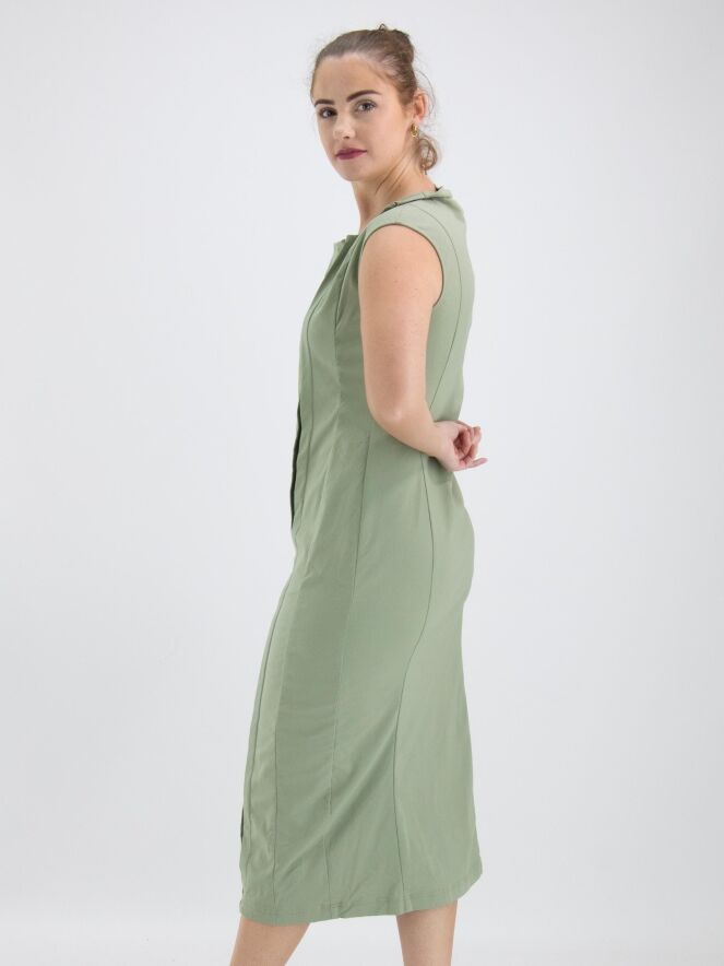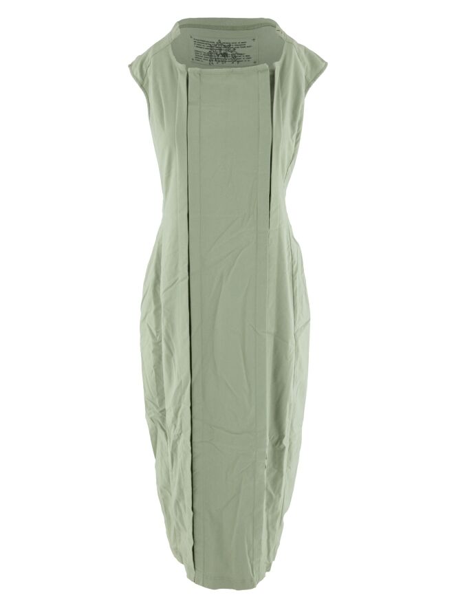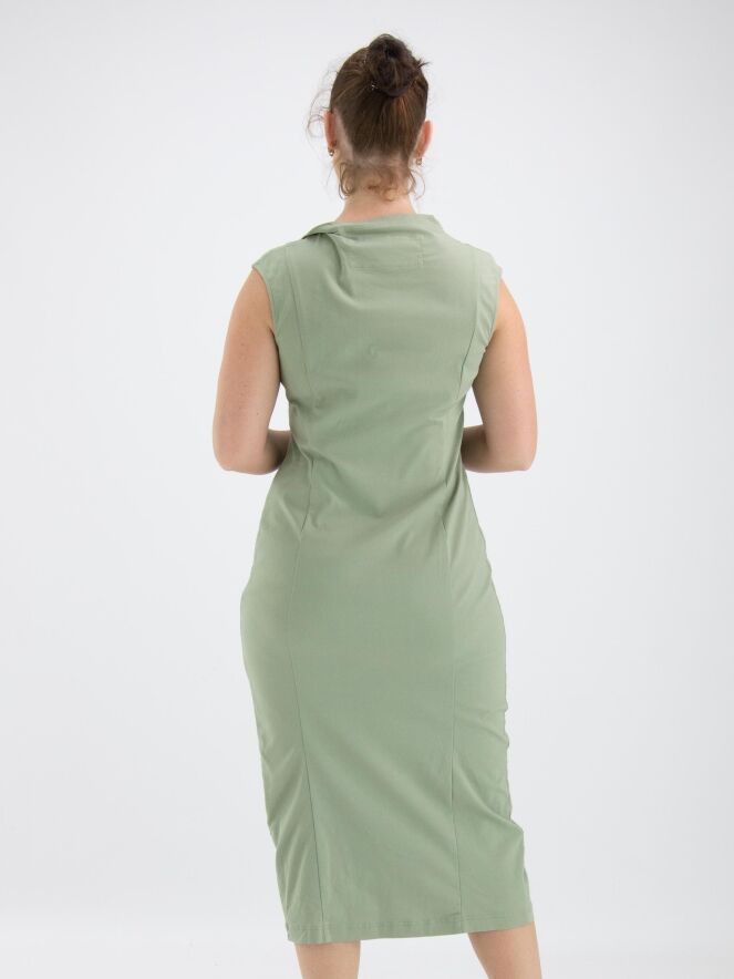 A dress by Rundholz Black Label in a soft olive color. At the front, there are two vertical inverted pleats that remain open. The dress has a slight waistline. The wide neckline has a small elevation from the sides to the back. This dress can be washed at 30 degrees.
