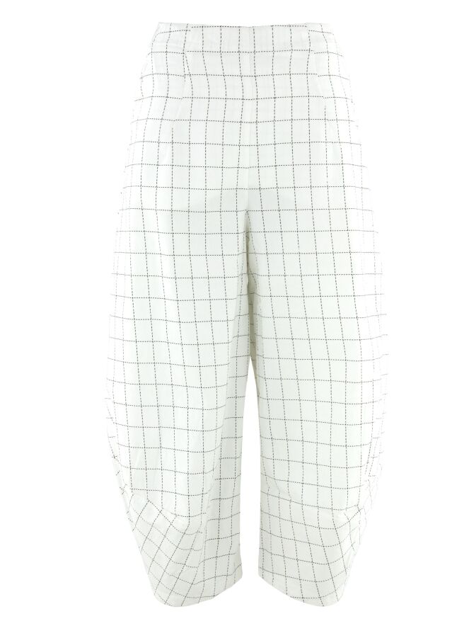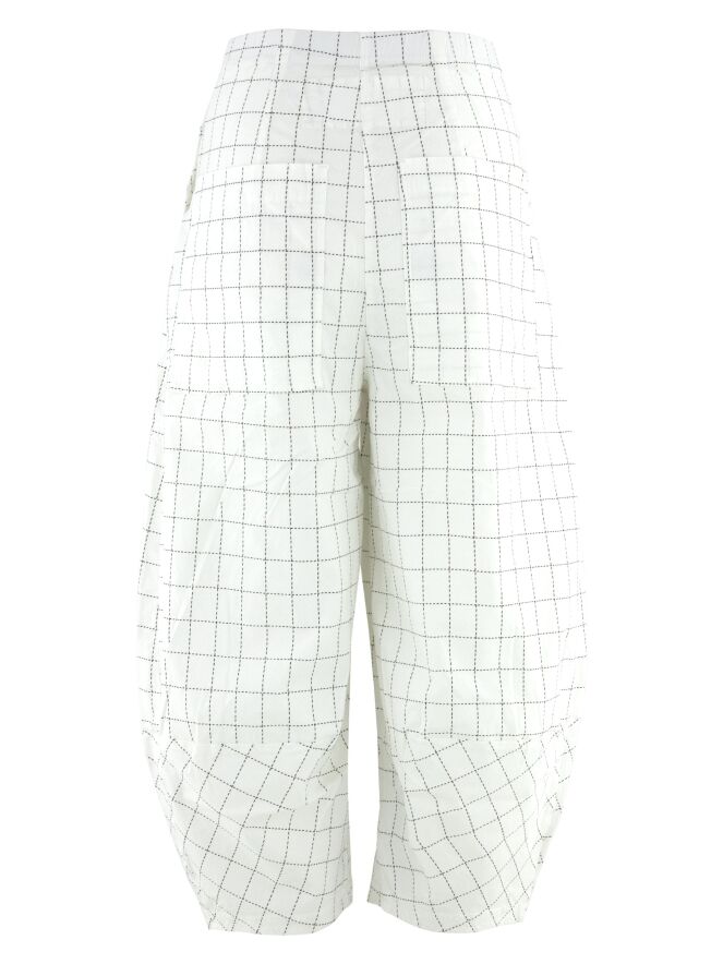 Hose von Rundholz Black Label mit gestreiftem Blockmuster aus schwarzen Linien auf weißem Grund. Vorderseitig sind große, geräumige Taschen eingearbeitet, die dem Modell eine markante, moderne Ausstrahlung verleihen. Die Hosenbeine laufen zum Saum hin leicht schmal zu. Diese Hose kann bei 30 Grad gewaschen werden.