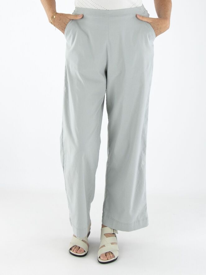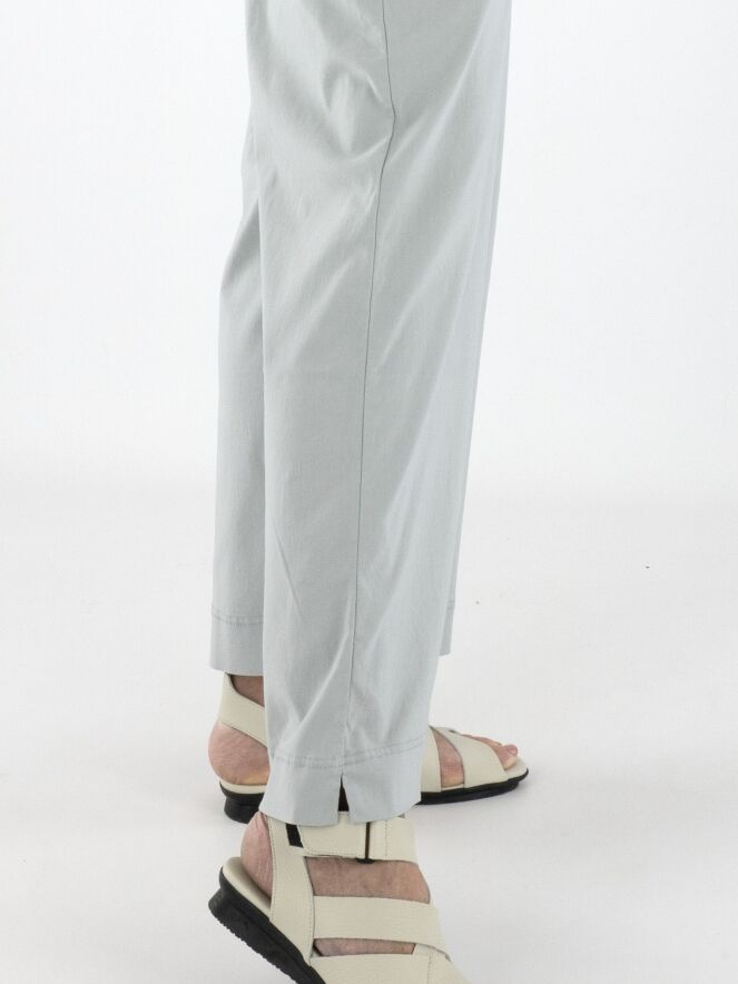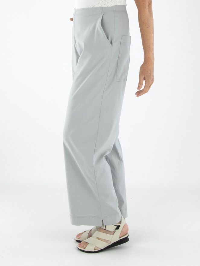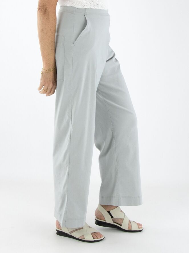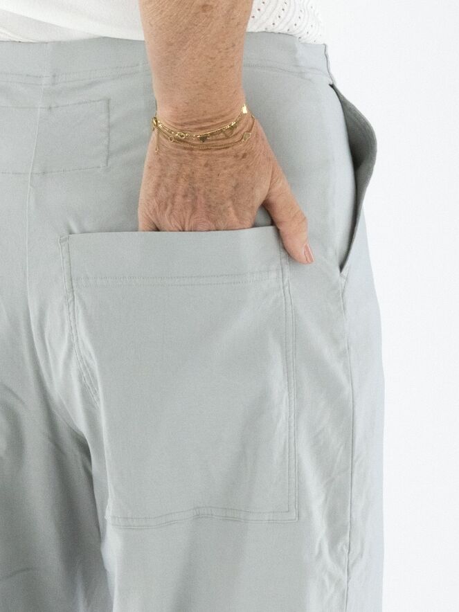 Eine Hose von Rundholz Black Label in Hellgrau. Der Bund ist elastisch. Die Hosenbeine sind gerade geschnitten, und die Hose hat seitliche Eingrifftaschen. Diese Hose kann bei 30 Grad gewaschen werden.