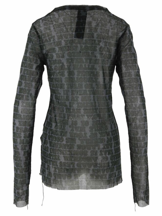 Ein transparentes Shirt der Designermarke Rundholz Black Label mit Buchstabenprint in Grün, Schwarz und Grau. Das Oberteil kommt mit einem runden Ausschnitt und langen Ärmeln. Dieses Shirt kann bei 30 Grad gewaschen werden.