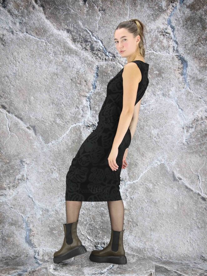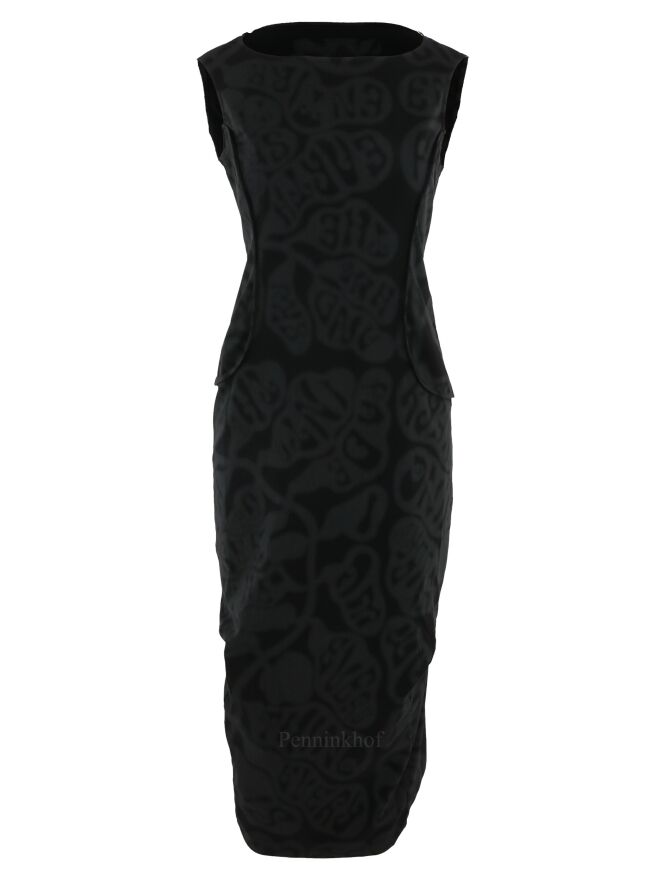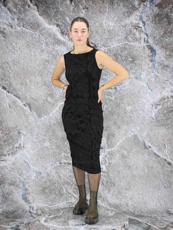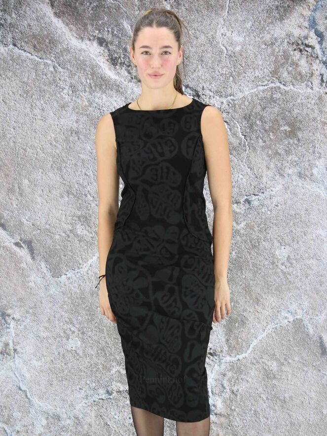 Ein Kleid der Designermarke Rundholz Black Label mit Barockprint in den Farben Grau und Schwarz. Das Kleid hat umgekehrte Taillennähte. Dieses Kleid kann bei 30 Grad in der Waschmaschine gewaschen werden.