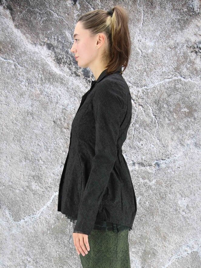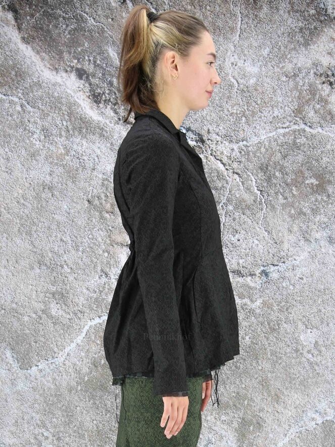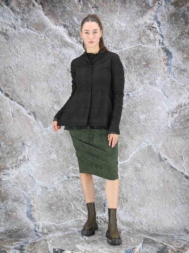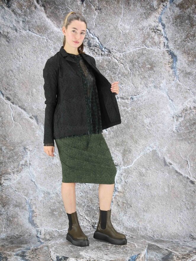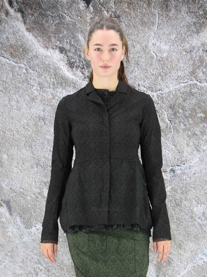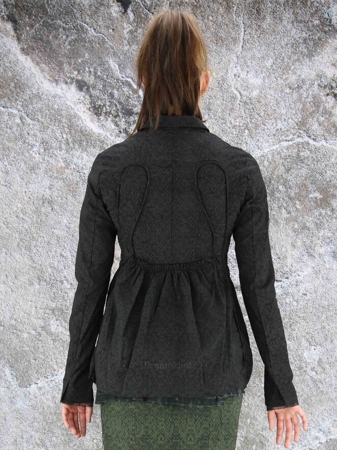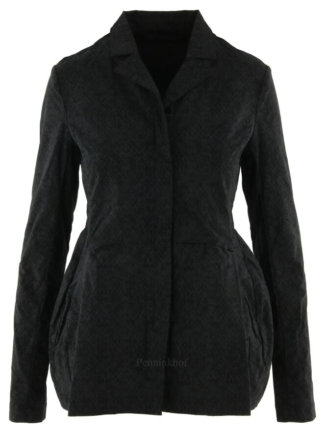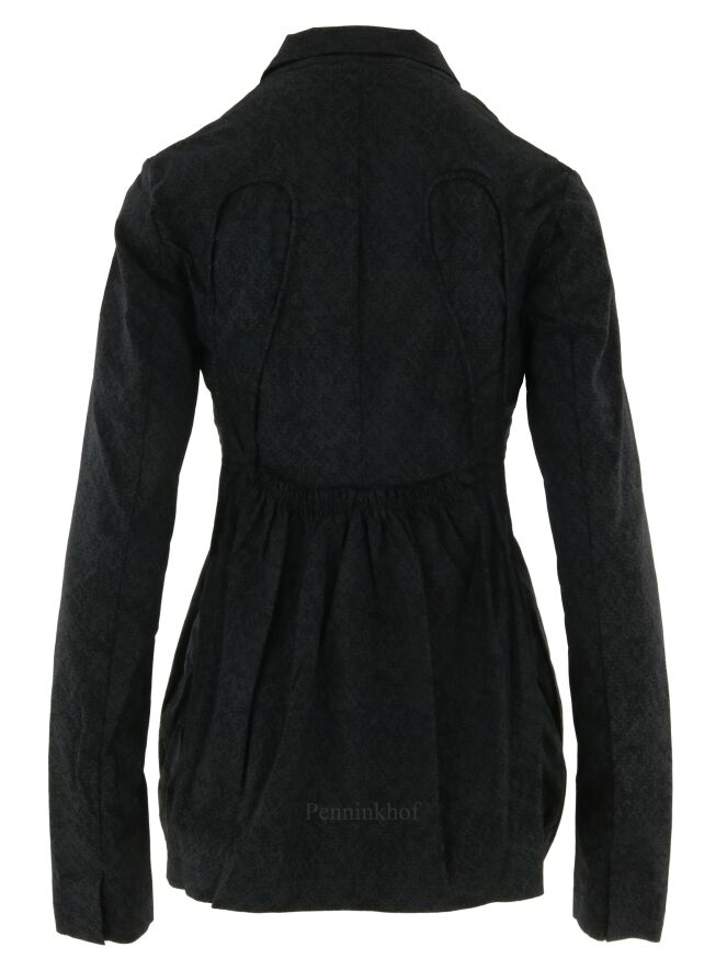 Ein Blazer der Designermarke Rundholz Black Label mit Print in den Farben Grau und Schwarz. Die Taille ist am Rücken mit einem leicht gerafften Gummizug versehen. Der Blazer hat einen verdeckten Reißverschluss. Dieser Blazer kann bei 30 Grad gewaschen werden.