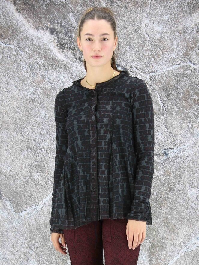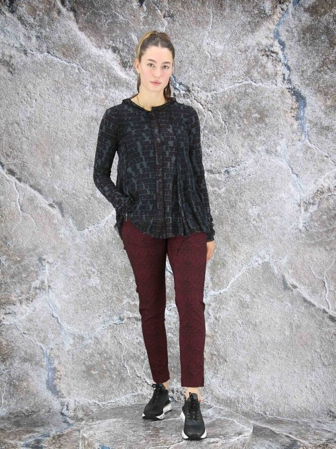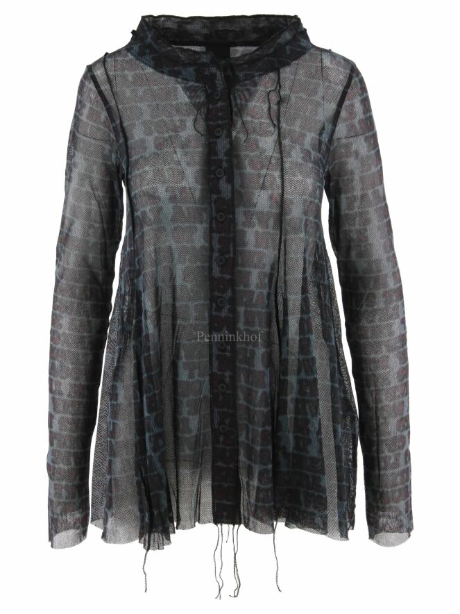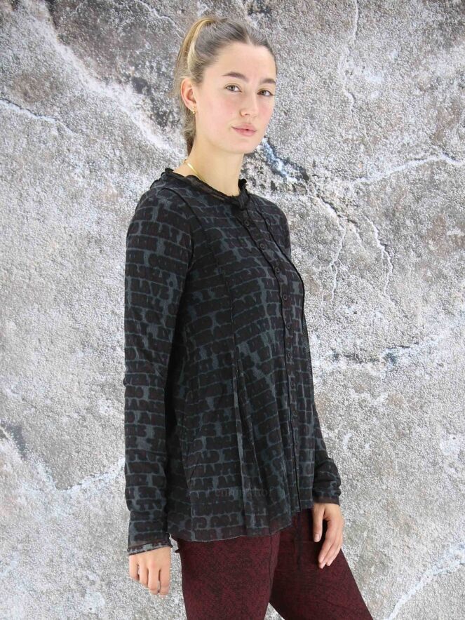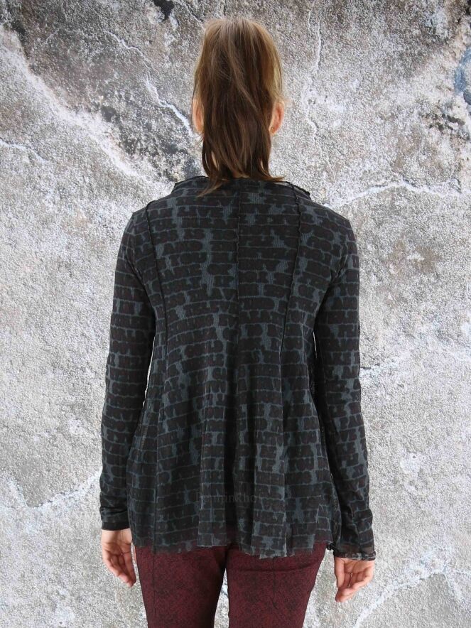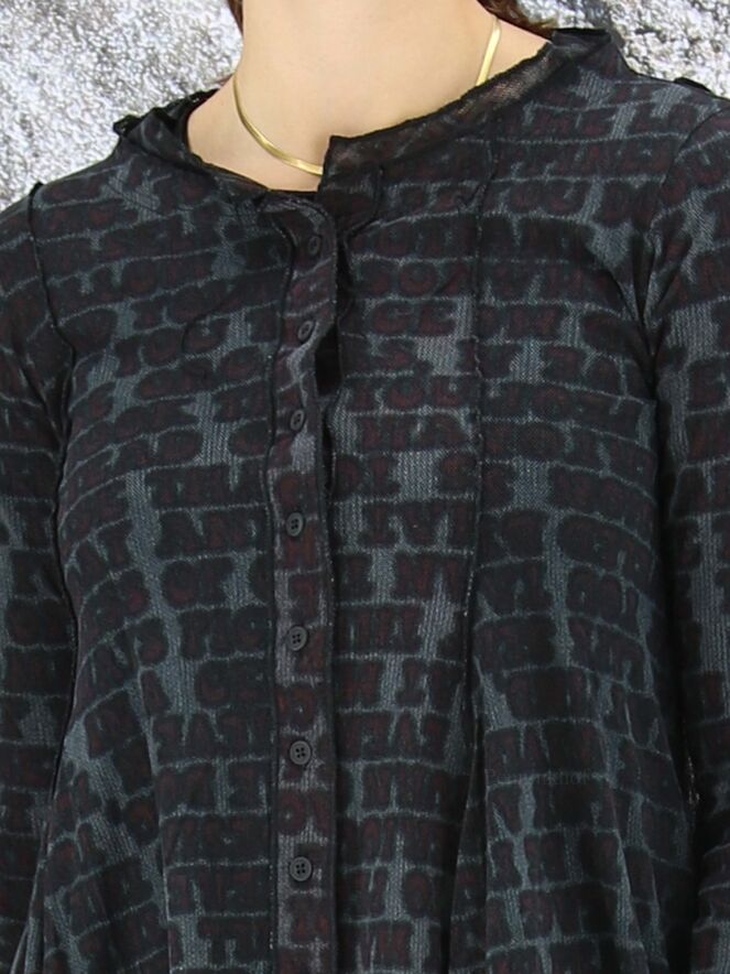 Ein transparenter Cardigan der Designermarke Rundholz Black Label mit Buchstabenprint in Weinrot, Schwarz und Grau. Das Shirt hat lange Ärmel und einen Rundhalsausschnitt mit doppeltem Stoffbesatz. Dieser Cardigan kommt mit einer A-Linie und kann bei 30 Grad gewaschen werden.