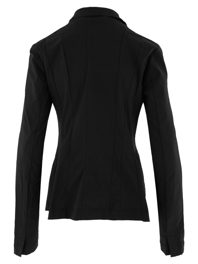 Ein Blazer von Rundholz Black Label in Schwarz. Der Blazer hat einen versteckten Verschluss mit 5 Knöpfen und ist ungefüttert. Mehrere Nähte von den Schultern betonen eine leichte Taillenlinie. Die langen Ärmel haben die gleichen dekorativen Nähte. Dieser Blazer kann bei 30 Grad gewaschen werden.