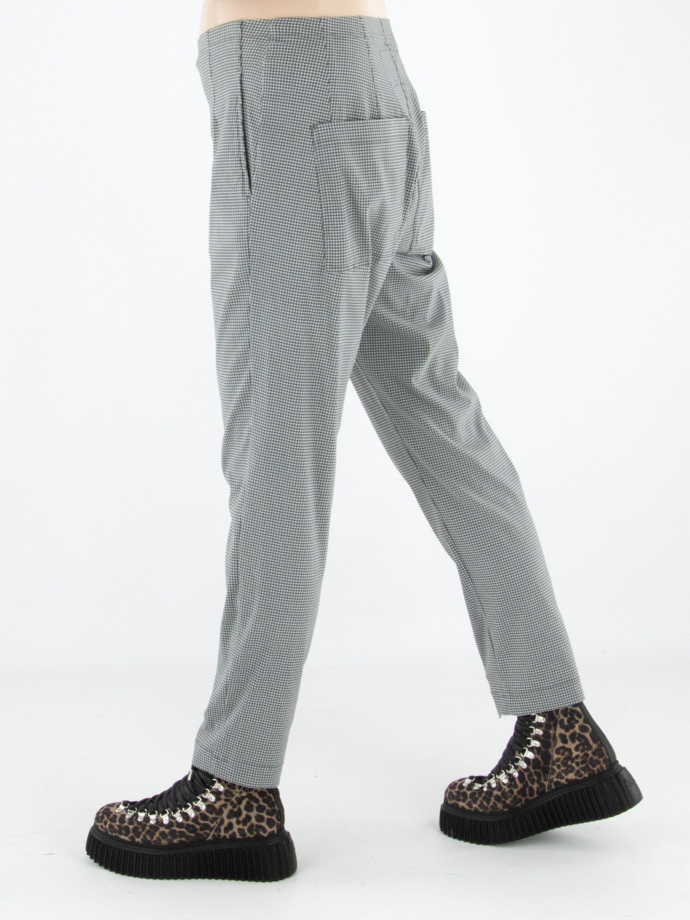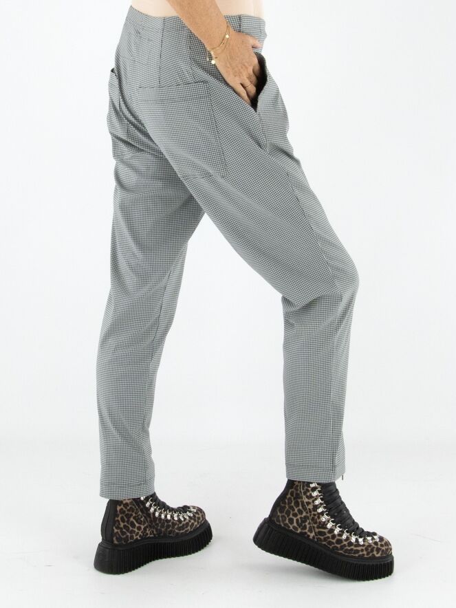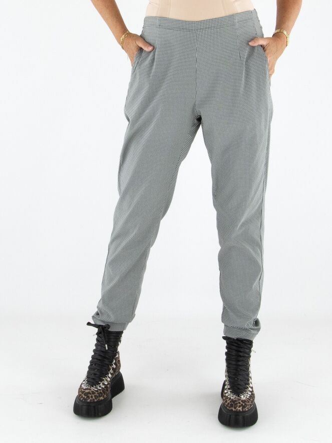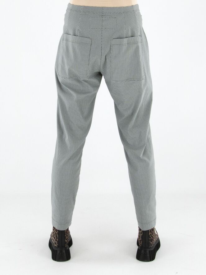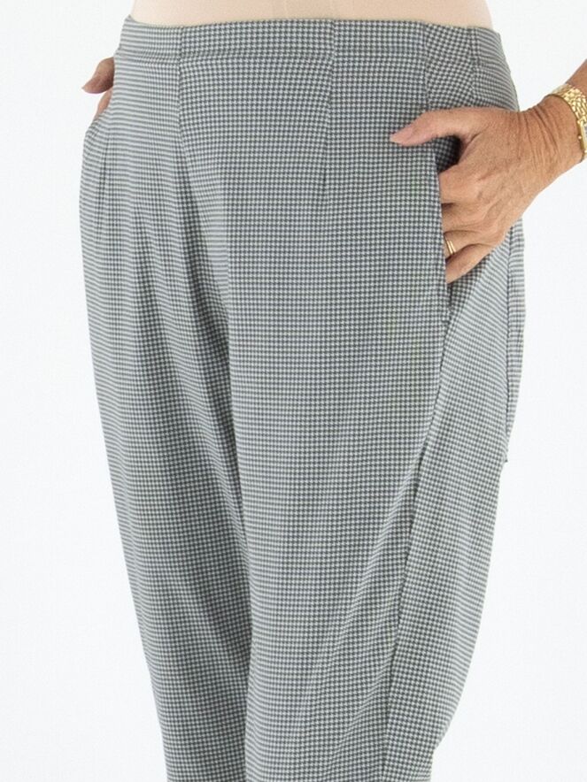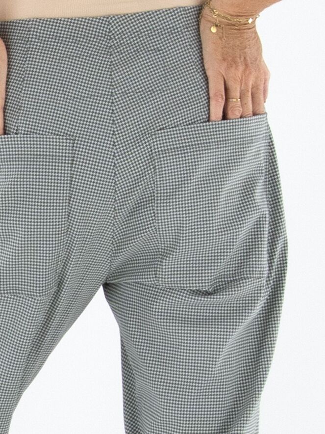 Eine Hose von Rundholz Black Label in einem Pied-de-Coq-Muster in Grau- und Cremeweiß-Tönen. Der Bund ist elastisch und bietet angenehmen Tragekomfort. Die Hose verfügt über praktische Eingrifftaschen und kann bei 30 Grad gewaschen werden.