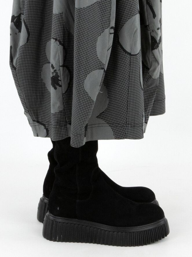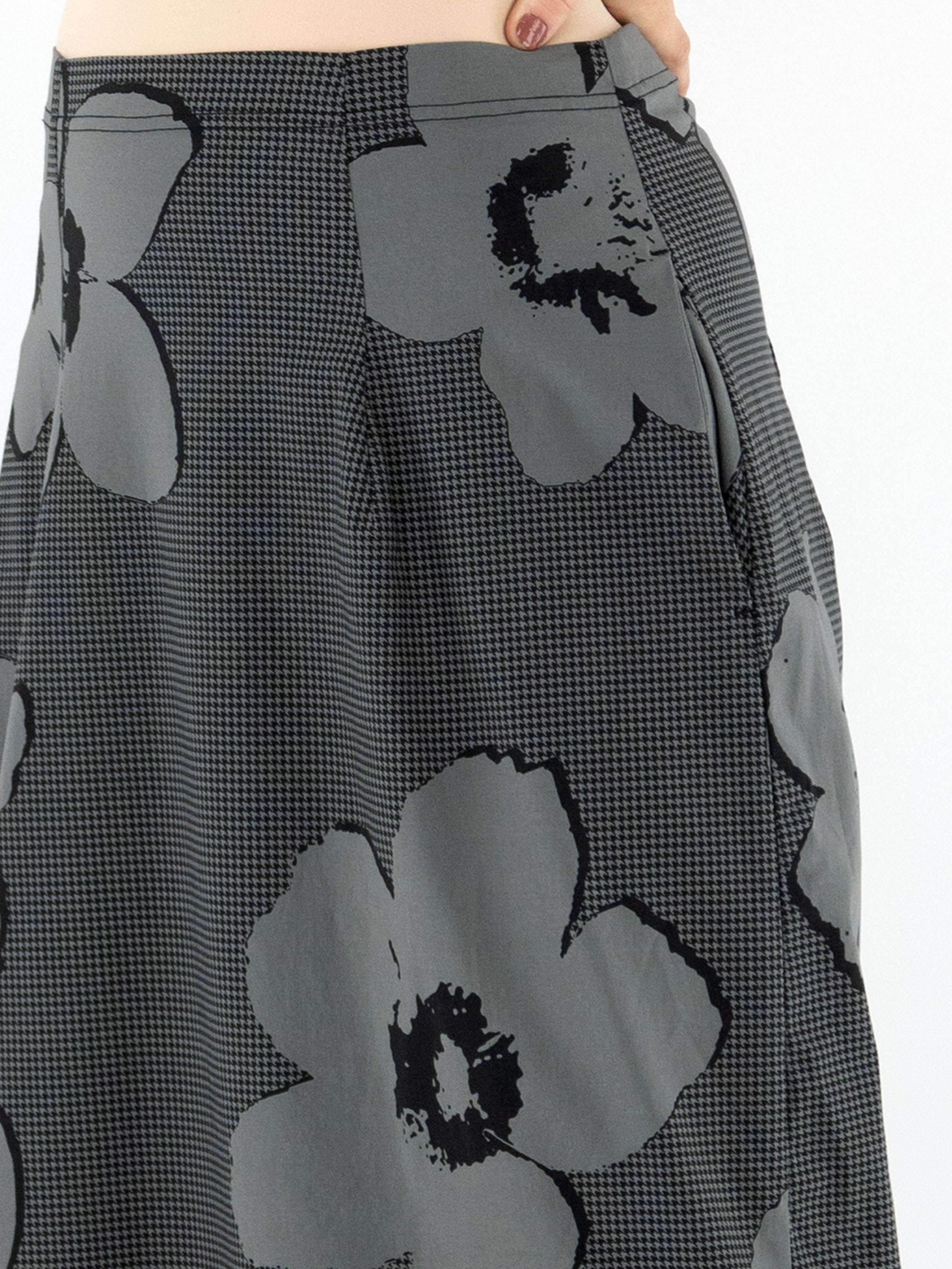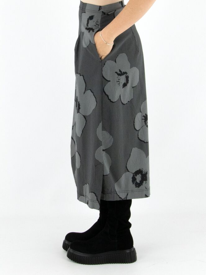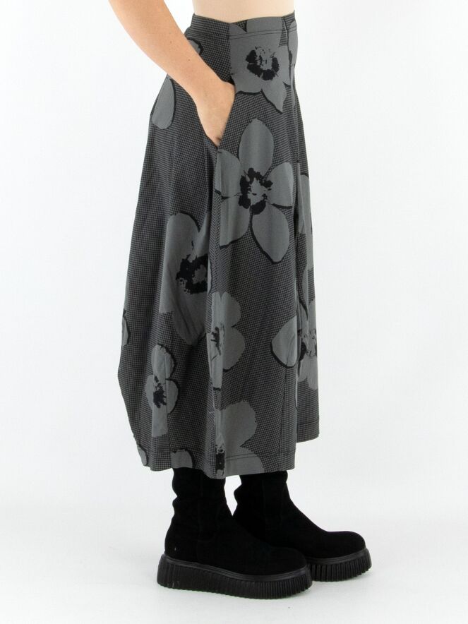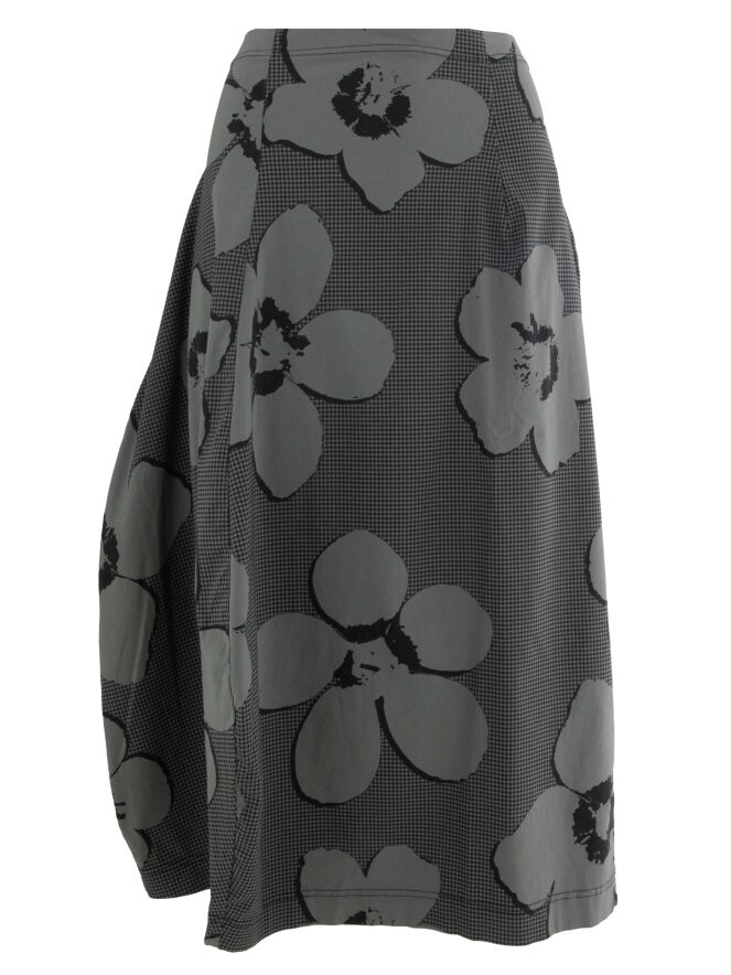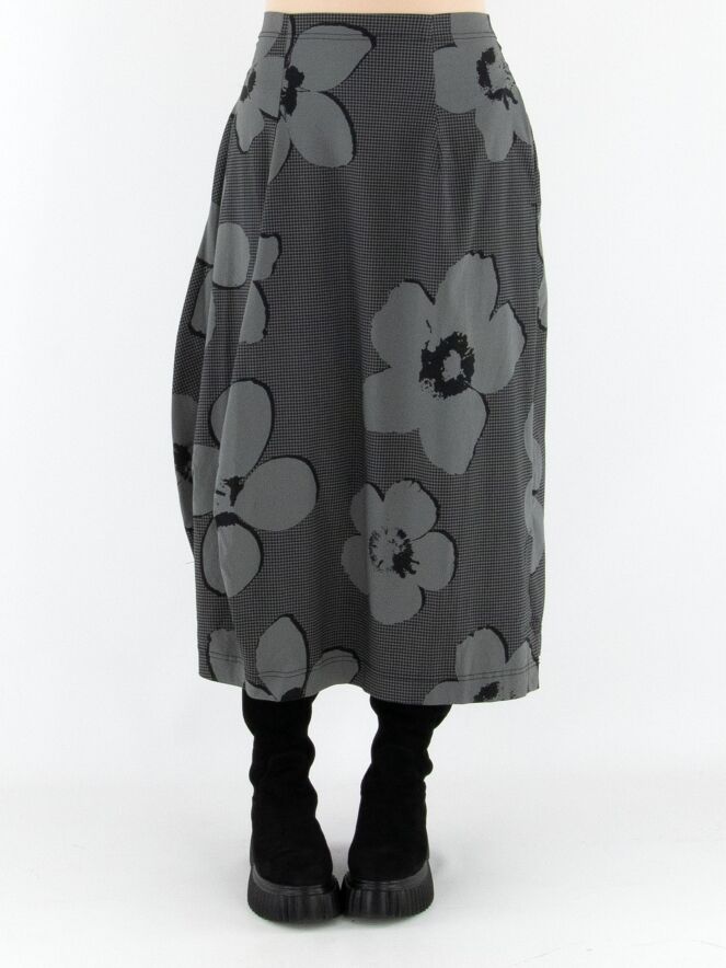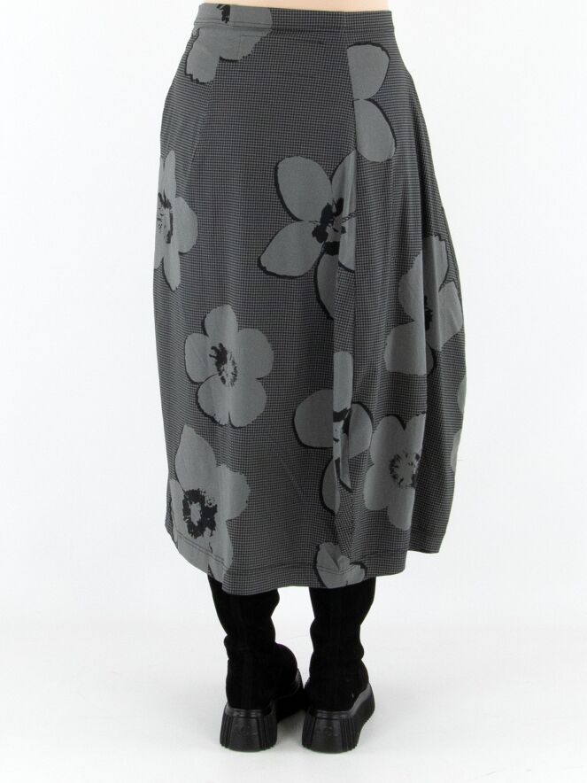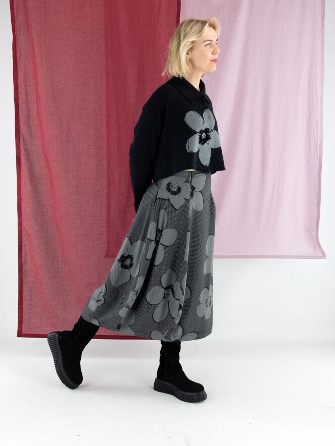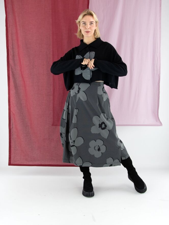 Ein Rock von Rundholz Black Label in einem Pied-de-Coq-Muster, überlagert mit großen Blumen in Grau- und Schwarztönen. Der Bund ist elastisch und direkt darunter sind praktische Eingrifftaschen eingearbeitet. Der Rock hat eine ballonartige Form, die für eine avantgardistische Ausstrahlung sorgt. Dieser Rock kann bei 30 Grad gewaschen werden.