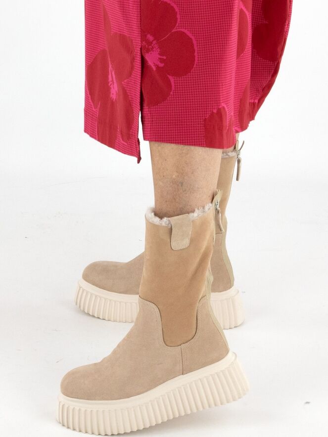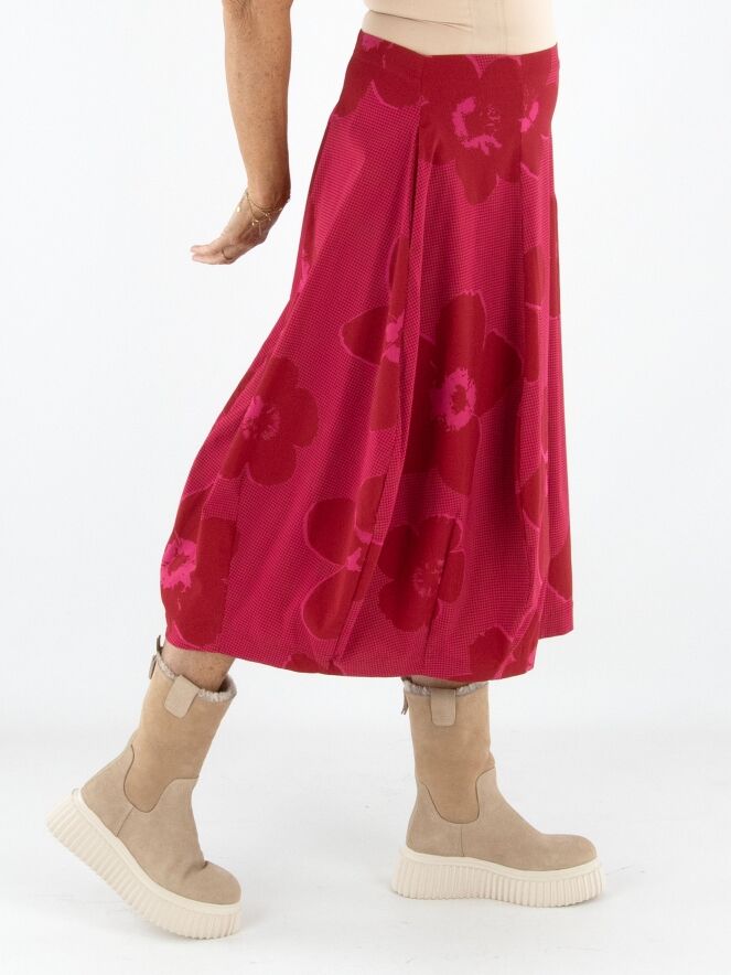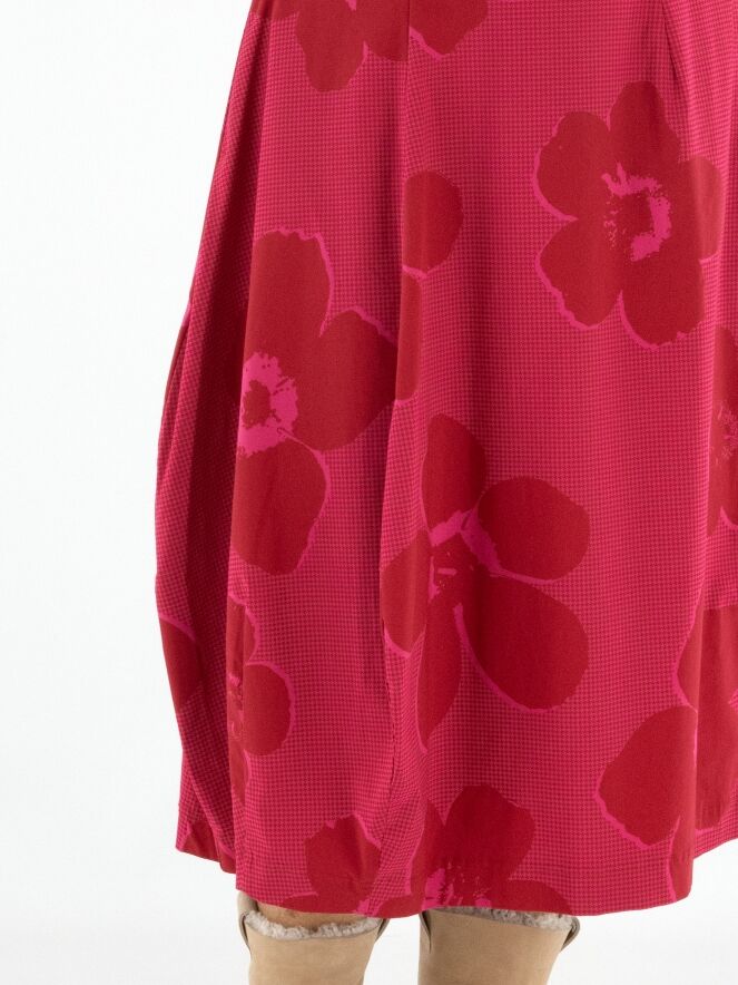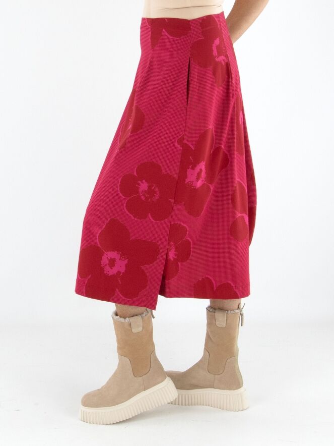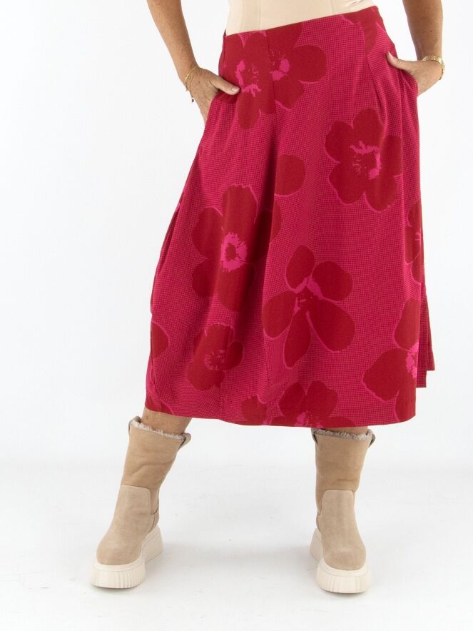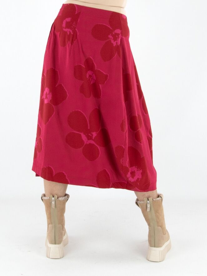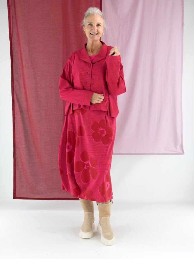Ein Rock von Rundholz Black Label mit einem Pied-de-Coq-Muster, das mit großen Blumen in Rot und Pink überlagert ist. Der elastische Taillenbund sorgt für angenehmen Tragekomfort. Direkt unter dem Bund befinden sich praktische Eingrifftaschen. Der Rock hat eine moderne Ballonform und kann bei 30 Grad gewaschen werden.
