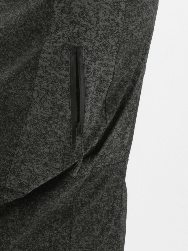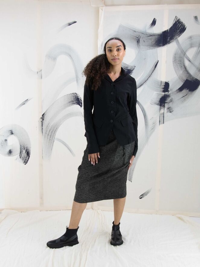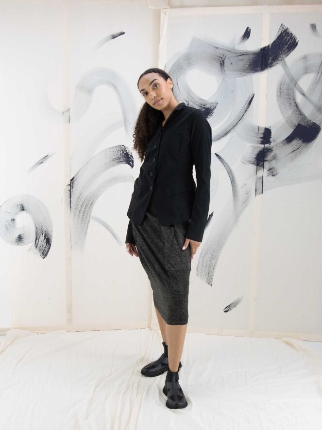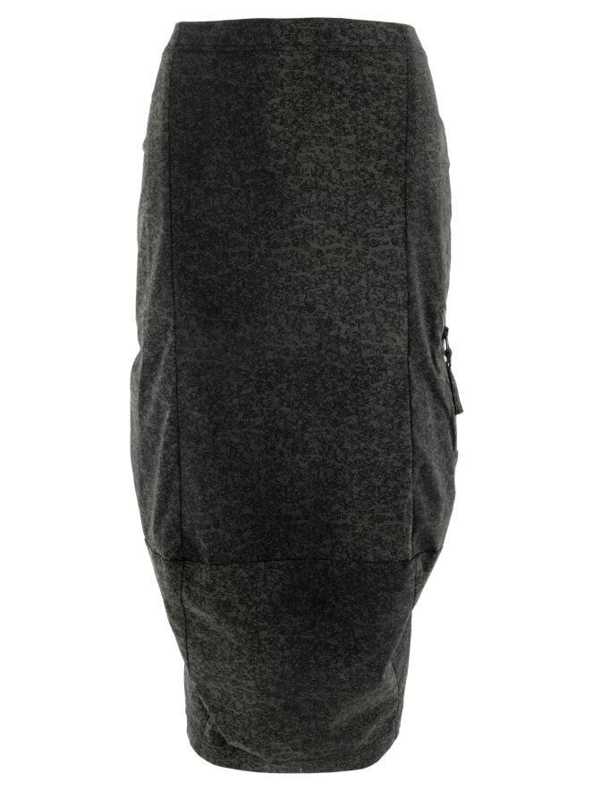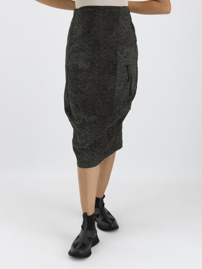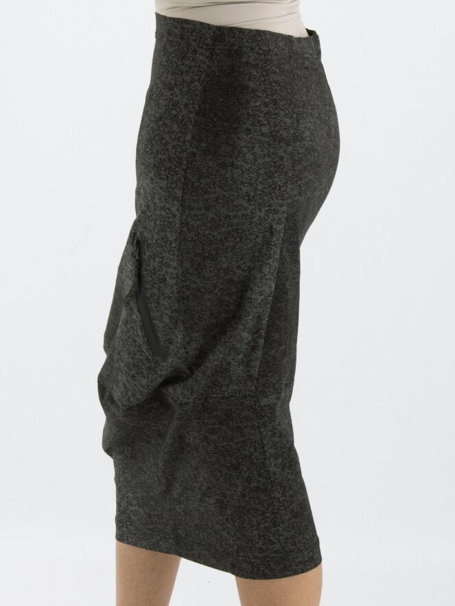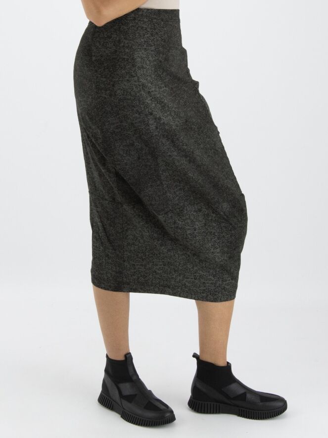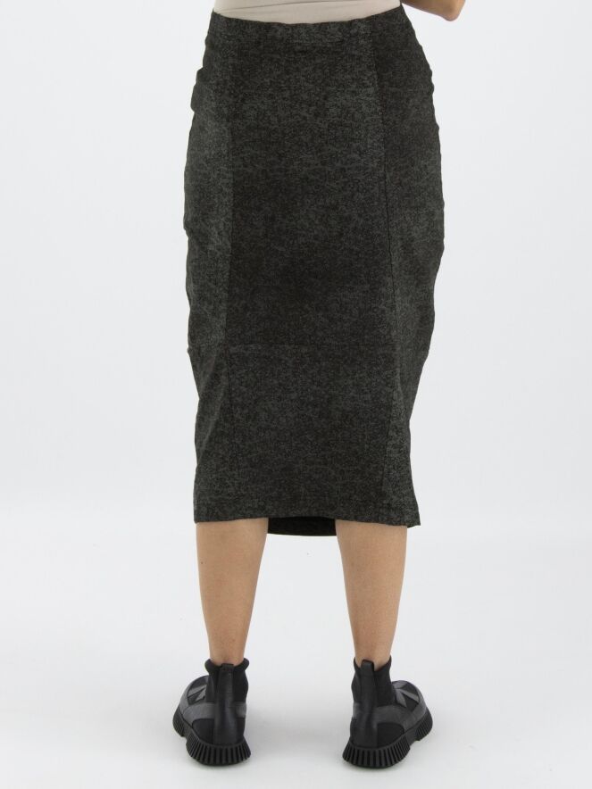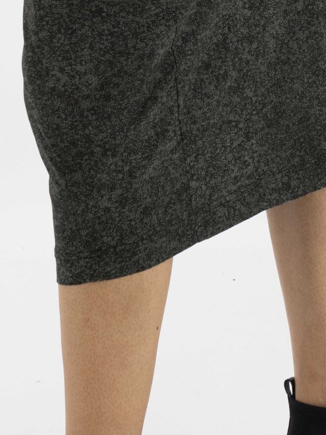 Ein Rock von Rundholz Black Label mit einem grafischen Muster in Schwarz und Olivgrün. In der Taille befindet sich ein Gummiband. Ab dem Knie verjüngt sich der Rock leicht. Dieser Rock kann bei 30 Grad gewaschen werden.