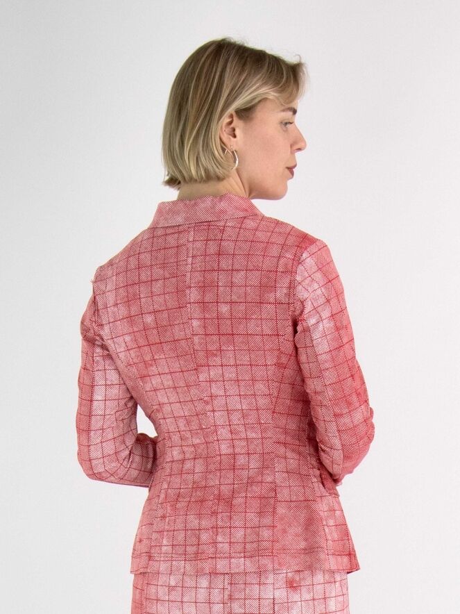 Ein Blazer von Rundholz Black Label in einem vielfältigen grafischen Karomuster mit den Farben Rot und Weiß. Der Blazer hat einen Verschluss mit 5 Knöpfen und ist ungefüttert. Dieser Blazer kann bei 30 Grad gewaschen werden.