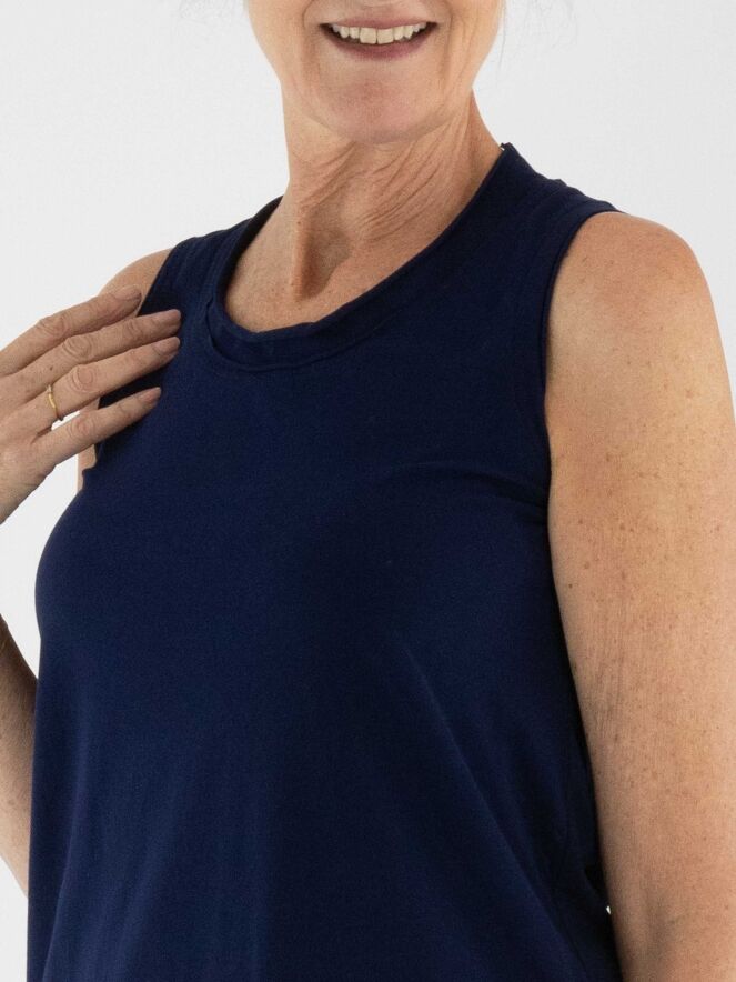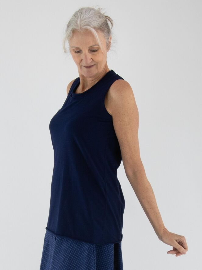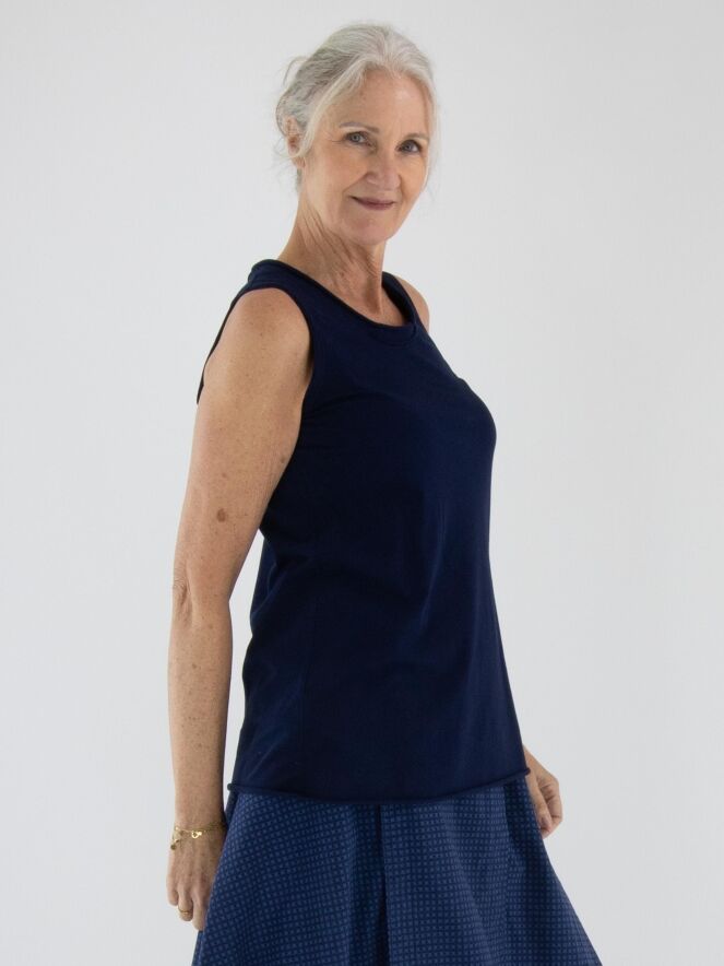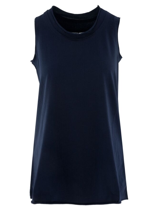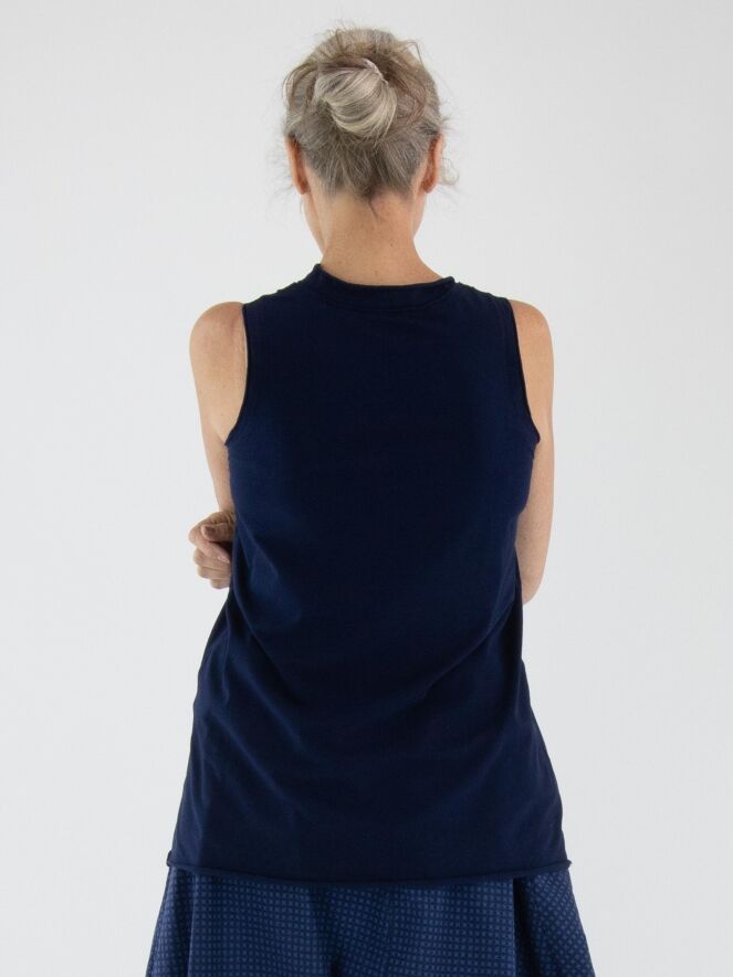 Ein Top von Rundholz Black Label in Marineblau. Entlang des runden Ausschnitts und der Armausschnitte verläuft eine leicht transparente Biese mit gerafftem Effekt. Auch am unteren Saum ist der Stoff gerafft. Dieses Top kann bei 30 Grad gewaschen werden.