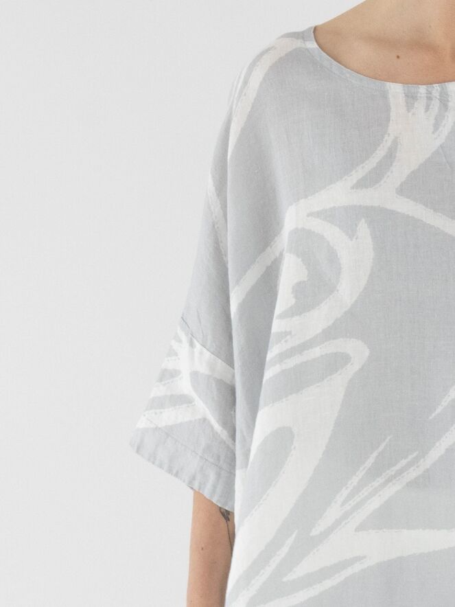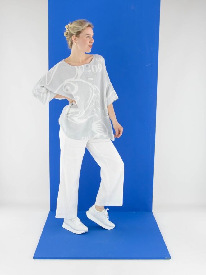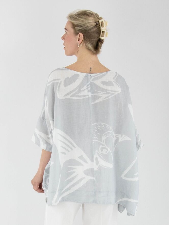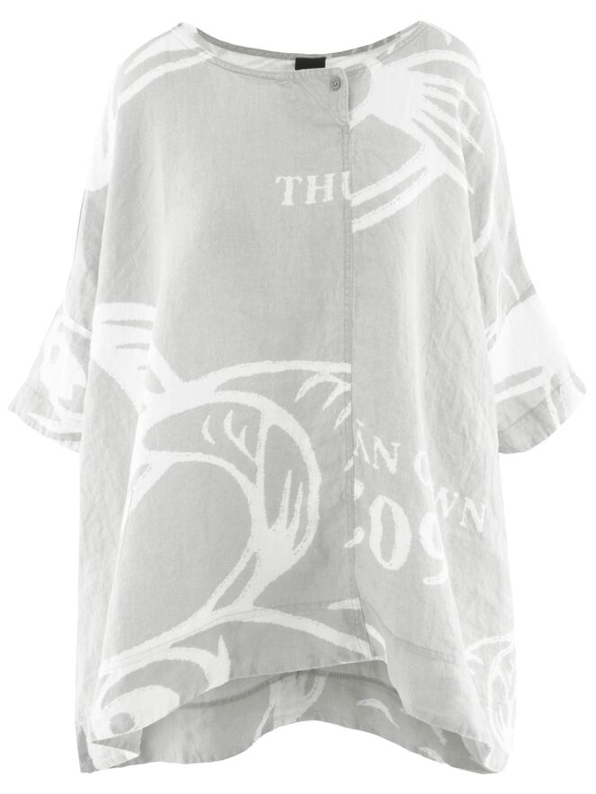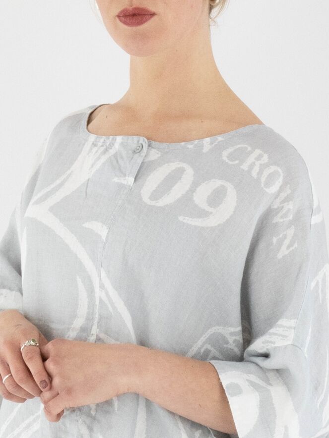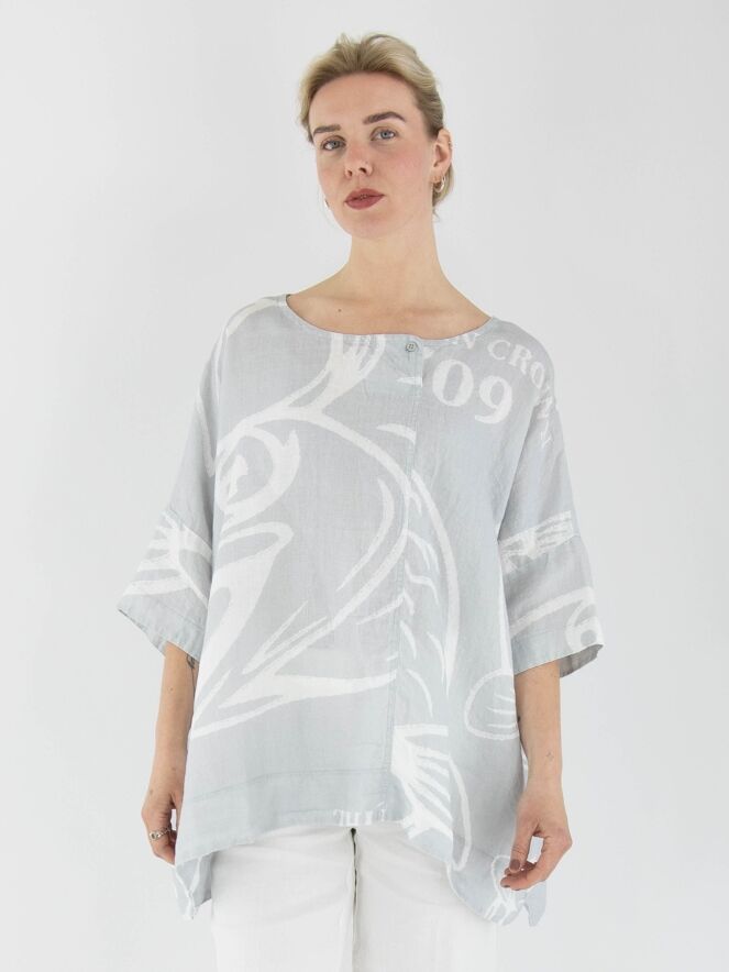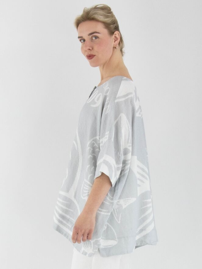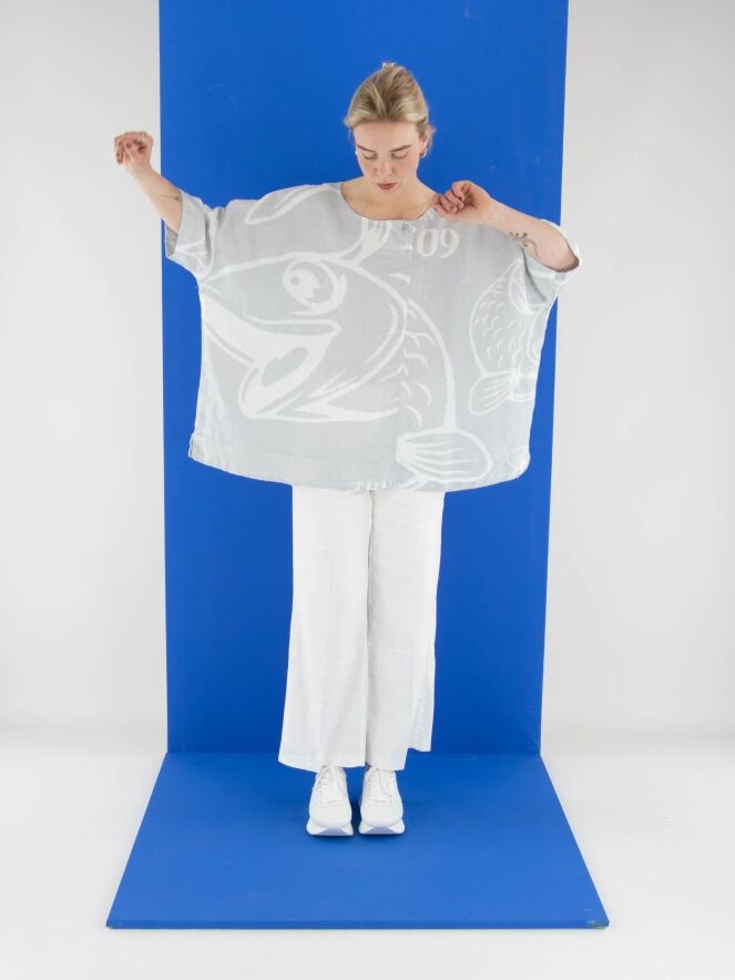 Ein weit geschnittenes Shirt von Rundholz Black Label mit einem Muster aus Fischen und Buchstaben in Hellgrau und Weiß. Links von der Mitte verläuft eine Naht von dem runden Halsausschnitt bis zur Brust, verziert mit einem dekorativen Knopf. Dieses Shirt kann bei 30 Grad gewaschen werden.