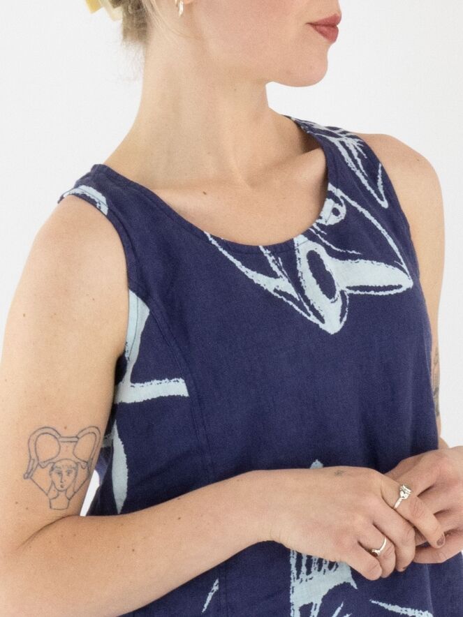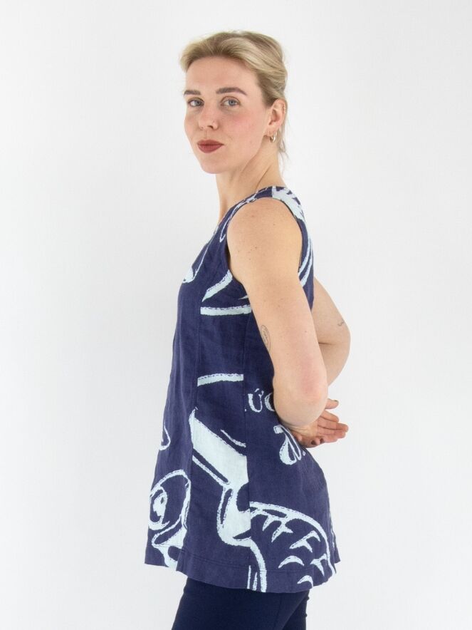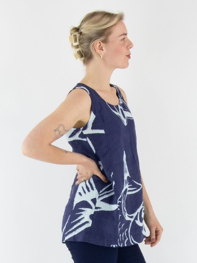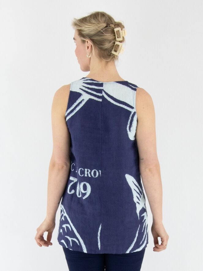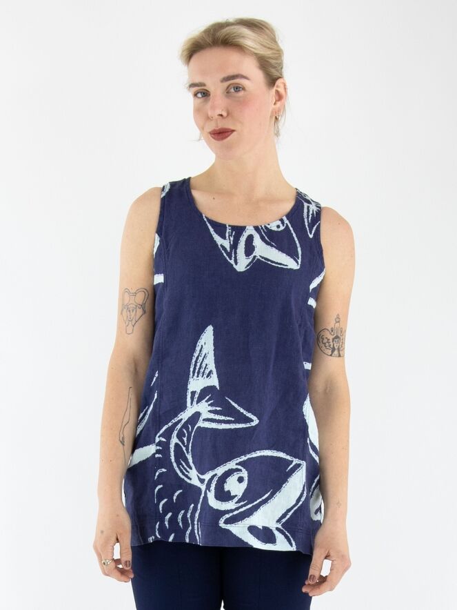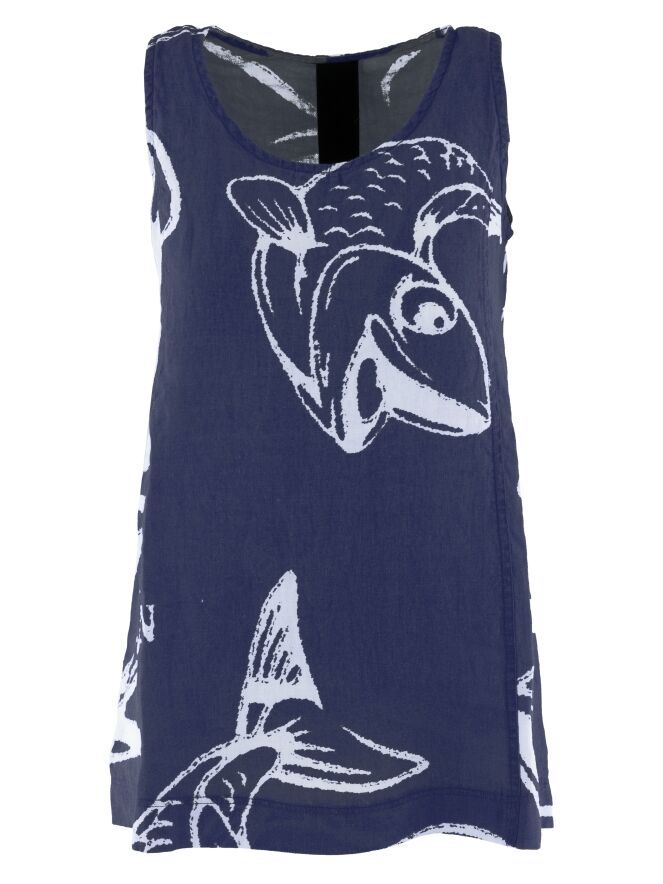 Ein Top von Rundholz Black Label mit einem Muster aus Fischen und Buchstaben in Marineblau und Weiß. Das Top hat einen runden Ausschnitt und eine A-Linie. Dieses Top kann bei 30 Grad gewaschen werden.