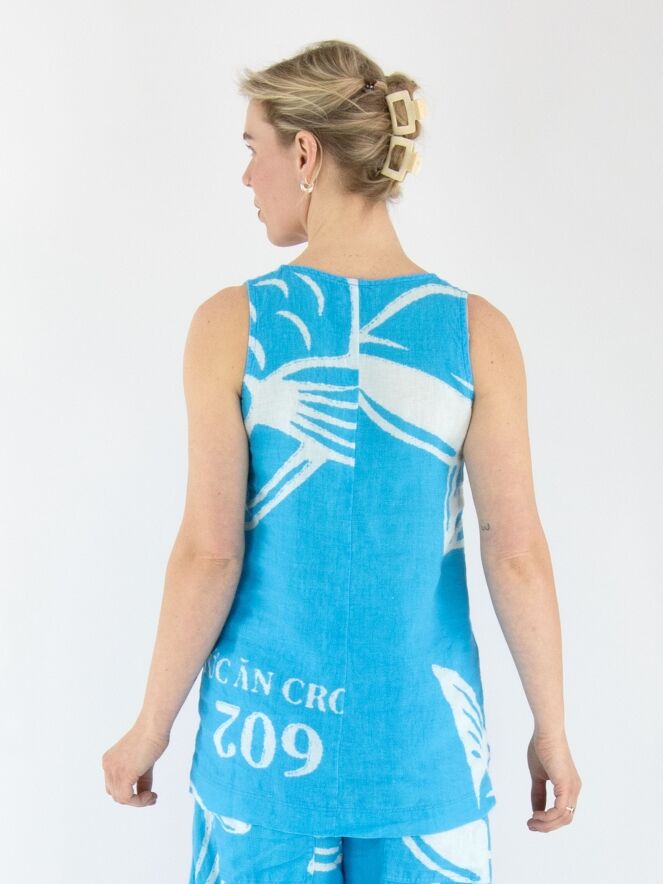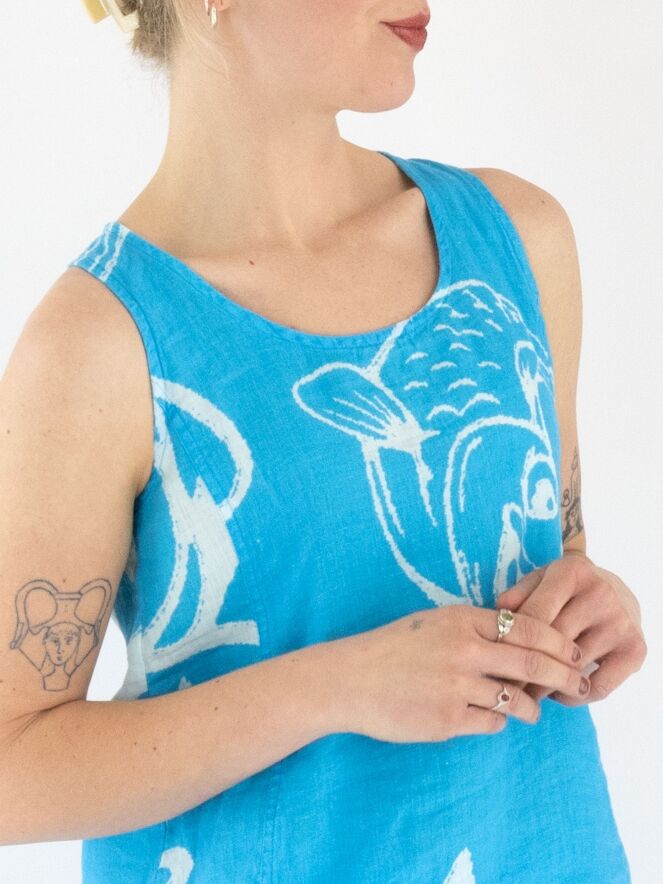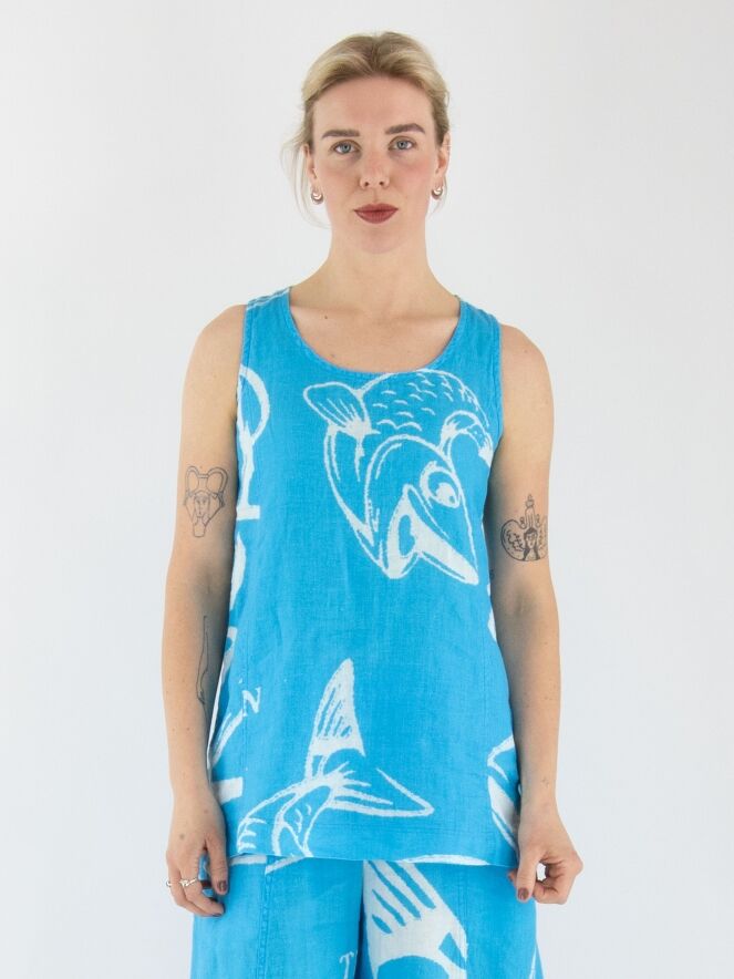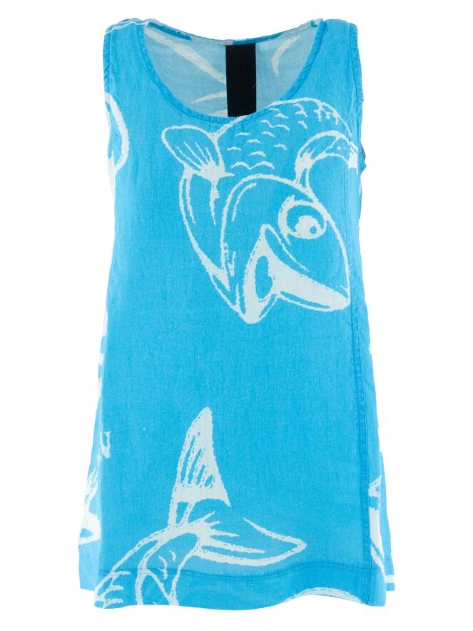 Ein Top von Rundholz Black Label mit einem Print aus Fischen und Buchstaben in leuchtendem Blau und Weiß. Das Top hat einen runden Ausschnitt und eine A-Linie. Dieses Top kann bei 30 Grad gewaschen werden.