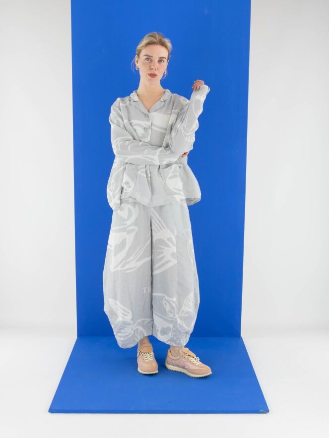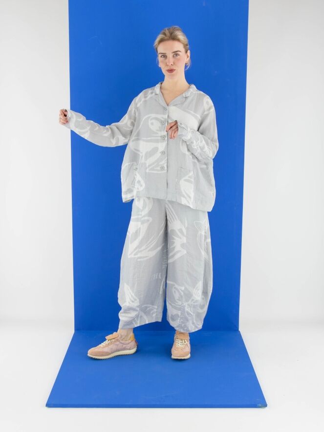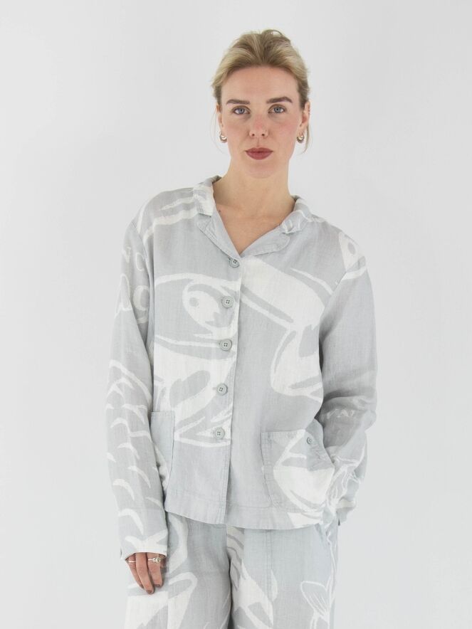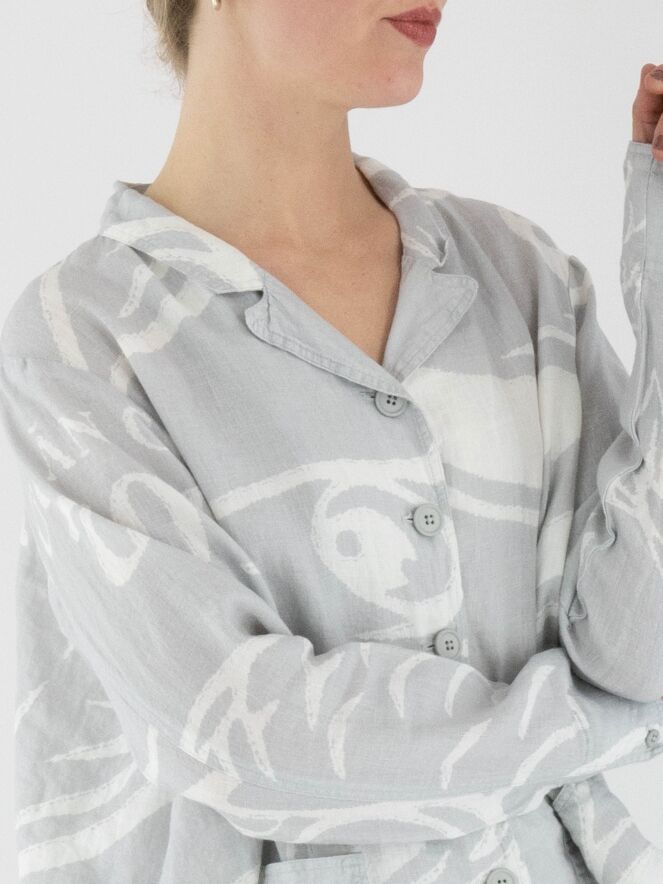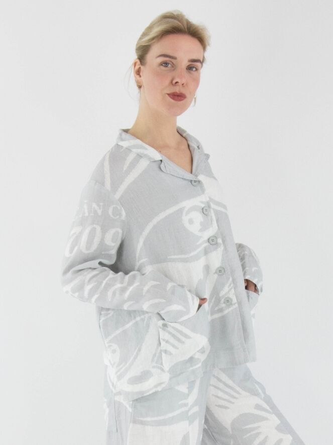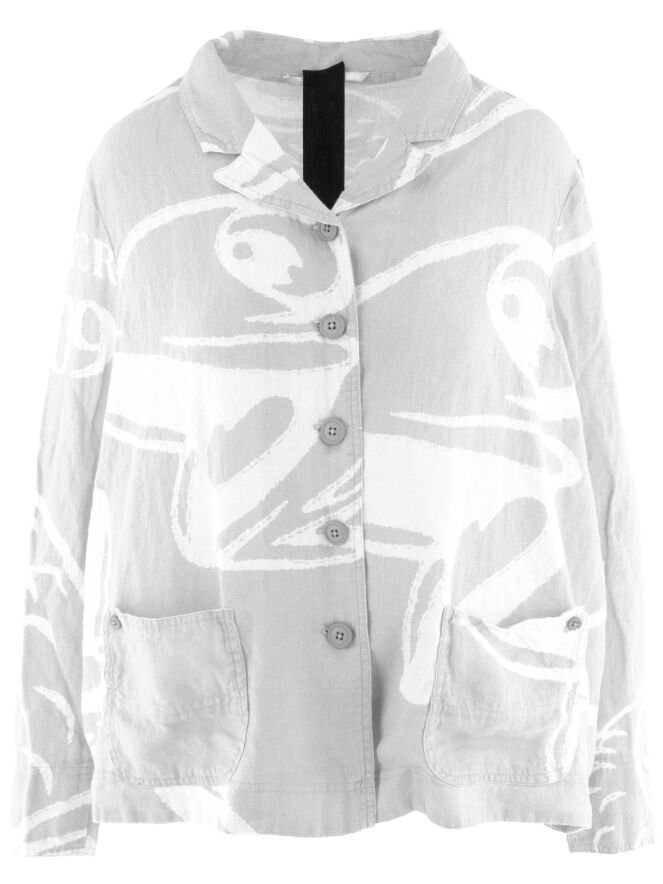 Ein weiter Blazer von Rundholz Black Label mit einem Muster aus Fischen und Buchstaben in Hellgrau und Weiß. Der Blazer hat eine Fünf-Knopf-Leiste und ist ungefüttert. Die Taschen auf der Vorderseite sind mit einem dekorativen Knopf an der Außenseite versehen. Dieser Blazer kann bei 30 Grad gewaschen werden.