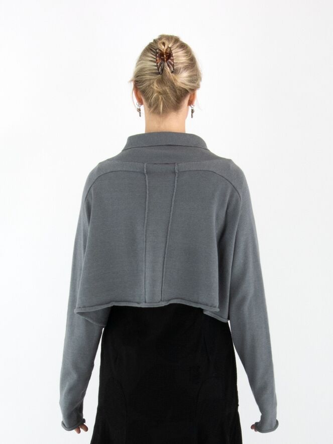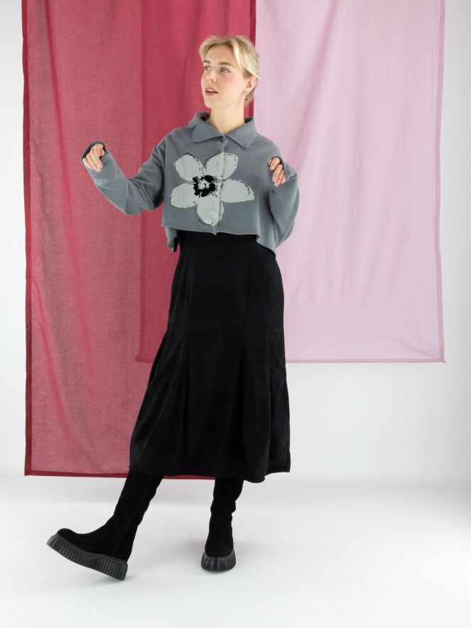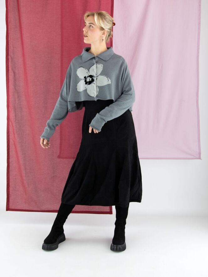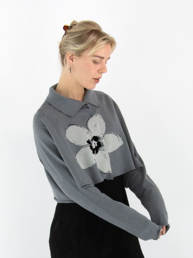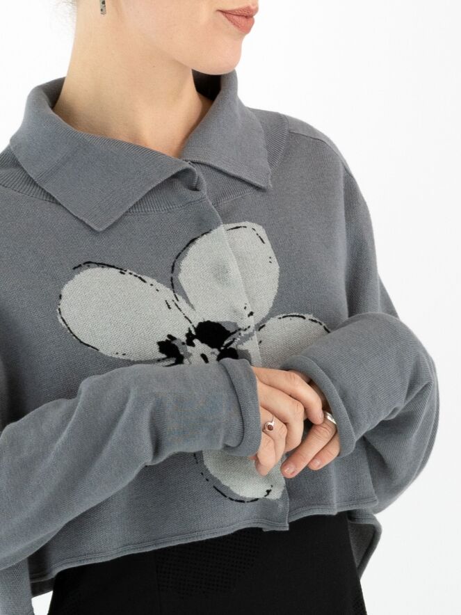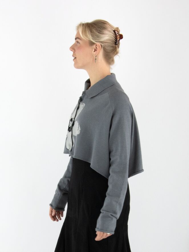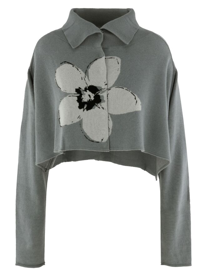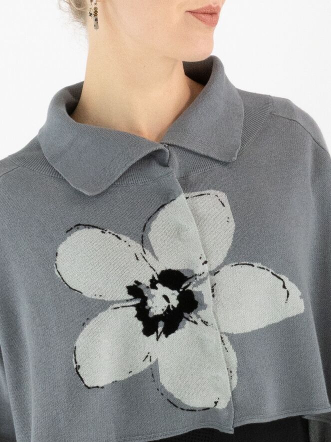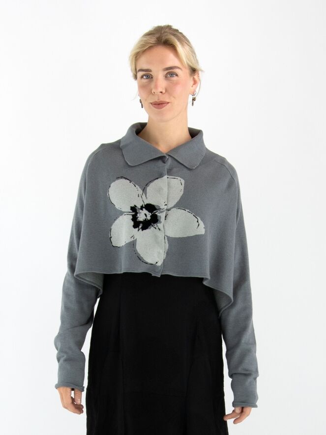 Kurze, weit geschnittene Strickjacke von Rundholz Black Label in Grau mit großem Blumenprint in Hellgrau und Schwarz auf der Vorderseite. Die Jacke wird mit Druckknöpfen geschlossen und hat einen Kragen aus fein gerippter Strickware. Diese Jacke darf nur von Hand gewaschen werden.