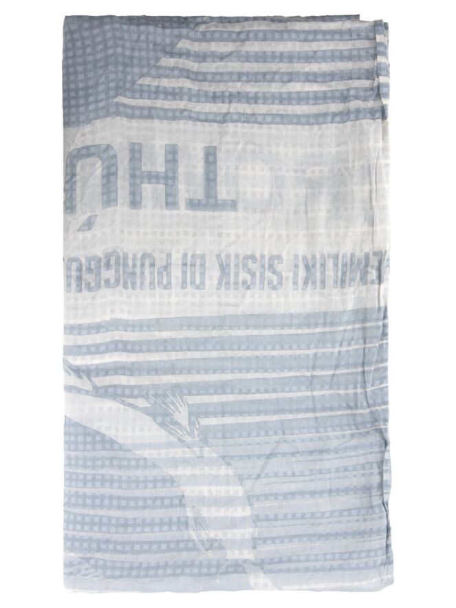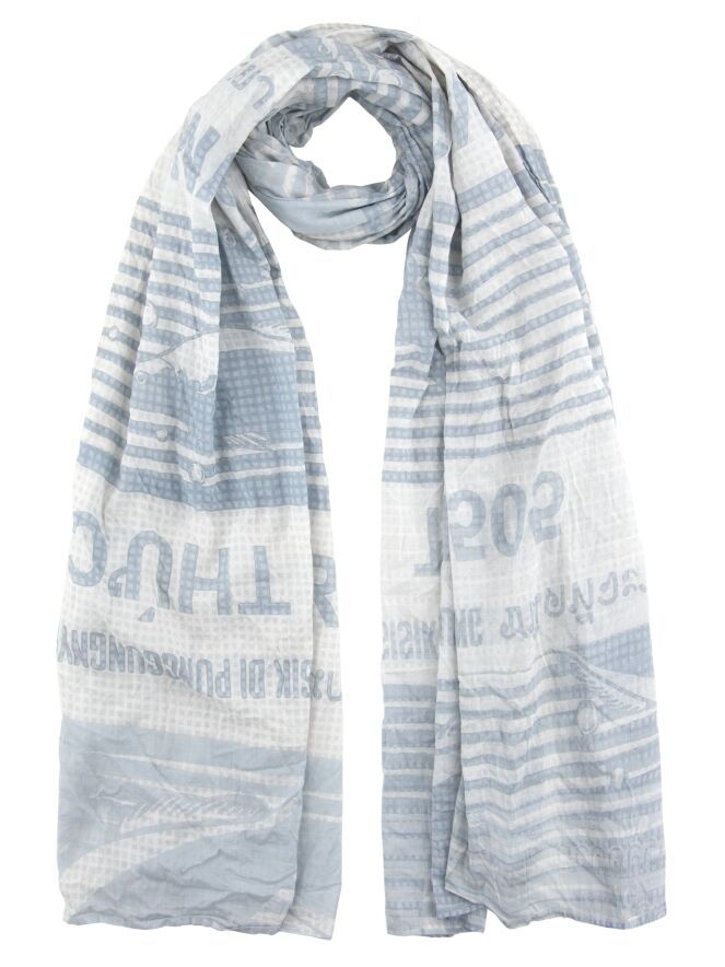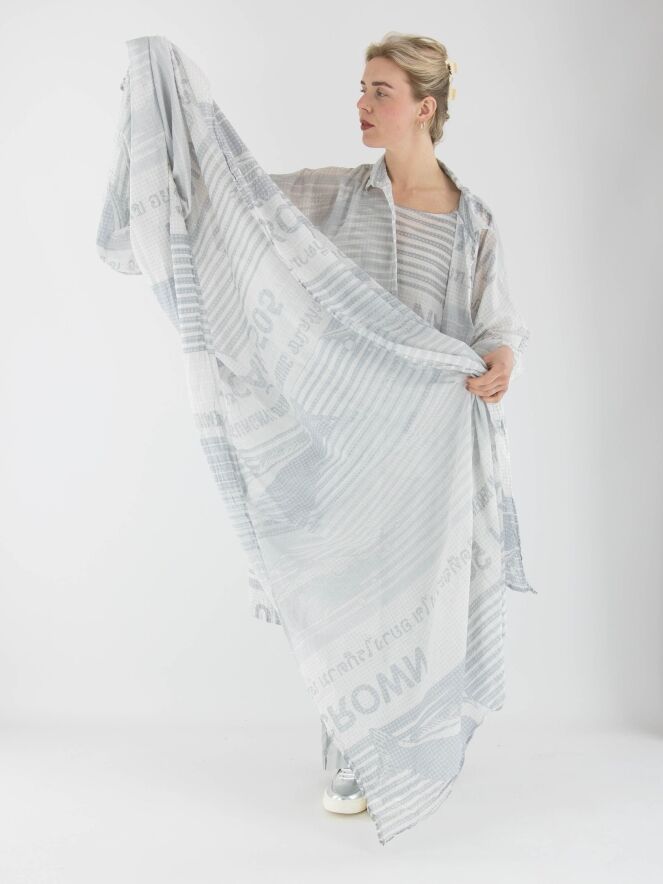 Ein leicht transparenter Schal von Rundholz Black Label mit einem Print aus Schriftzügen und Blockmuster. Der Print enthält verschiedene Grautöne in Kombination mit Weiß. Dieser Schal kann bei 30 Grad gewaschen werden.