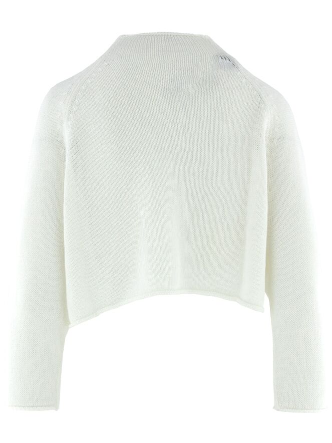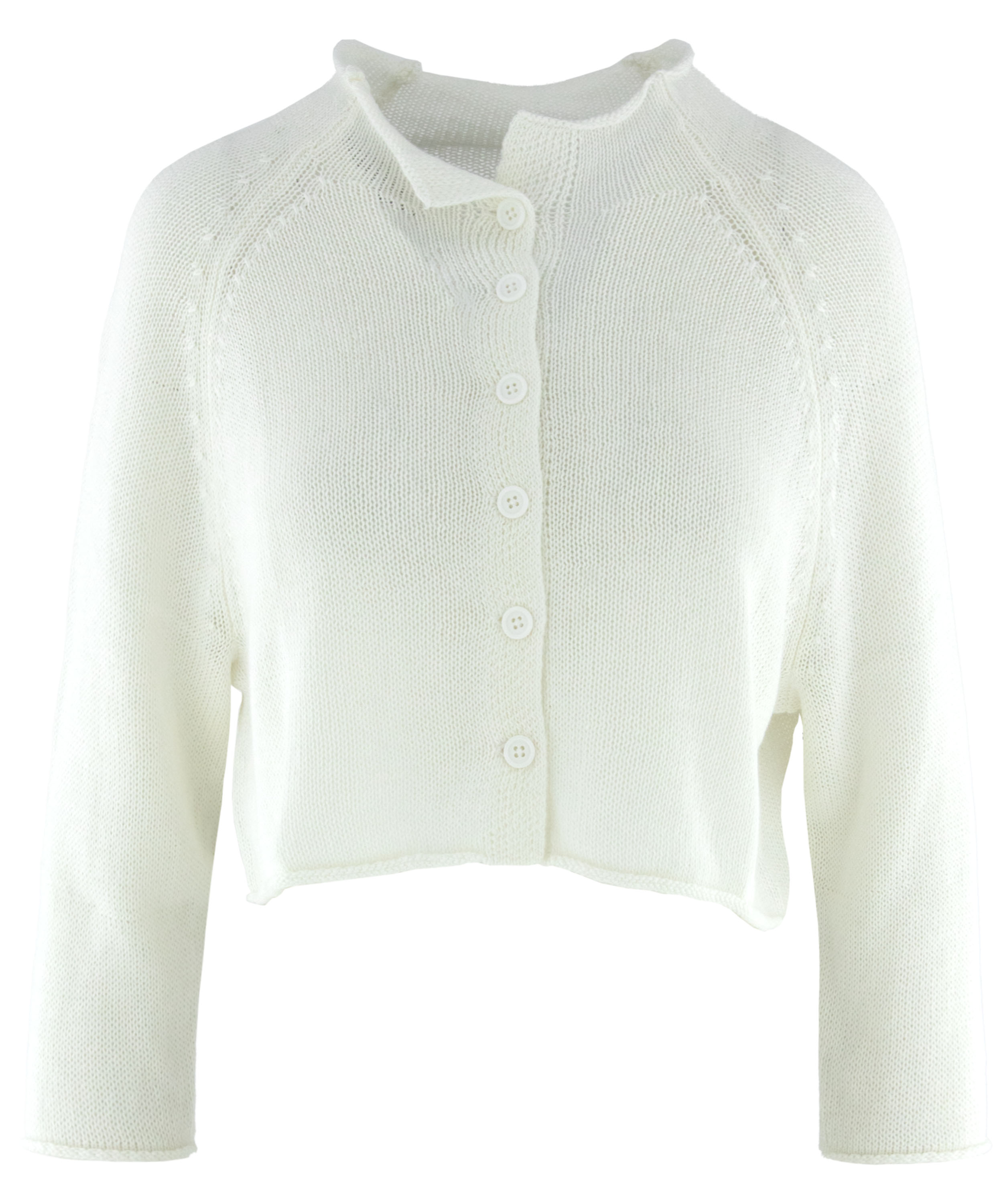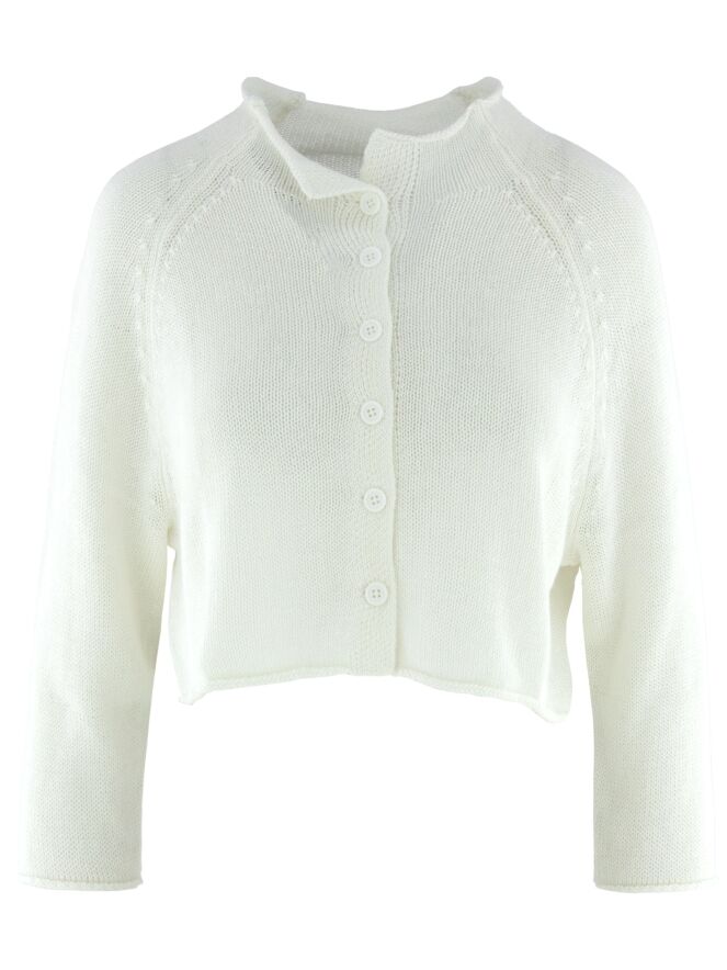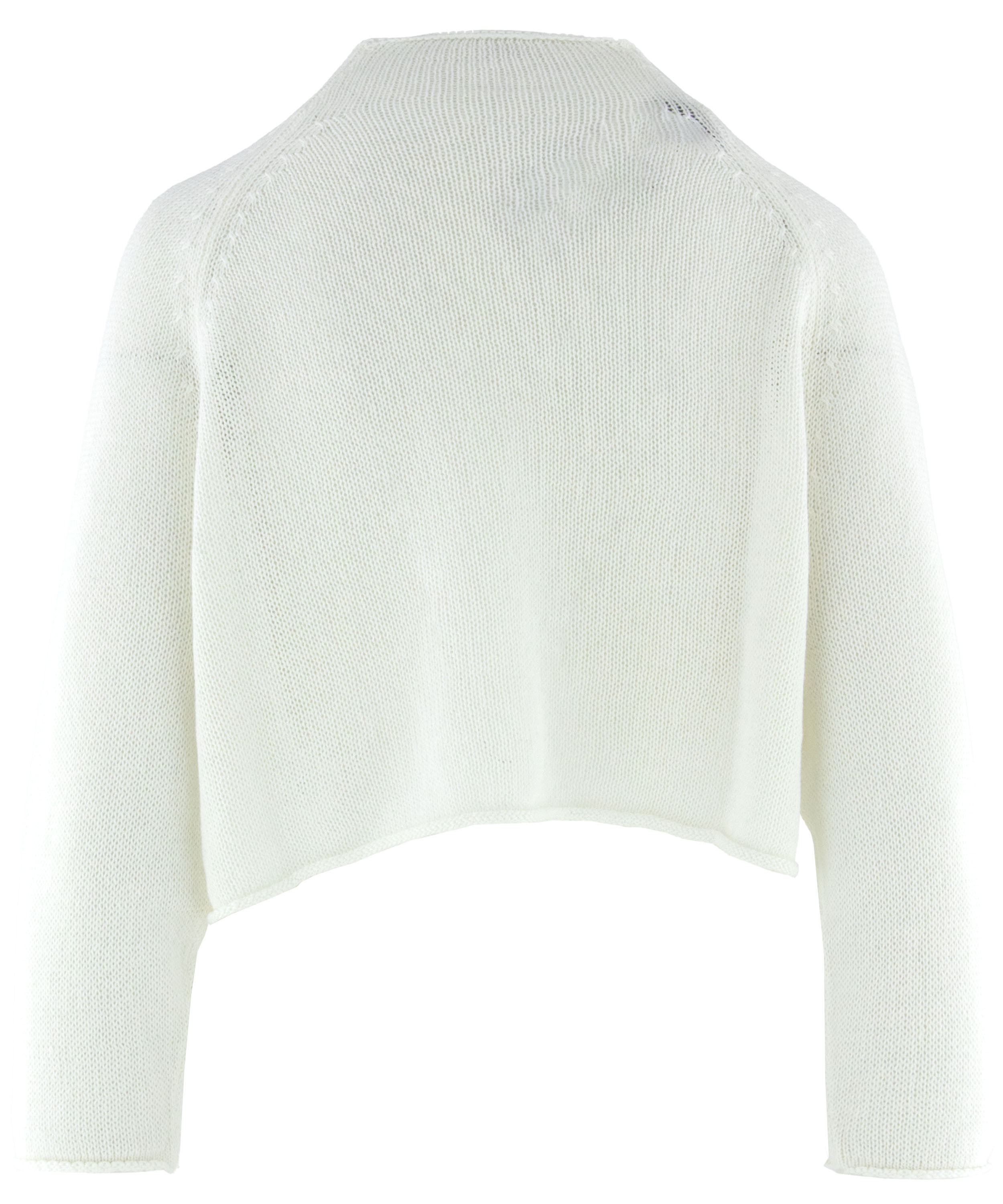 Kurze, weit geschnittene Strickjacke von Rundholz Black Label in Weiß. Das Modell ist offen gestrickt und verfügt über kurze Ärmel. Die Kanten sind leicht gerollt, was dem Design eine lässige und moderne Ausstrahlung verleiht. Sowohl offen als auch geschlossen eignet sich diese Strickjacke ideal zum Tragen über einem langen Kleid an einem sommerlichen Abend. Dieses Modell sollte per Hand gewaschen werden.