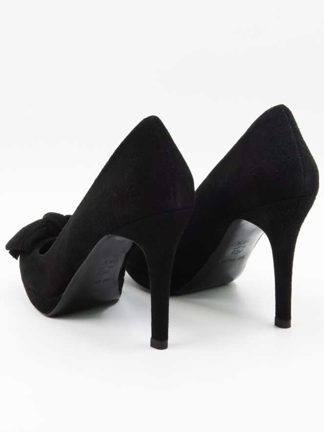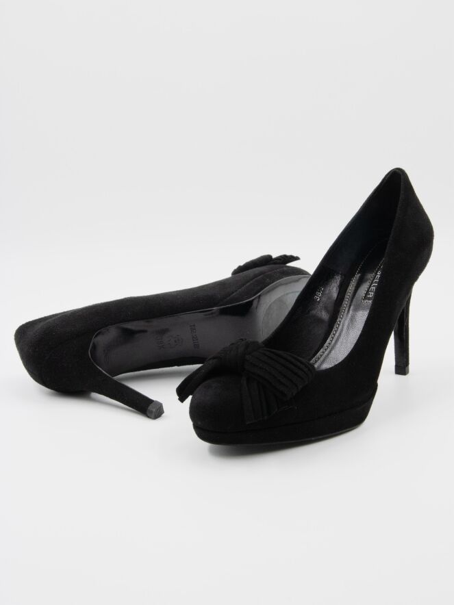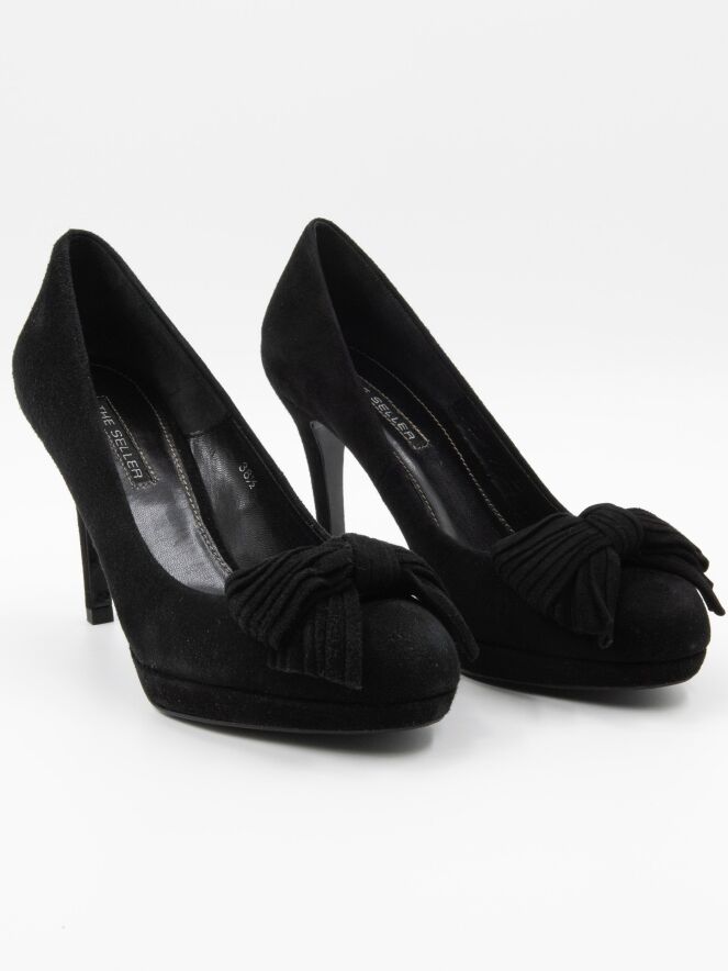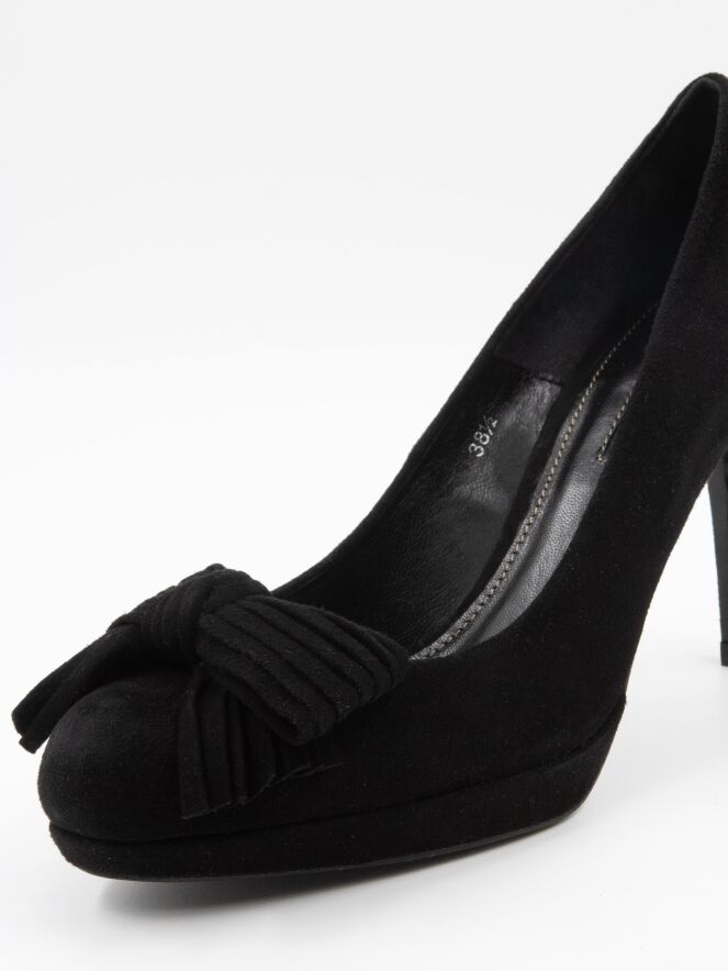 Ein Pump von Spazio Moda in Schwarz. Der Pump hat eine Plateausohle und eine dekorative Schleife auf dem Vorderfuß, die schichtweise aufgebaut ist. Der Pump hat eine runde Spitze, und der hohe Absatz ist mit demselben Wildleder wie der Pump selbst bezogen. Das Innere ist mit Leder gefüttert.